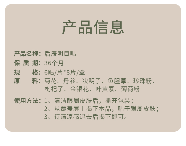 【品名】后辰明目贴 明星同款 缓解眼部 48贴/盒 【规格】6贴/片*8片/盒 【产地】国内 【保质期】36个月 【发货包装】独立包装袋 【发货地】河南 【发货快递】中通、圆通随机发 【补邮费地区】新疆、西藏+20元 内蒙古、宁夏、甘肃、青海、海南+15元 【发货时效】48-72小时,周末节假日顺延 |
