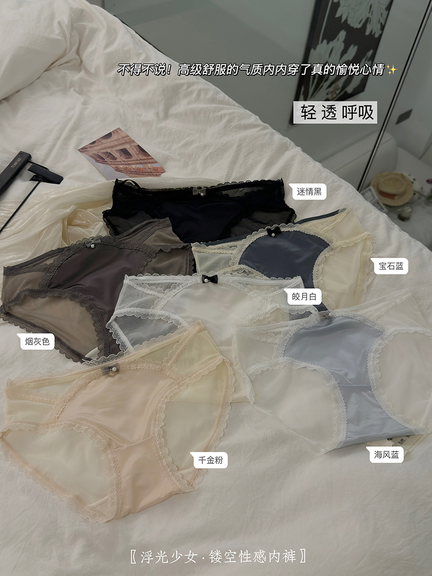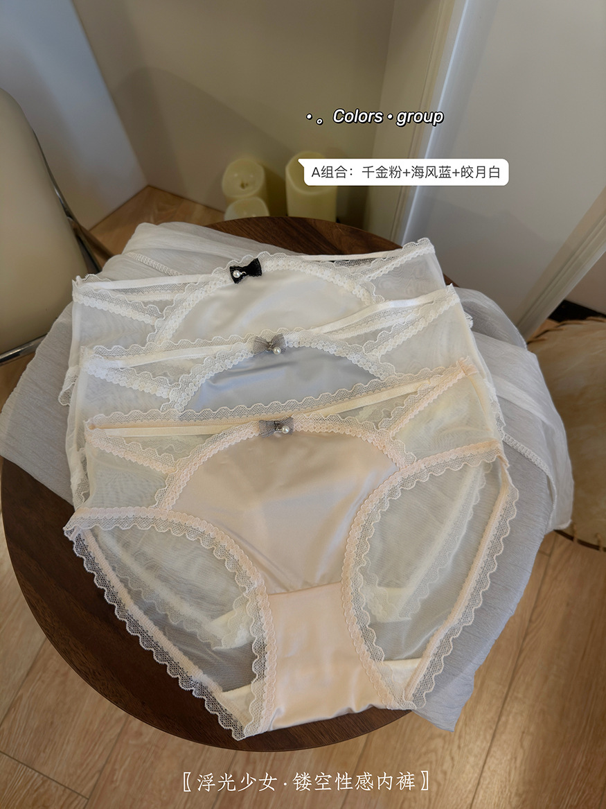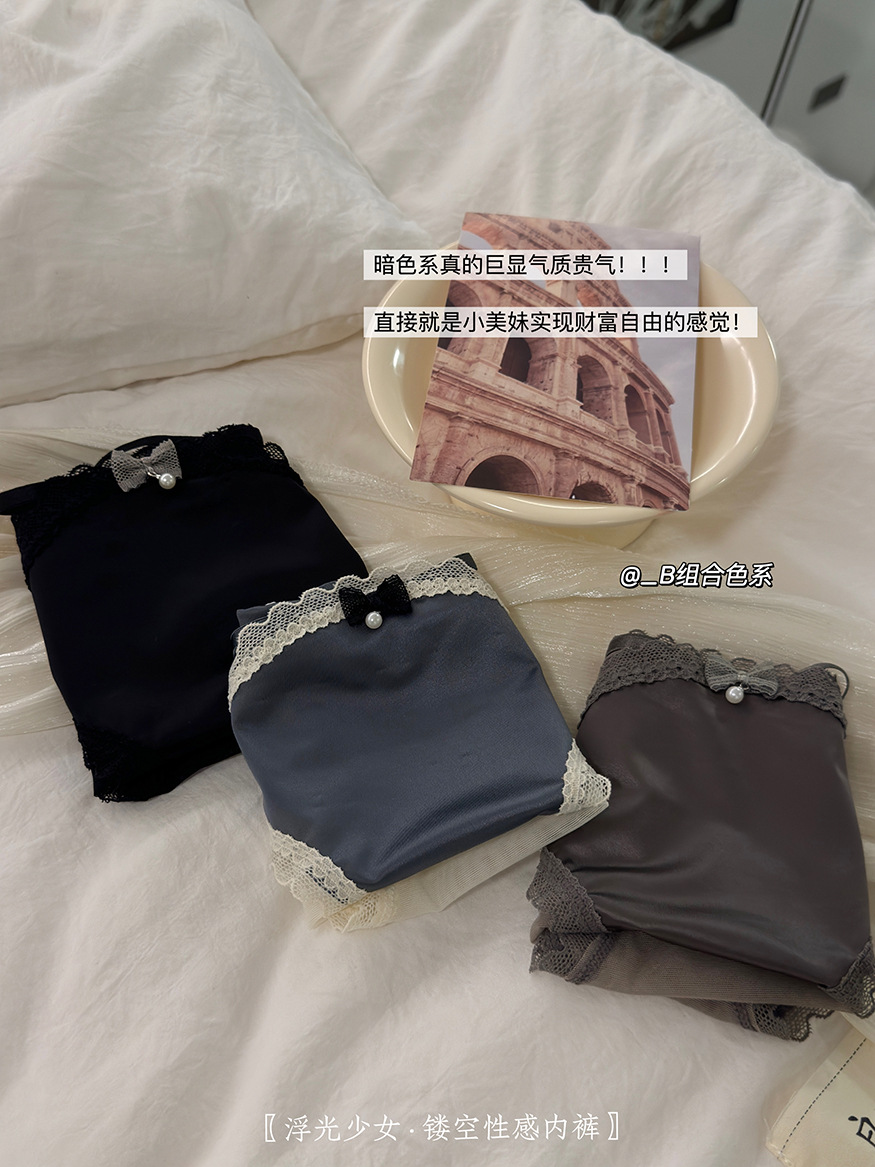 【3条装!浮光镂空性感内裤】半透网纱与绸缎拼接设计,每一秒都非常chill,这美感真的绝顶哇~法式纯欲女蕾丝边蝴蝶结夏季透气棉裆女士三角裤