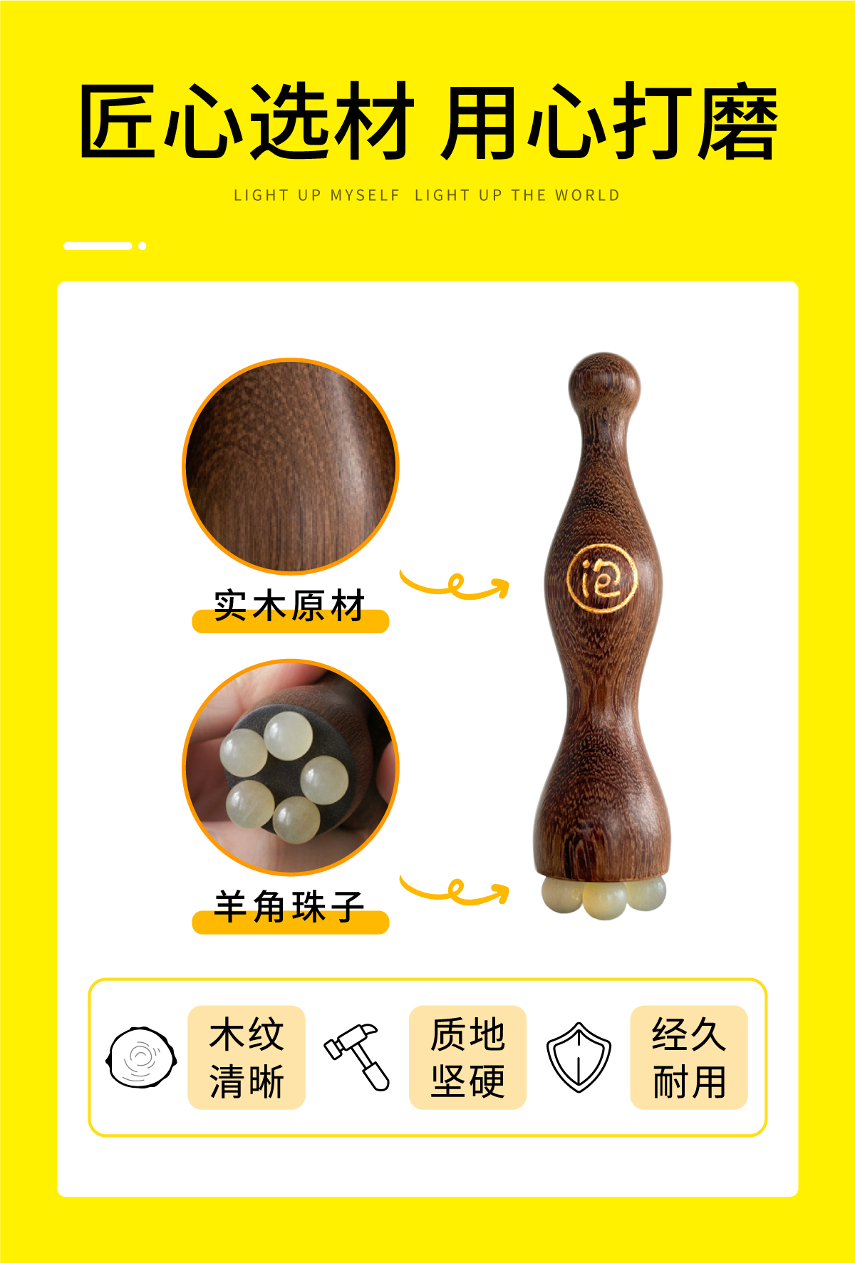 小莲蓬羊角梳用的是实木原材和羊角珠子,木纹清晰可见,质地坚硬扎实,打磨后触感更是顺滑,经久耐用,不易损坏,羊角珠子光滑细腻,触感温润亲肤,贴肤按摩超舒服,不会对肌肤造成刮擦。