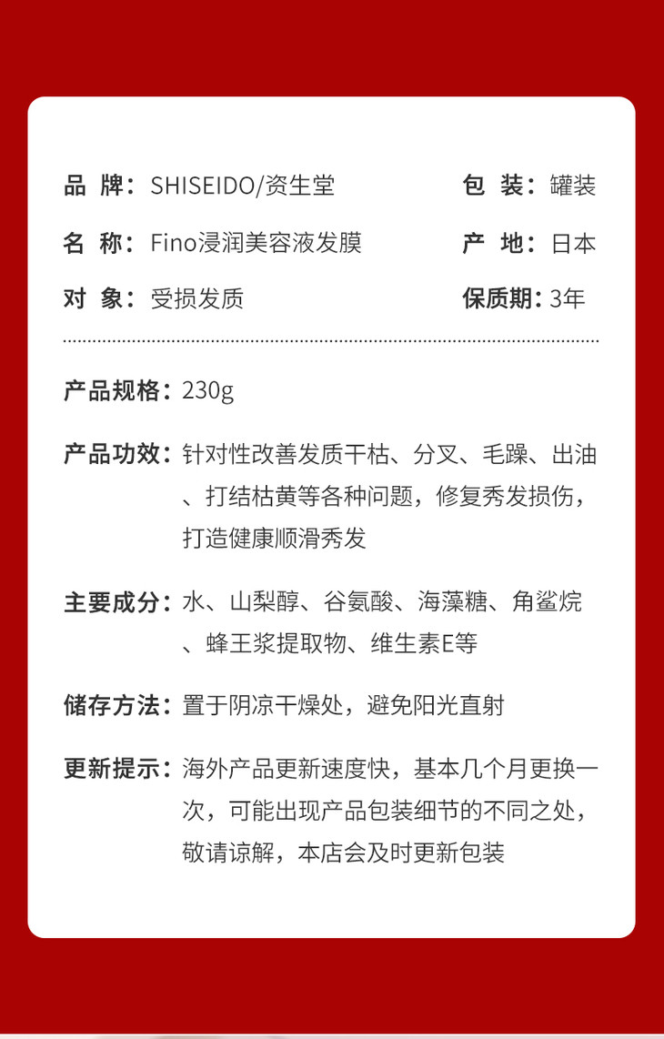 9楼母婴生活馆 资生堂fino发膜护发素修复干枯倒膜改善毛躁抓不住发膜免蒸 吊牌价:99元 活动价:59.9元