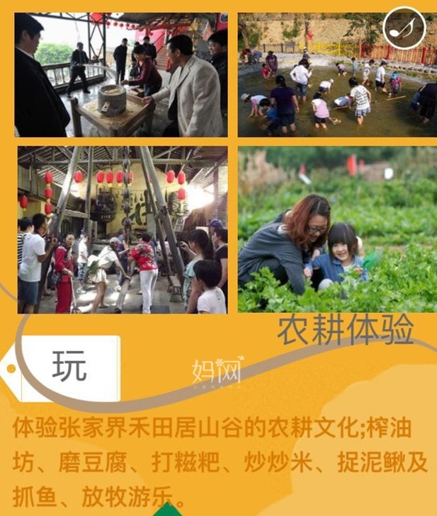 拓展活动包含1中餐、滚铁环、采摘蔬菜、磨豆腐(品尝1碗)、打糍粑(品尝1个)、竞速板鞋、拔河、榨油坊、沙滩娱乐、放牧游乐、捉泥鳅、播种、水牛耕田、滑草场、打陀螺、跳房子、踢毽子、跷跷板、荡秋千、炒炒米(品尝1杯)。中国最大的原生态溶洞洞穴餐厅【享用中餐】,均由禾田居生态农业(湖南五星级生态农庄)供应的绿色·无污染·无公害食材。菜品丰富,共有 40 多种湘菜菜品。乘车赴大峡谷,参观、体验“万金一字征名”和号称“世界最高最长”的【张家界世界第一玻璃桥】(游览时间约1小时)(包含玻璃桥门票,因景区规定提前五天提交游客名单及预付全额票款,故任何客人群体无优无退):桥高约400多米,长约370米,宽6米,全部采用99块透明玻璃铺设而成,创造了多项世界之最.