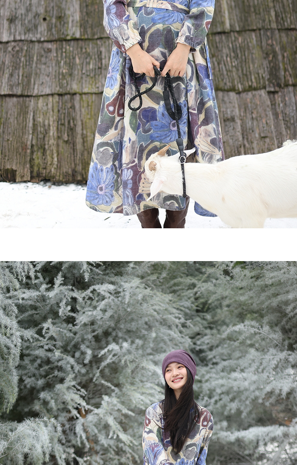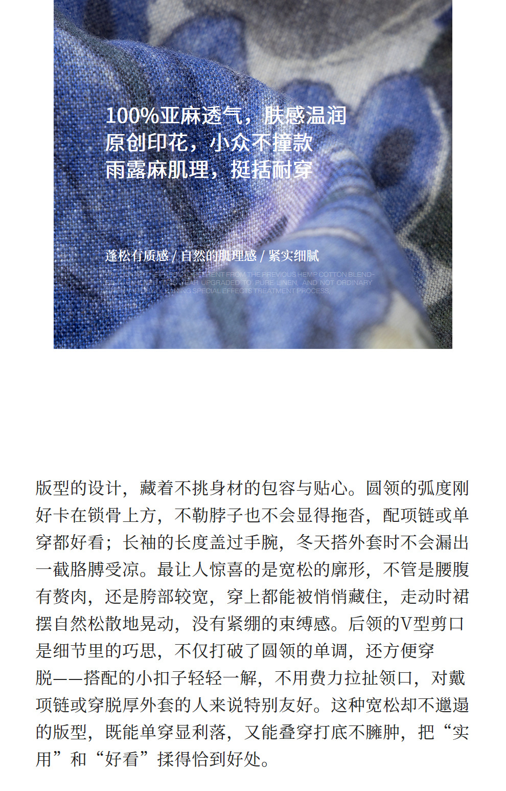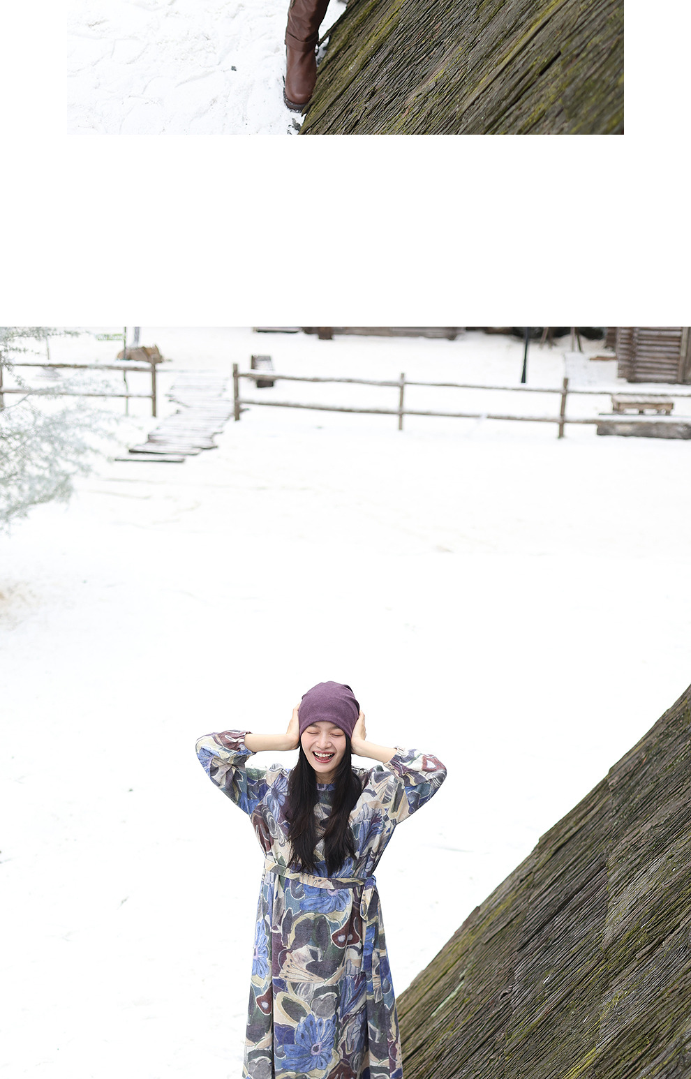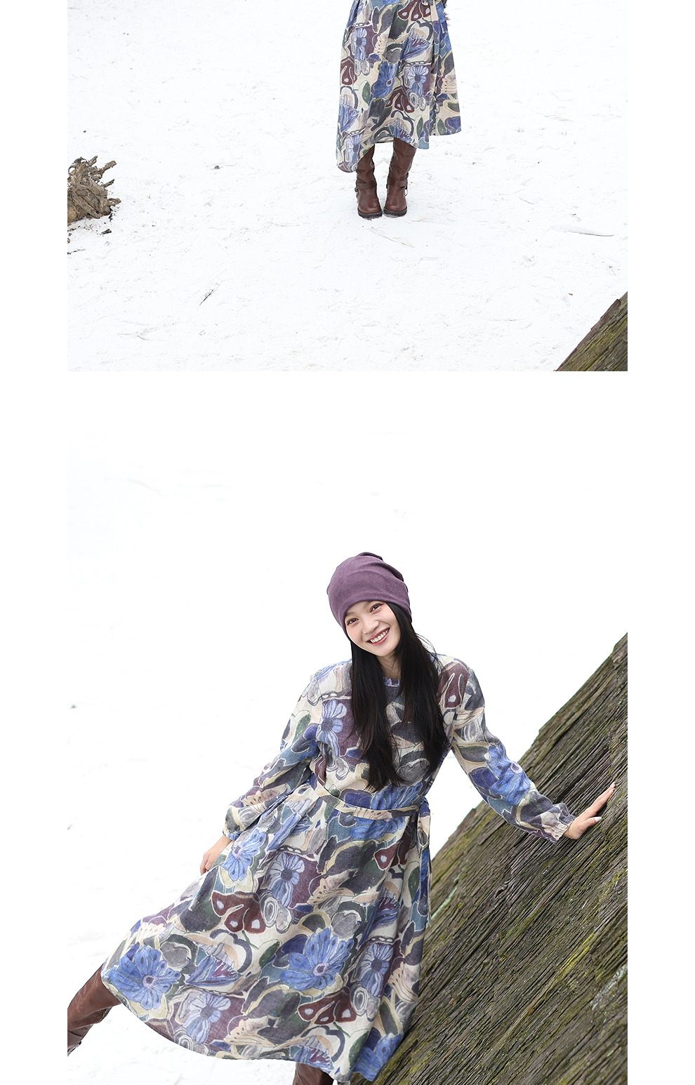 绽放764朵/新款文艺9*9雨露麻复古印花圆领秋冬百搭长袖连衣裙女