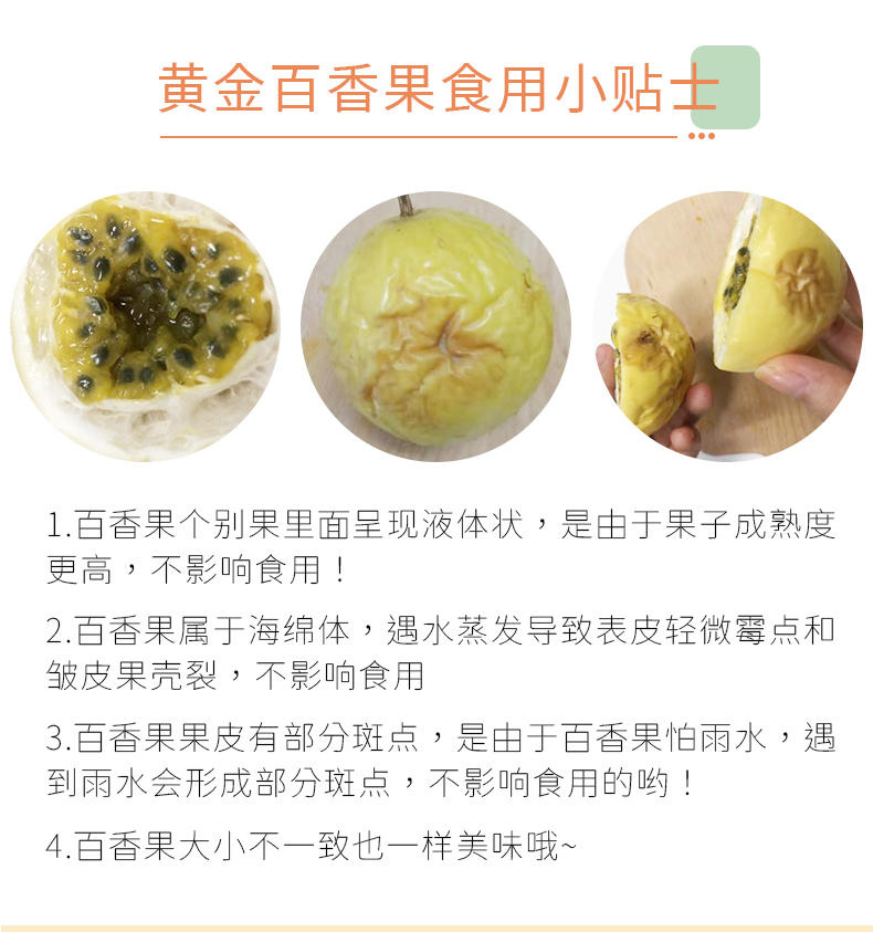 2.百香果属于海绵体,遇水蒸发导致部分表皮轻微霉点和果皮发皱,不影响食用的哦,介意慎拍