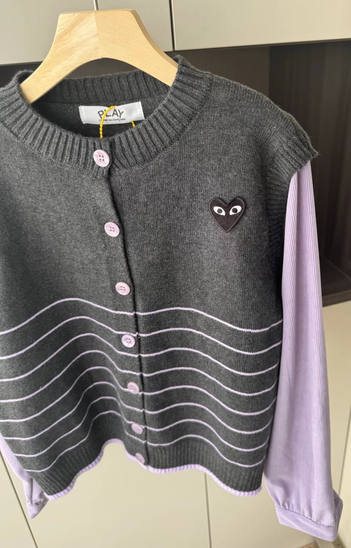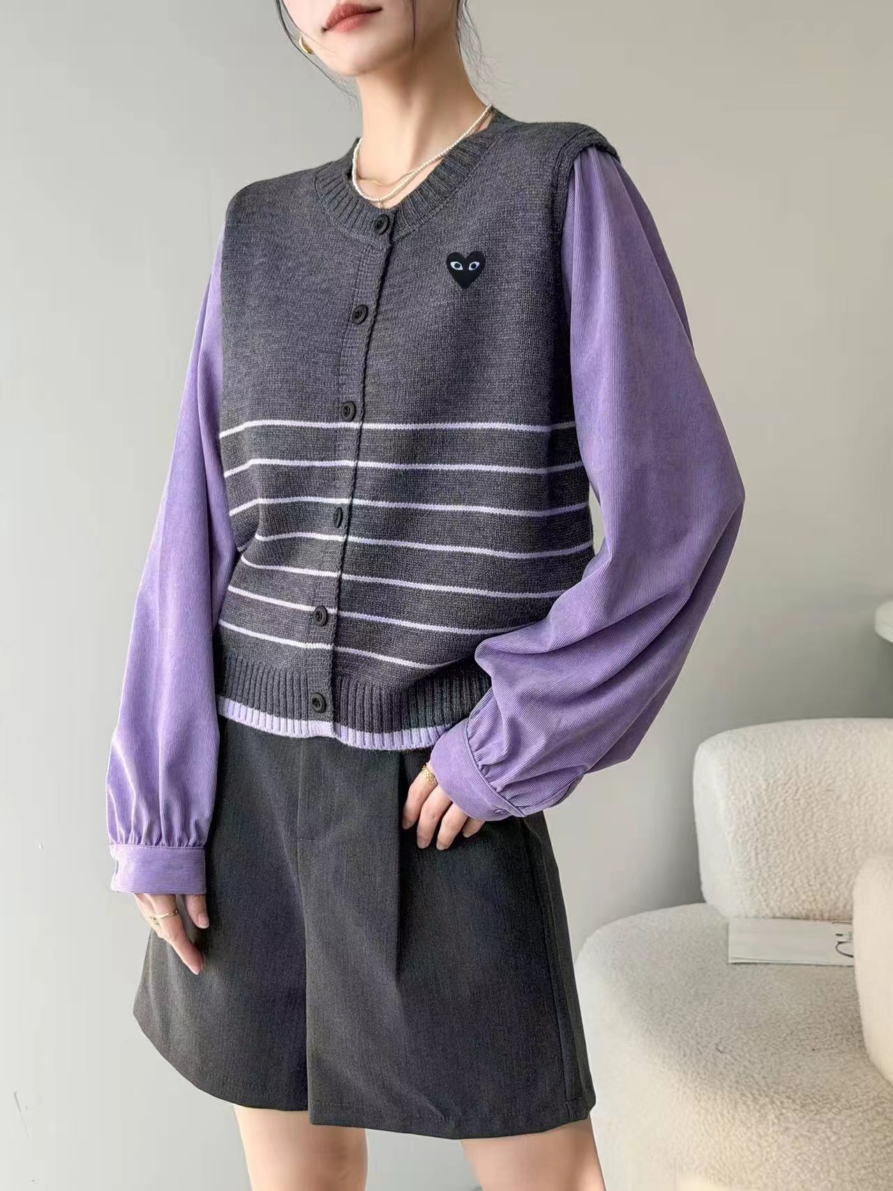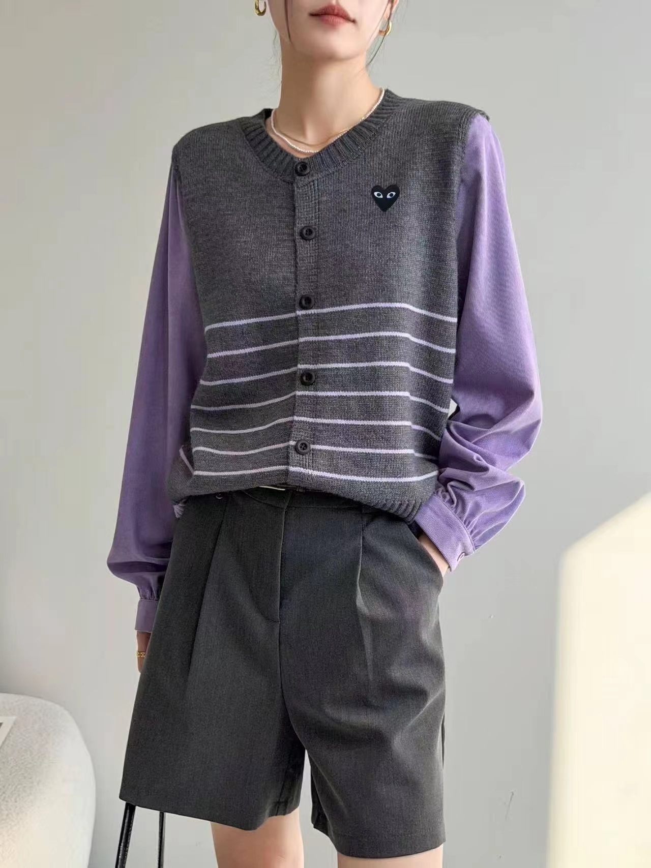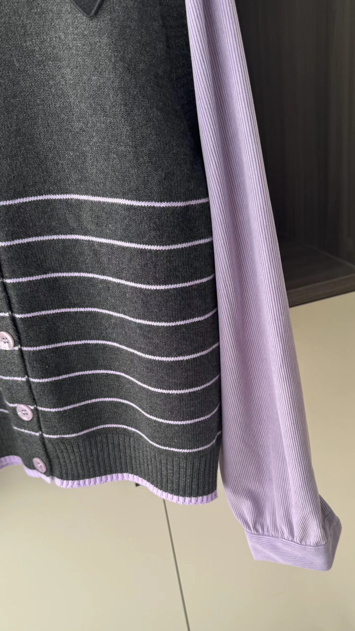 撞色拼接假两件针织开衫圆领短款剪裁,拉高腰线优化身材比例;宽松微廓形对各种身形友好,无束缚感。假两件造型,主体为深灰色针织马甲部分,嵌有白色横条纹,肩部拼接香芋紫灯芯绒长袖,面料撞色+材质撞色,层次感拉满;门襟为单排纽扣设计,可开衫穿也可扣合当套头衫,实用性强。左胸口点缀爱心刺绣标,小巧jing致,为整体增添甜酷少女感;袖口做微收口处理,贴合手腕不拖沓。