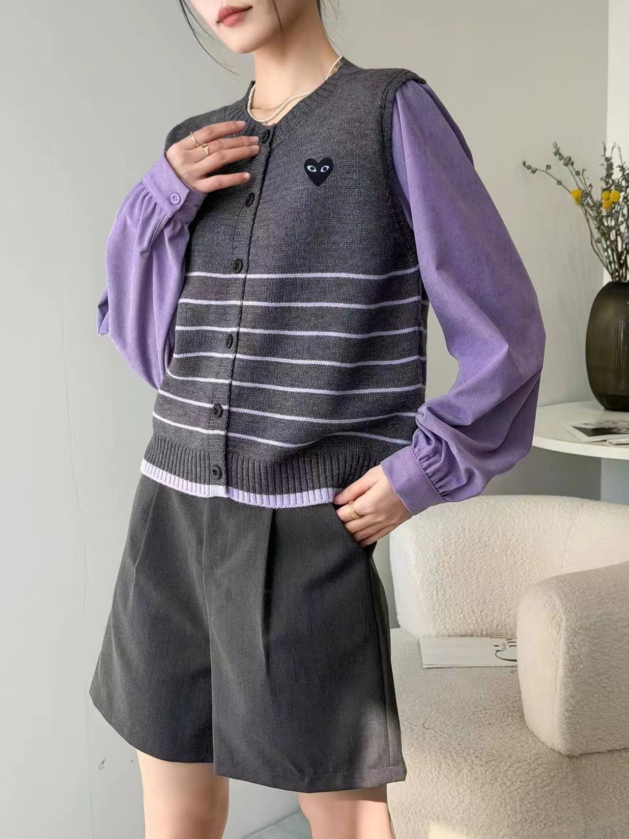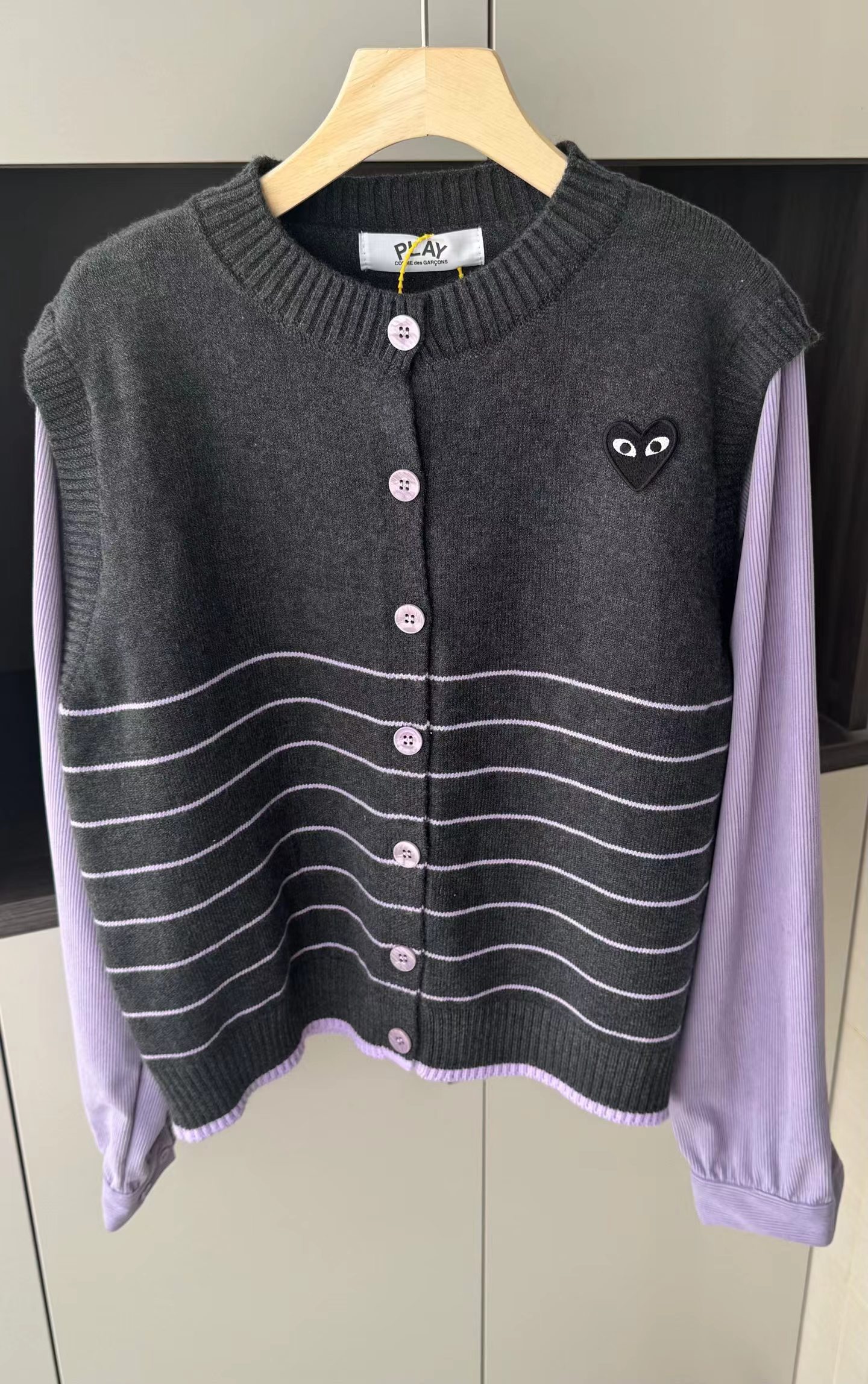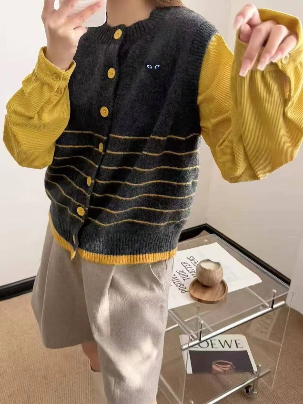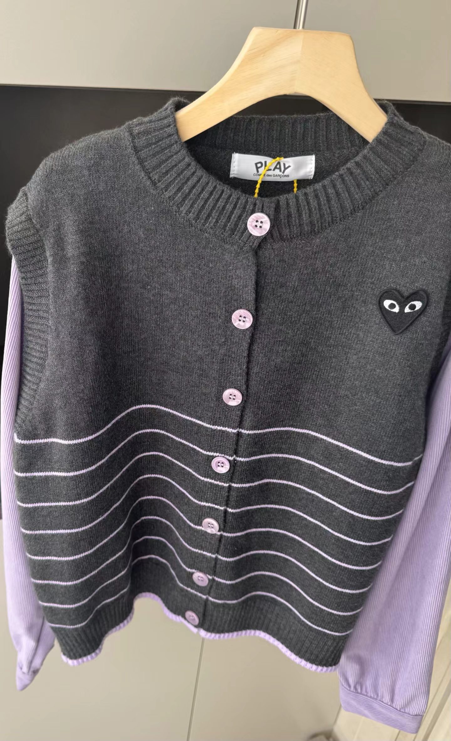 撞色拼接假两件针织开衫圆领短款剪裁,拉高腰线优化身材比例;宽松微廓形对各种身形友好,无束缚感。假两件造型,主体为深灰色针织马甲部分,嵌有白色横条纹,肩部拼接香芋紫灯芯绒长袖,面料撞色+材质撞色,层次感拉满;门襟为单排纽扣设计,可开衫穿也可扣合当套头衫,实用性强。左胸口点缀爱心刺绣标,小巧jing致,为整体增添甜酷少女感;袖口做微收口处理,贴合手腕不拖沓。