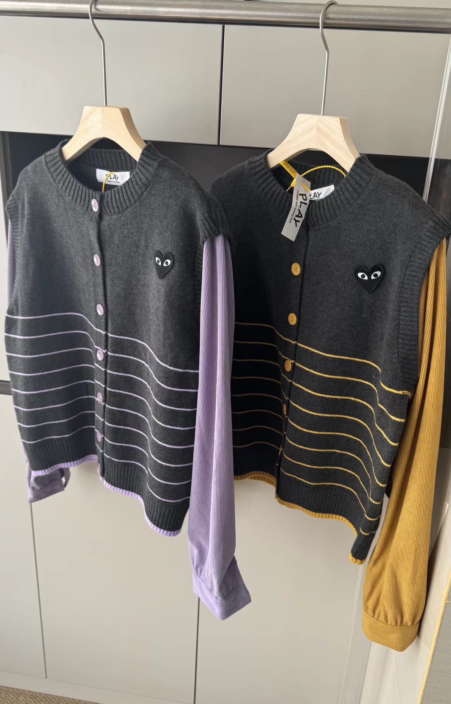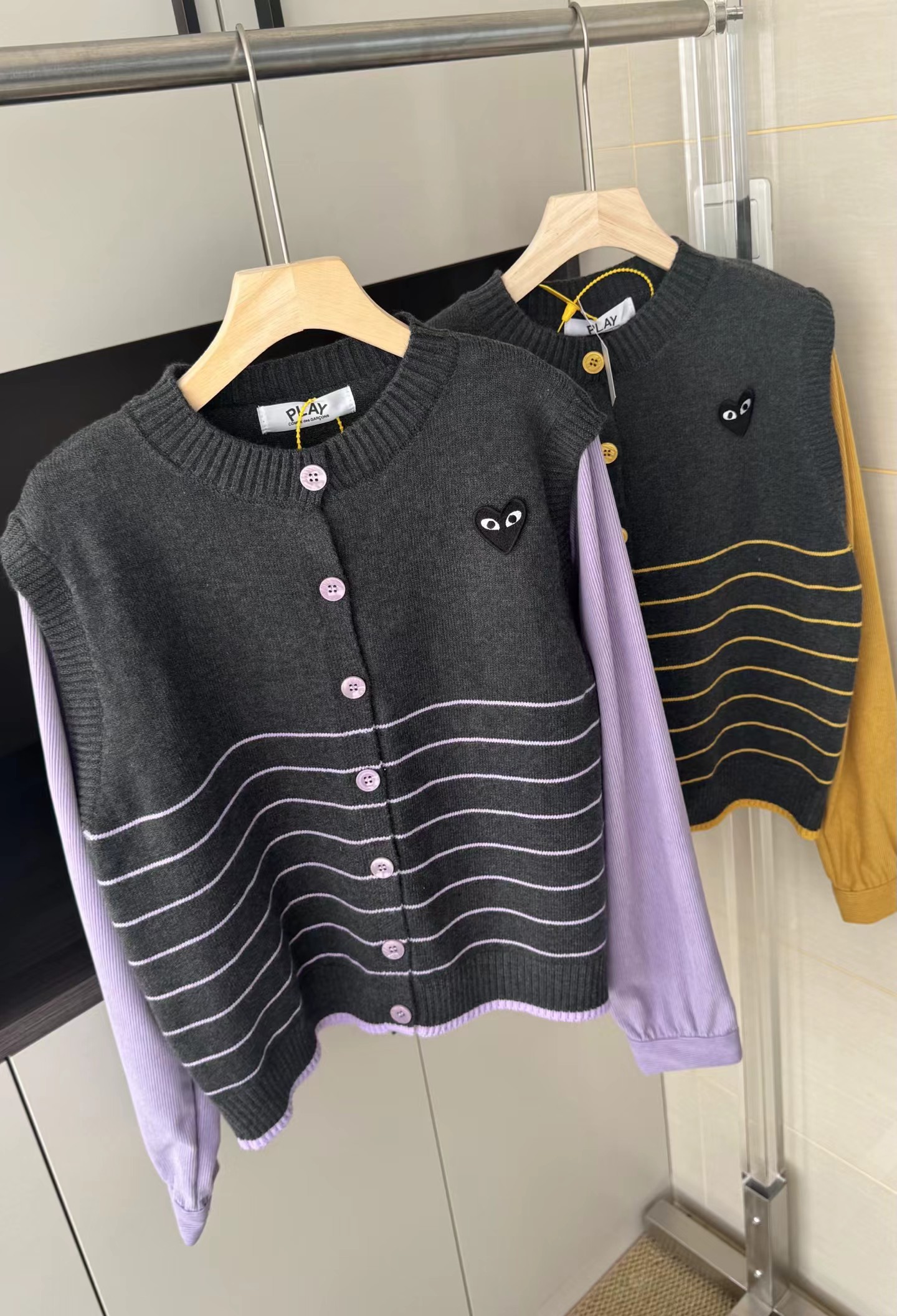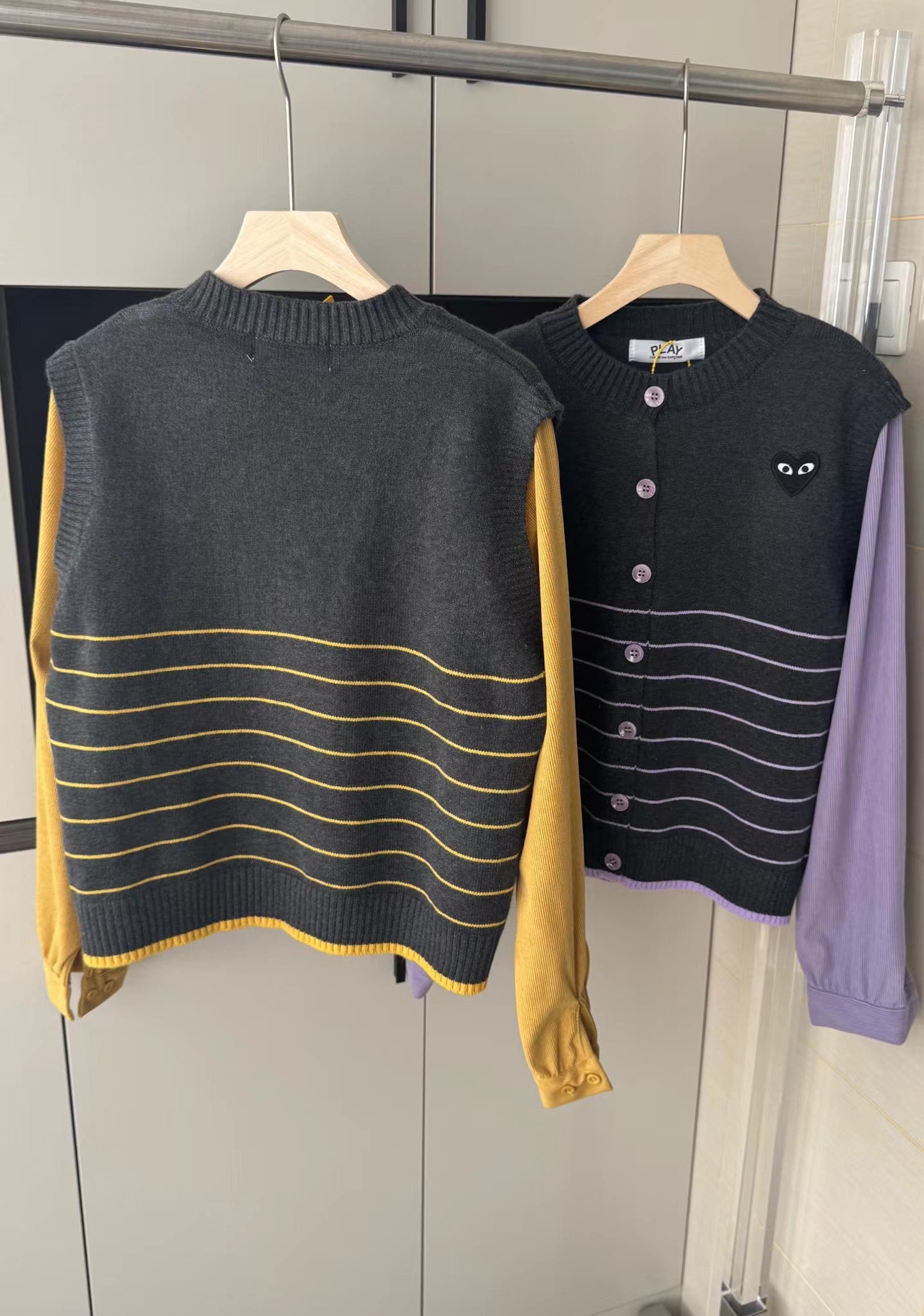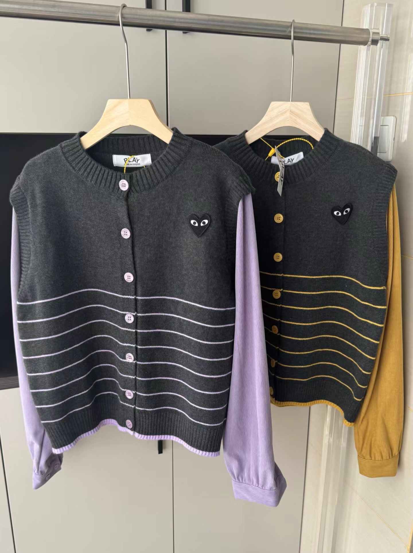 撞色拼接假两件针织开衫圆领短款剪裁,拉高腰线优化身材比例;宽松微廓形对各种身形友好,无束缚感。假两件造型,主体为深灰色针织马甲部分,嵌有白色横条纹,肩部拼接香芋紫灯芯绒长袖,面料撞色+材质撞色,层次感拉满;门襟为单排纽扣设计,可开衫穿也可扣合当套头衫,实用性强。左胸口点缀爱心刺绣标,小巧jing致,为整体增添甜酷少女感;袖口做微收口处理,贴合手腕不拖沓。