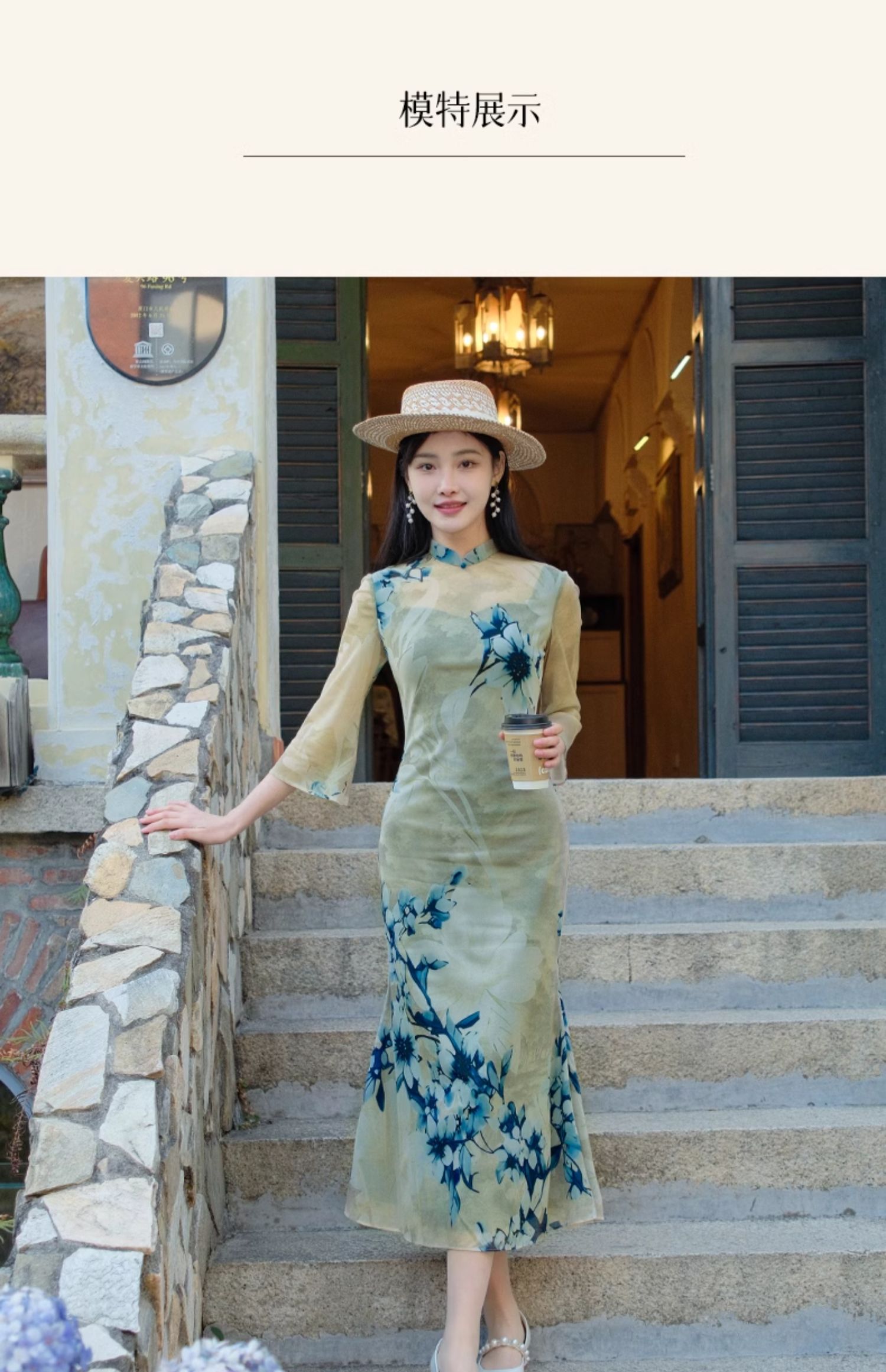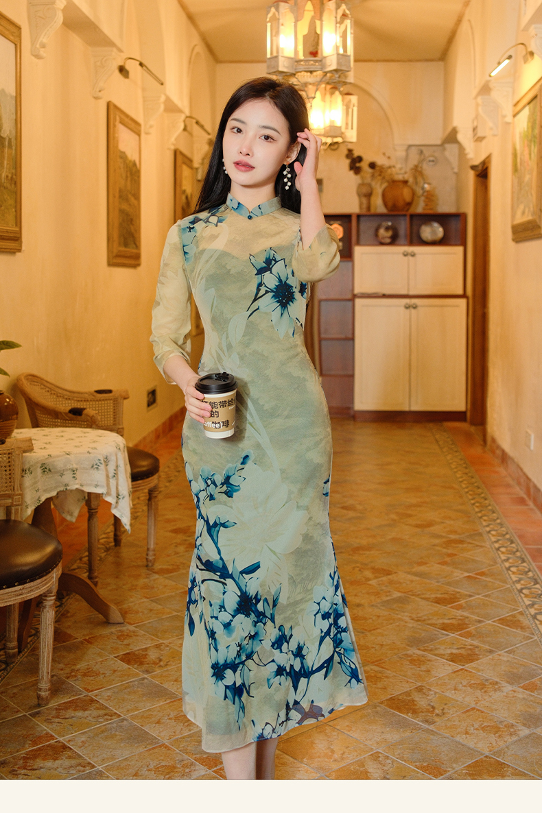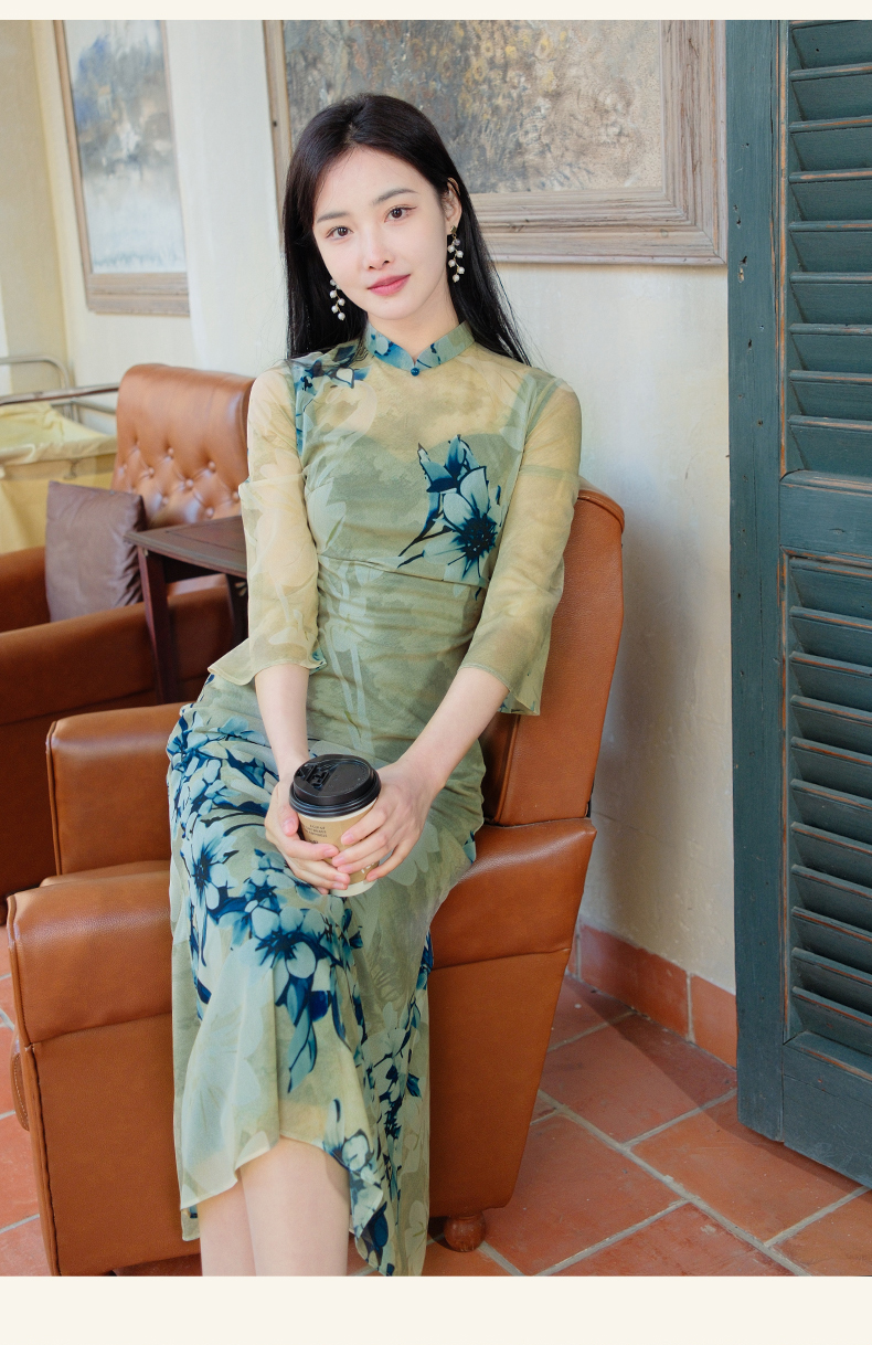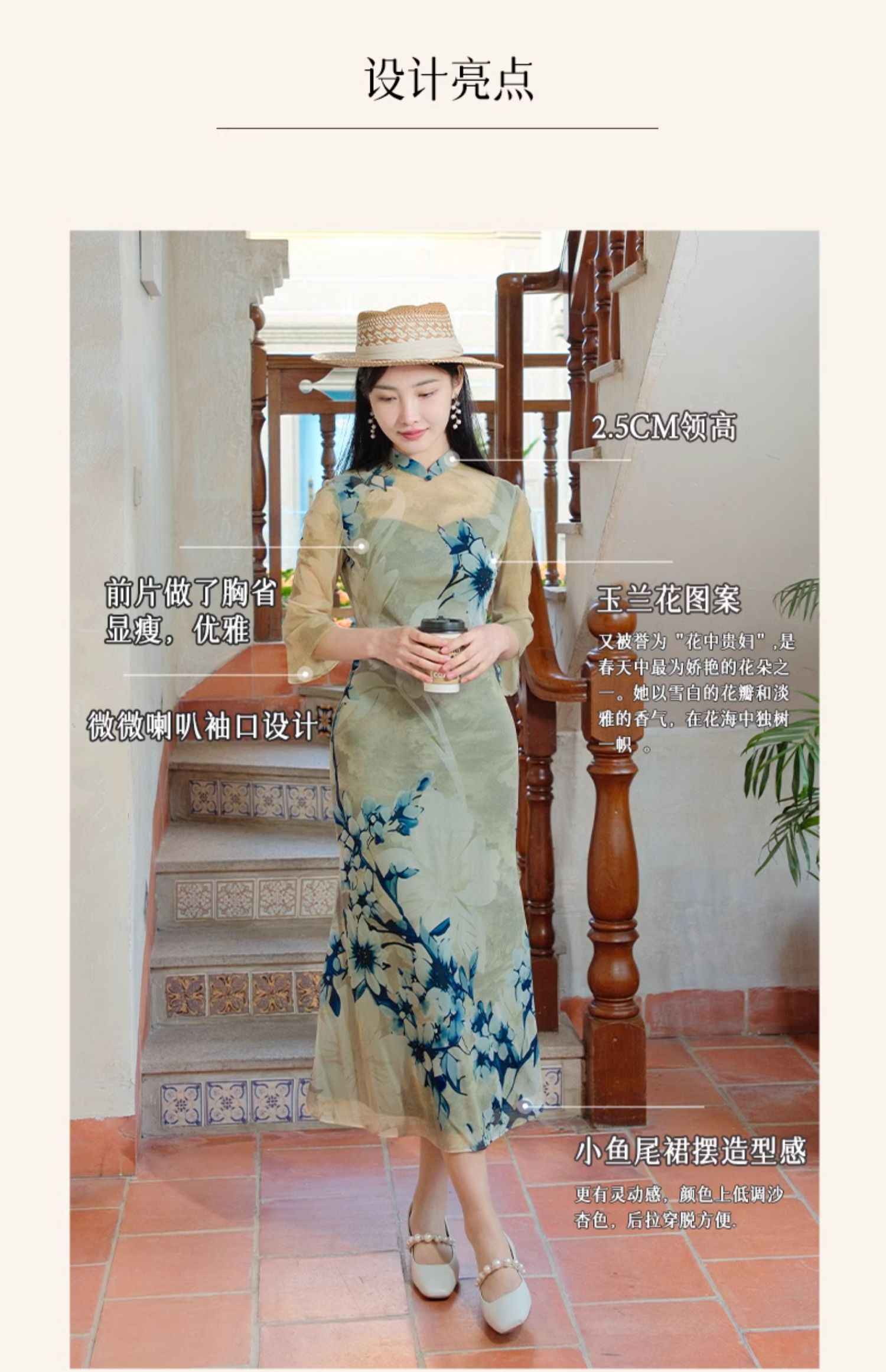 上海逸红颜夜樱2025年夏季新款醋酸针织网纱鱼尾新中式旗袍礼服裙