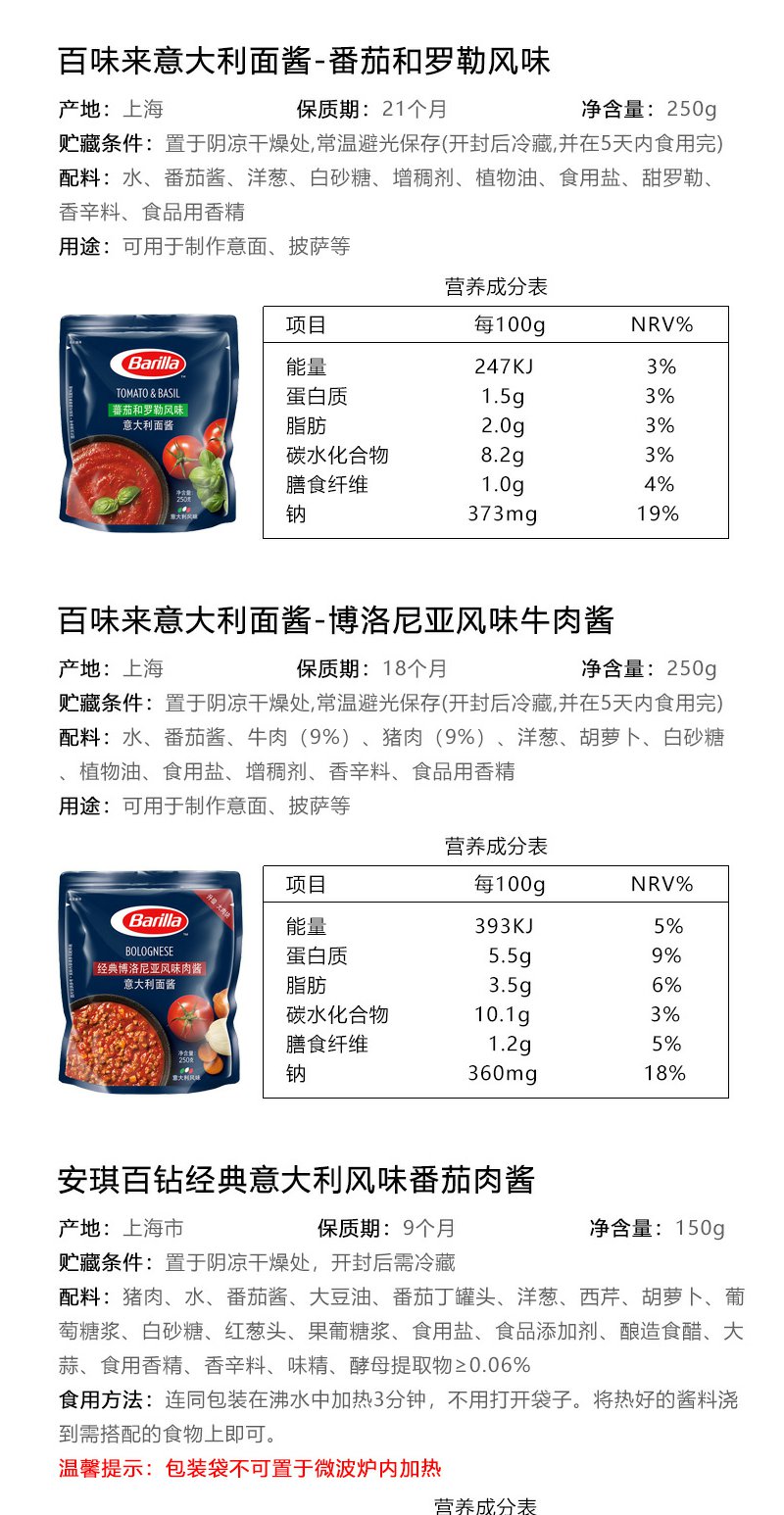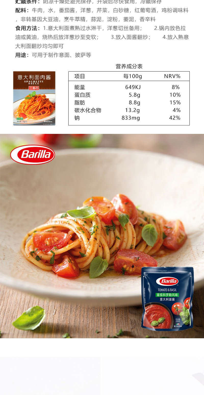 百味来barilla意大利面酱 番茄罗勒意面意粉披萨酱