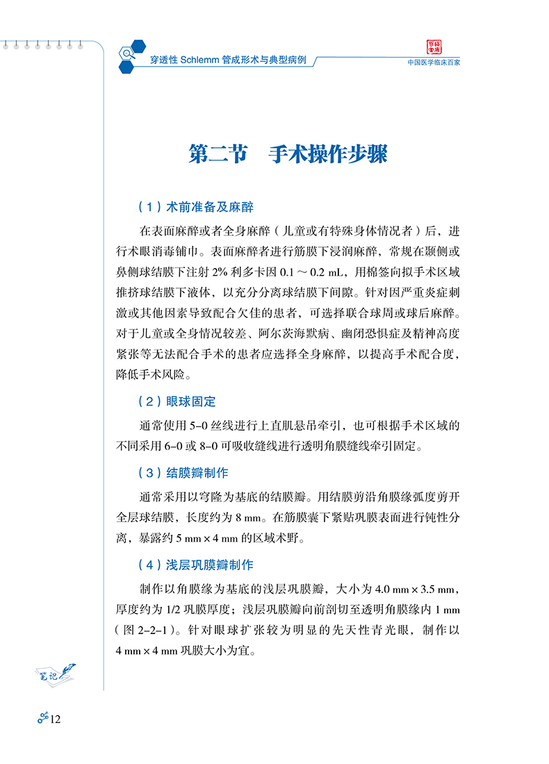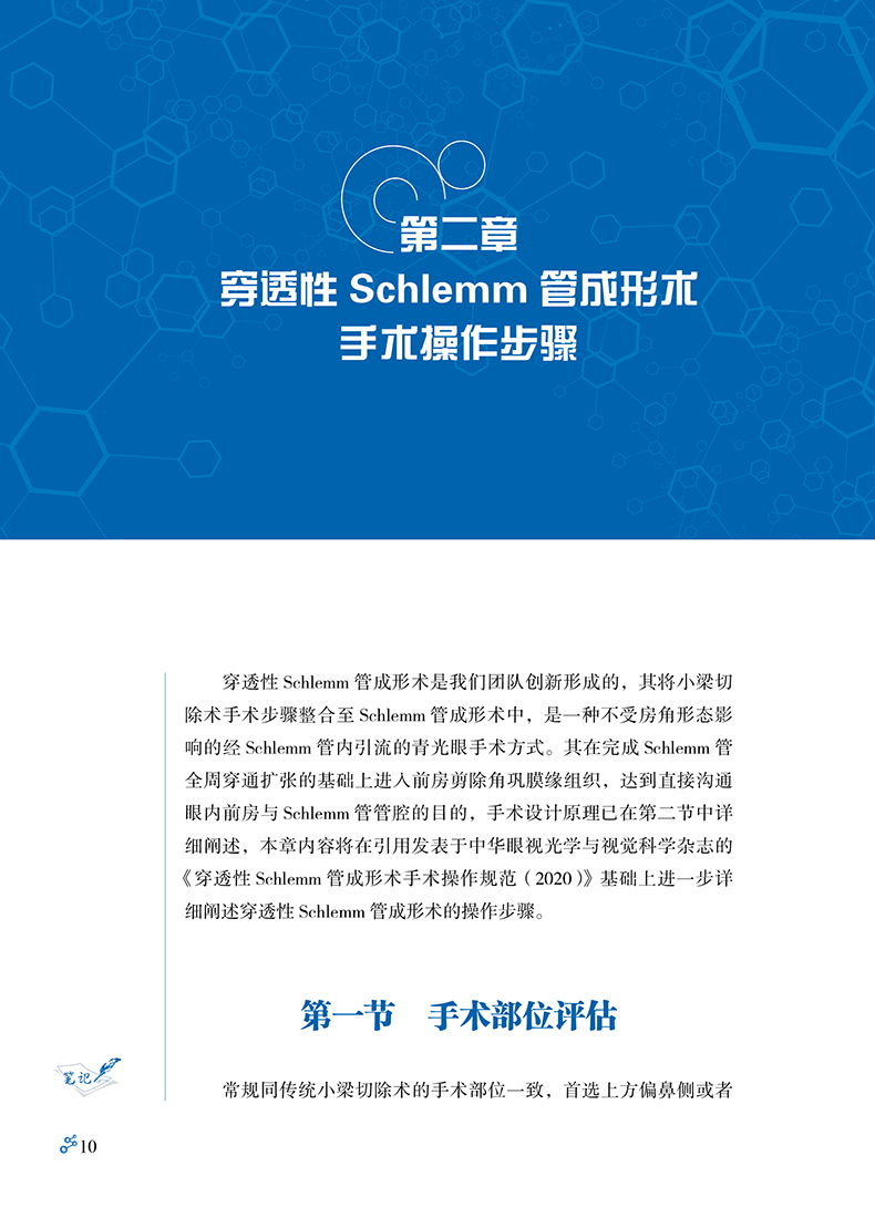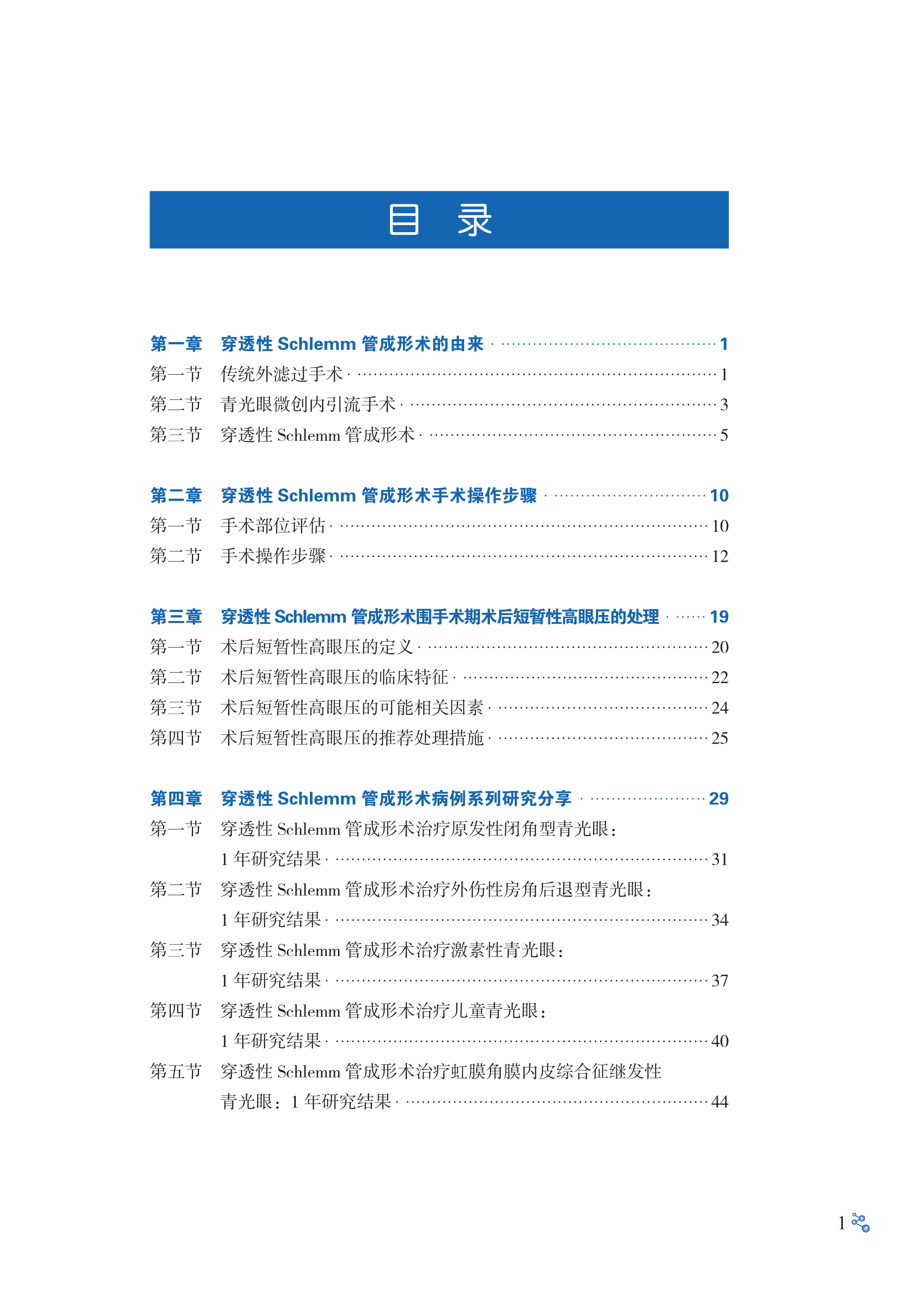 从 2015 年开始第一例穿透性 Schlemm 管成形术以来,他就不 断积累病例,并扩大了适应证,有了丰富的临床实践经验,发表 了 20 多篇相关文章。在形成系列研究成果的同时也建立了这项新 技术的操作规范与共识,本书则向我们介绍了包括病例、系列研 究成果到其团队关于穿透性 Schlemm 管成形术的操作及术后处理的 想法与观点,在临床上也收获了广大患者的信任和选择。我在临 床上也向他学习,开展了穿透性 Schlemm 管成形术,在对一些难治