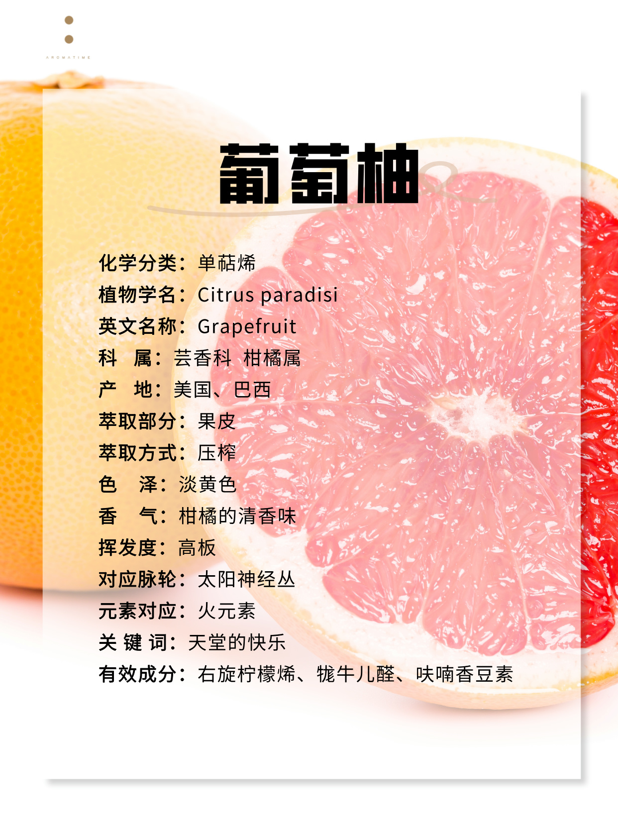 咱们日常说的葡萄柚是有白葡萄柚,绿葡萄柚和粉葡萄柚。其实这三种葡萄肉,它们都是柑橘属芸香科,只是因为它们的果肉颜色不太一样,一个是比较粉的,一个是那个比较白的,一个是绿的。在芳疗的使用上,功效上是差不多的,就是区别不大,但是它的香气就是不太一样,就是会在调香上会有所区别,还有就是它们的拉丁学名的后缀也是不一样的,前面是一样的,是同科同属。粉红葡萄柚是摘取到比较成熟的果实的果皮来压榨,它的气味相比更佳甜美。