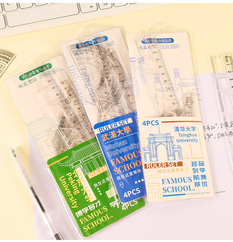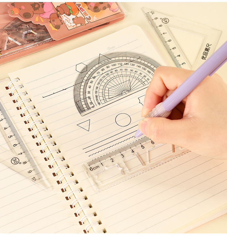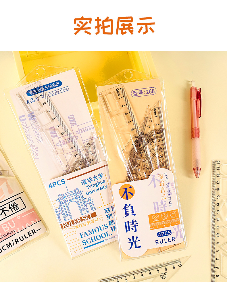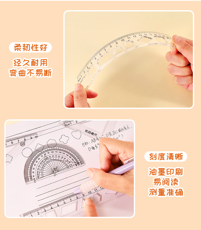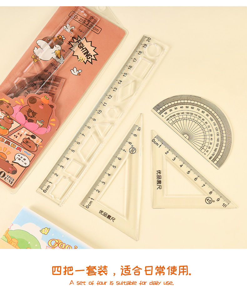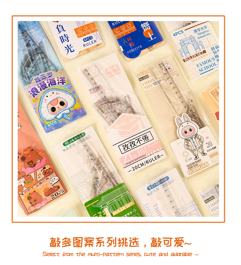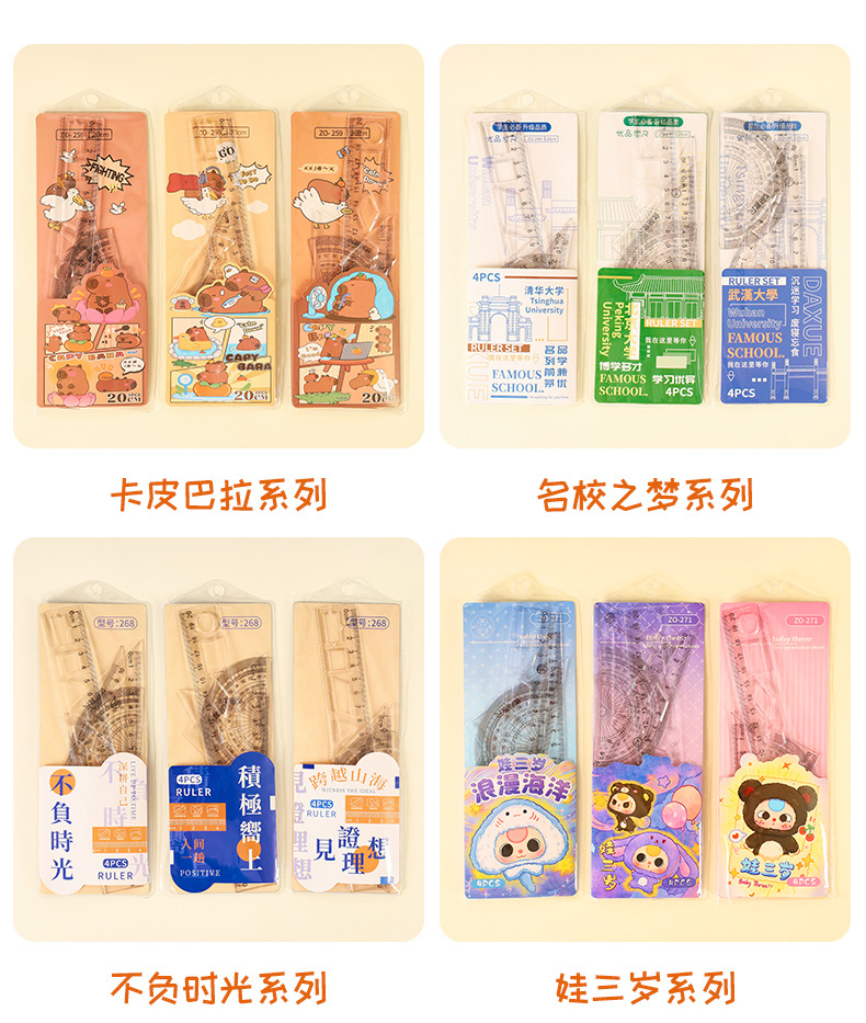 【9.9秒杀,卡通套尺四件套】敲多图案系列挑选,刻度清晰,柔韧性好,经久耐用,小学生四件套20cm考试绘画直尺三角板量角器尺子套装QQ