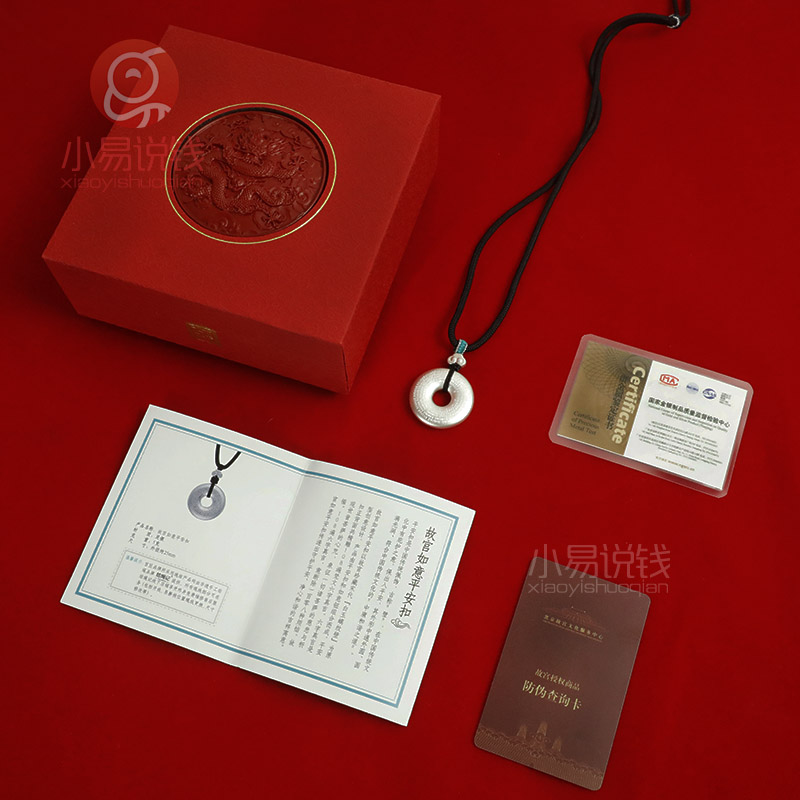 这款银质平安扣得到了故宫的官方授权,平安扣的形制,跟故宫中的珍品馆藏“白玉螭纹壁”很像!有驱灾辟邪、保出入平安的意思,也是这枚平安扣的设计理念。