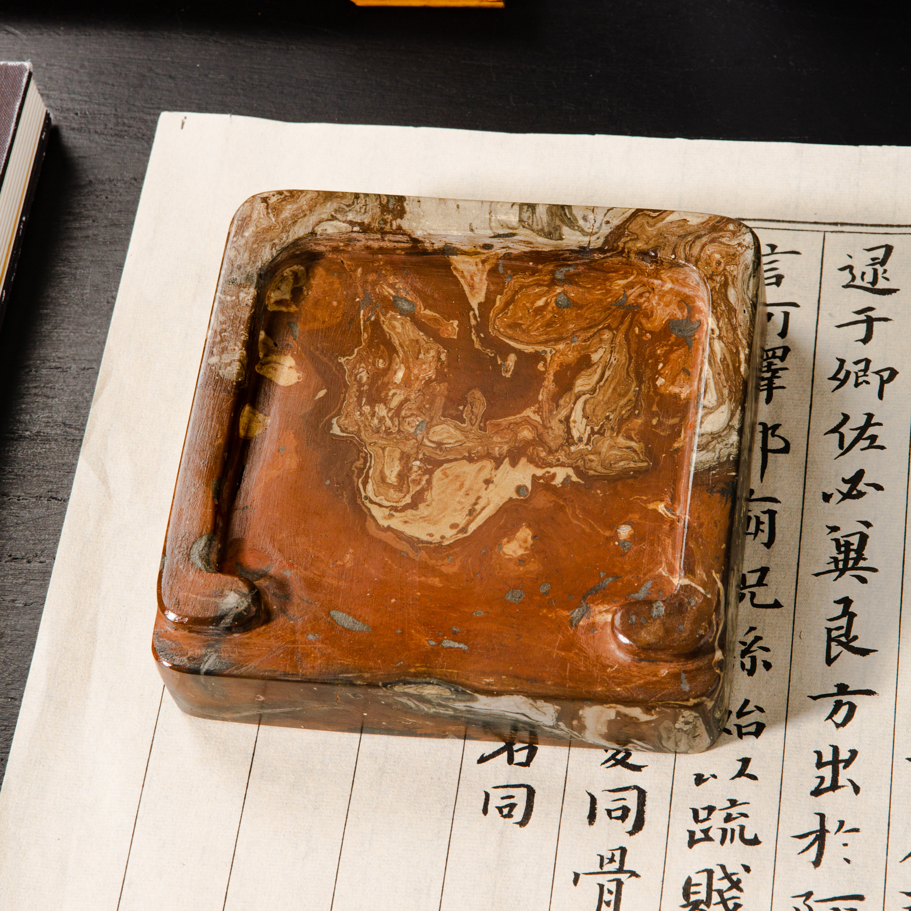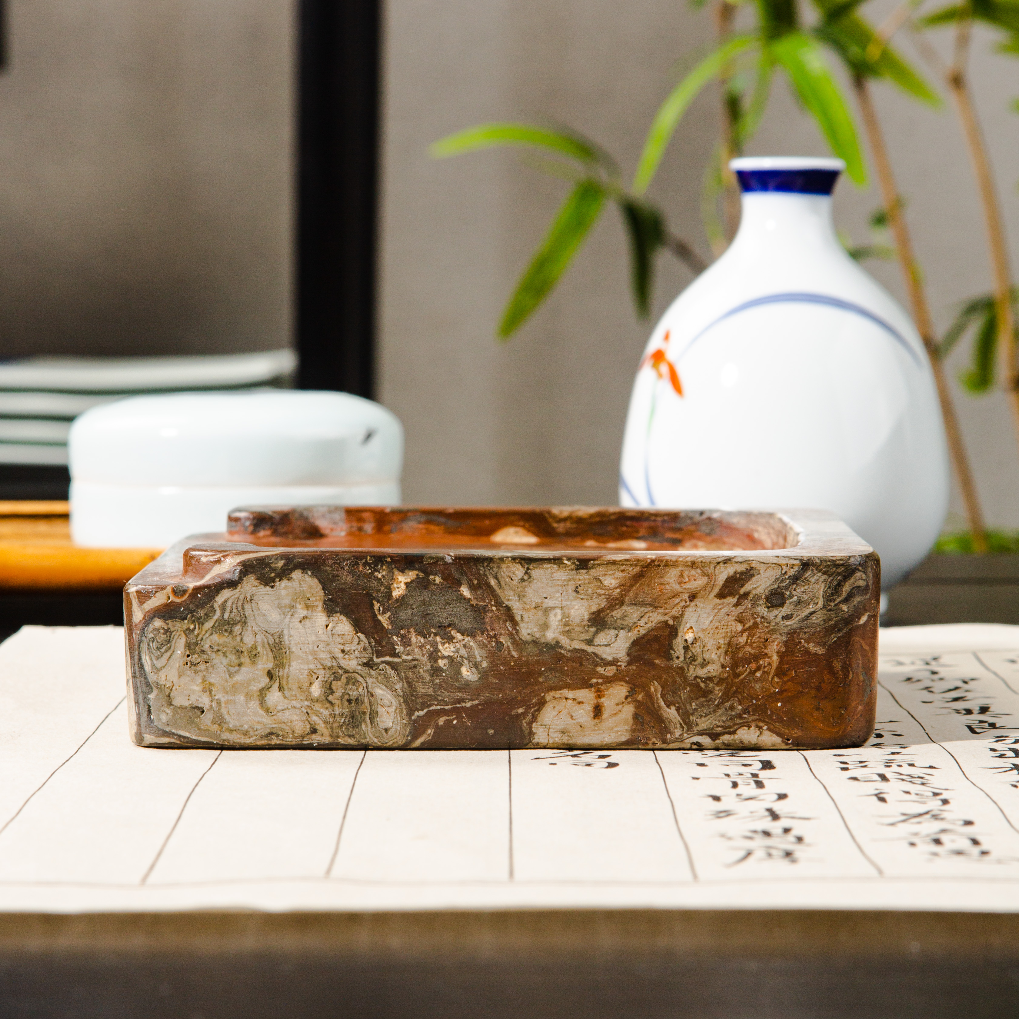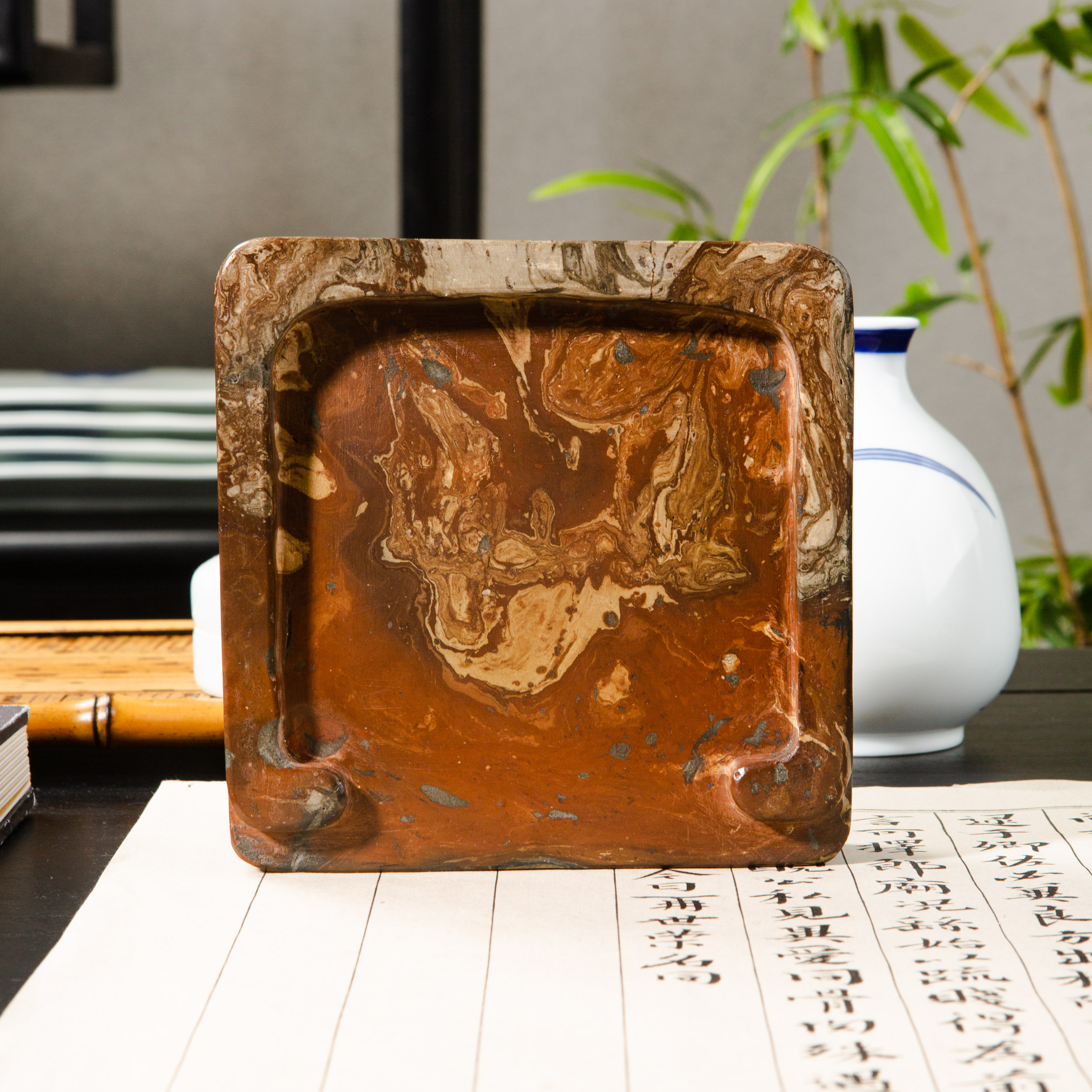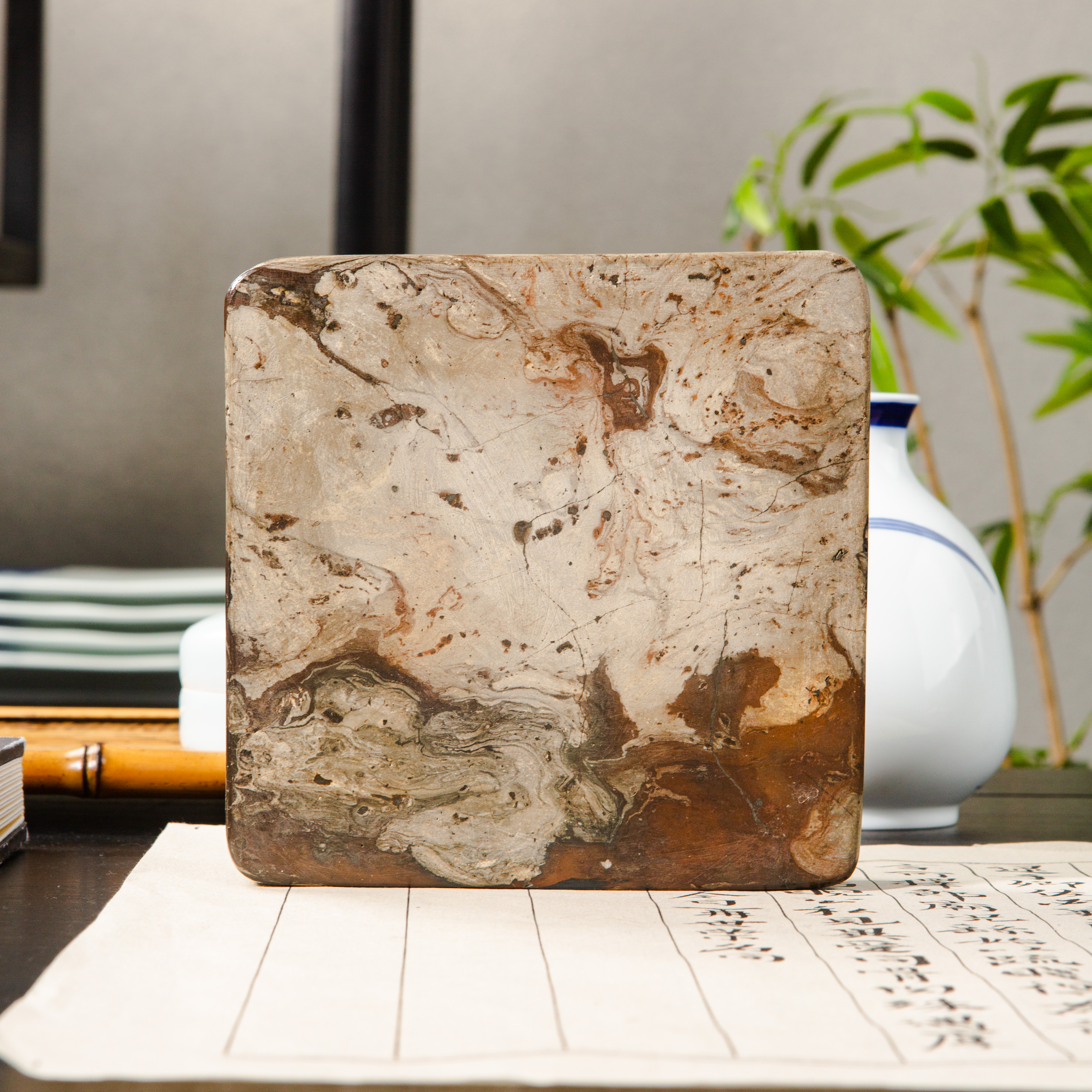 汉晋绞泥古砖制砚,其花色变化多端,质地坚实细腻,器型典雅,每一方都是孤品,十分难得!