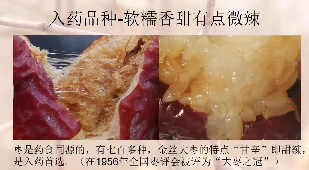 入药要求“甘辛”即甜辣,枣不但甜,还微微有点辣,金丝大枣特点就是甜辣,是入药首选。