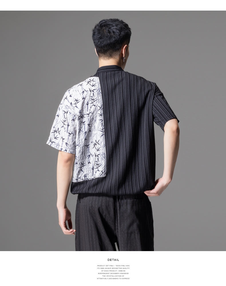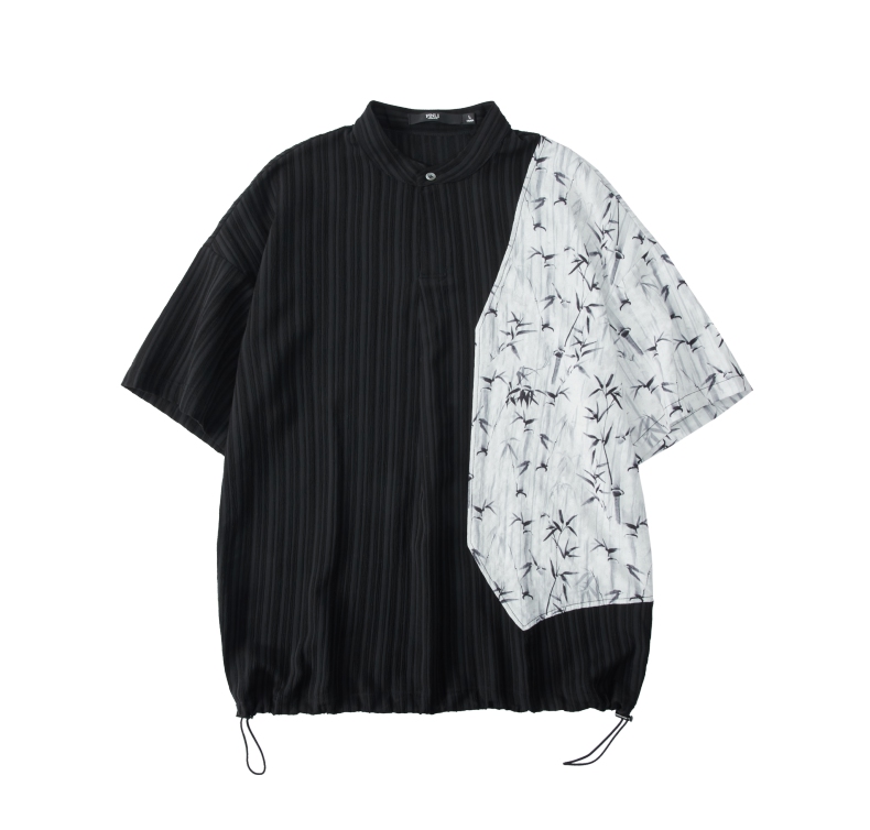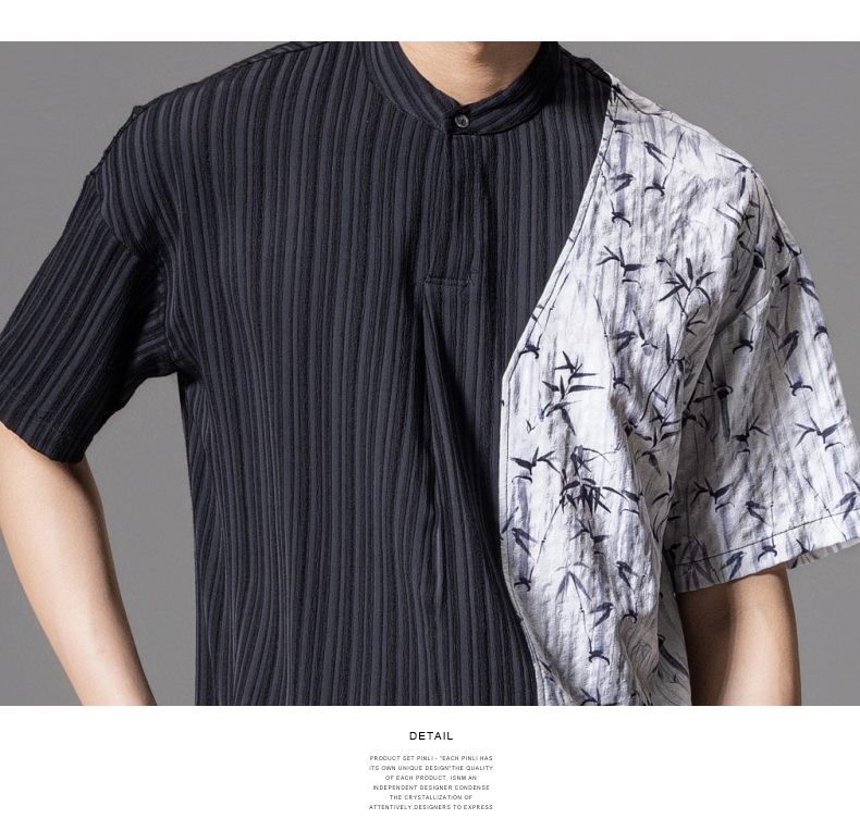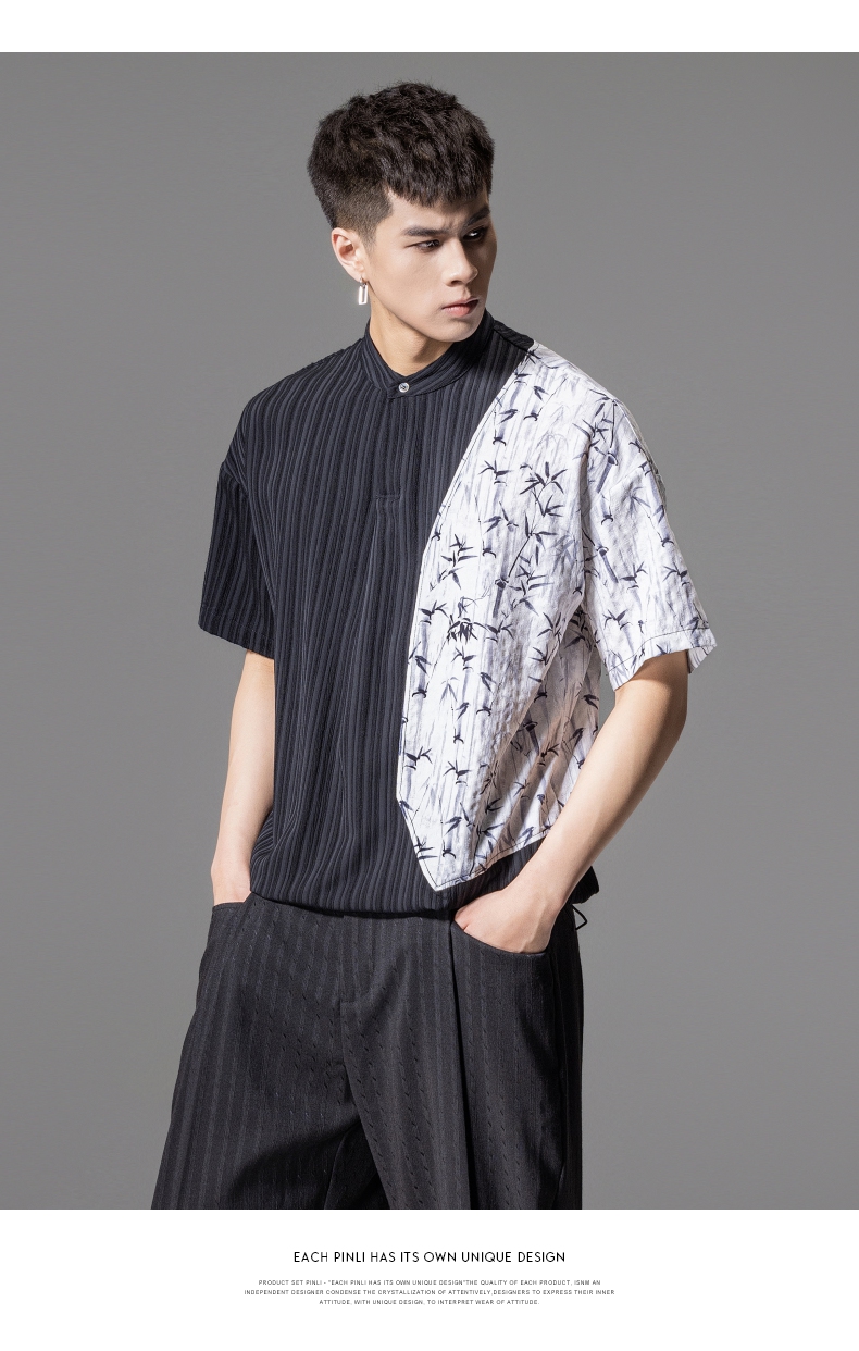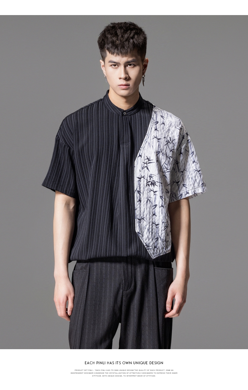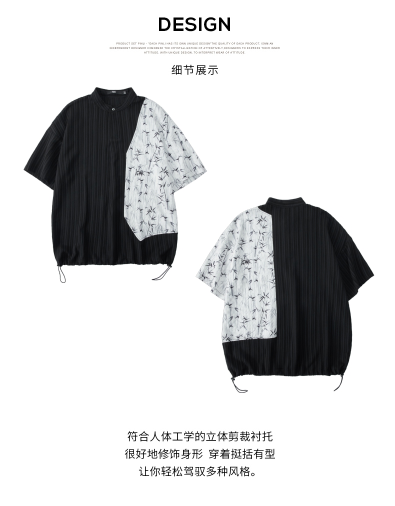PINLI品立2024夏季新款中国风拼接短袖T恤国潮印花竹叶立领男上衣B242111077