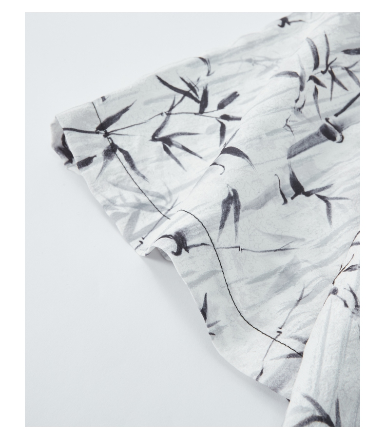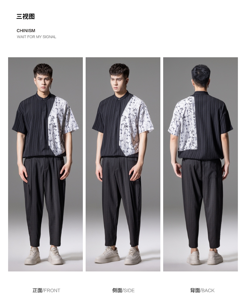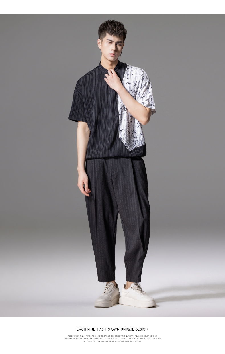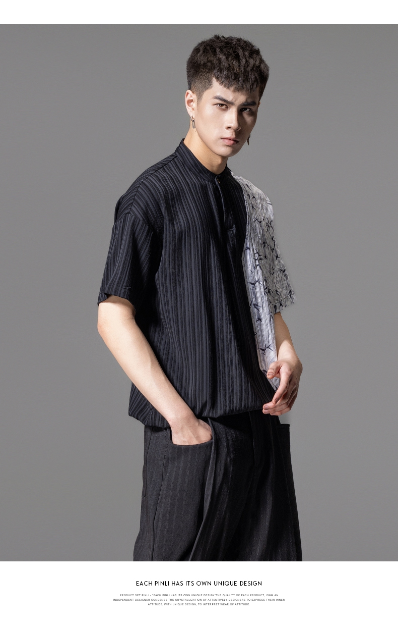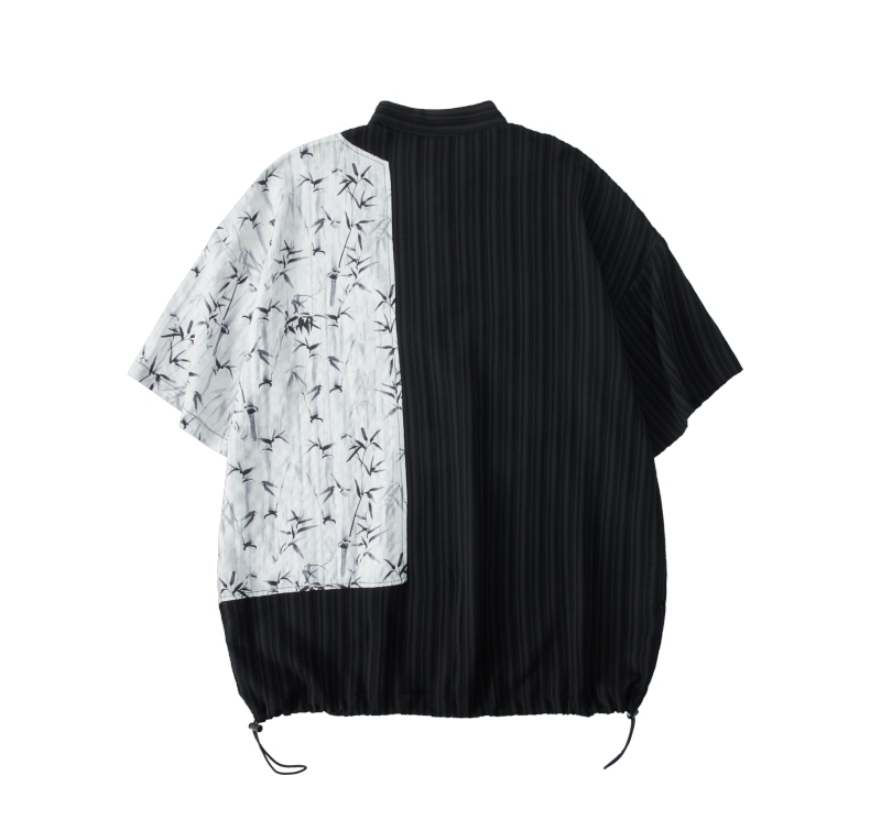 PINLI品立2024夏季新款中国风拼接短袖T恤国潮印花竹叶立领男上衣B242111077