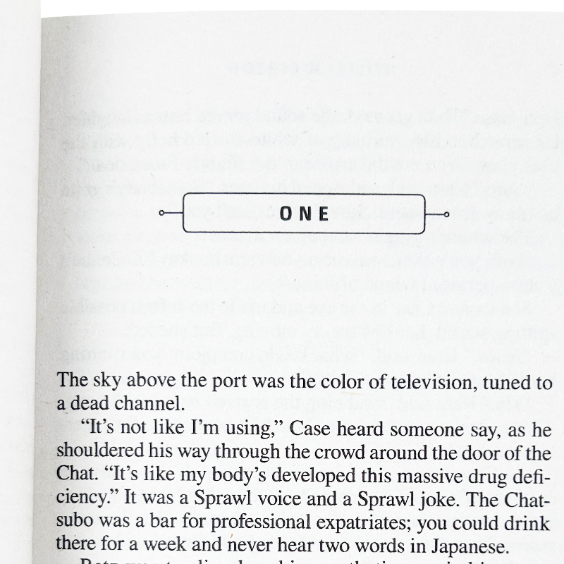 The sky above the port was the color of television, tuned to a dead channel. “It’s not like I’m using,” Case heard someone say, as he shouldered his way through the crowd around the door of the Chat. “It’s like my body’s developed this massive drug deficiency.” It was a Sprawl voice and a Sprawl joke. The Chatsubo was a bar for professional expatriates; you could drink there for a week and never hear two words in Japanese. Ratz was tending bar, h is prosthetic arm jerking monotonously as he filled a tray of glasses with draft Kirin. He saw Case and smiled, his teeth a webwork of East European steel and brown decay. Case found a place at the bar, between the unlikely tan on one of Lonny Zone’s whores and the crisp naval uniform of a tall African whose cheekbones were ridged with precise rows of tribal scars. “Wage was in her early, with two joeboys,” Ratz said, shoving a draft across the bar with his good hand. “Maybe some business with you, Case?” Case shrugged. The girl to his right giggled and nudged him. The bartender’s smile widened. His ugliness was the stuff of legend. In an age of affordable beauty, there was something heraldic about his lack of it. The antique arm whined as he reached for another mug. It was a Russian military prosthesis, a seven-function force-feedback manipulator, cased in grubby pink plastic. “You are too much the artiste, Herr Case.” Ratz grunted; the sound served him as laughter. He scratched his overhang of white-shirted belly with the pink claw. “You are the artiste of the slightly funny deal.” “Sure,” Case said, and sipped his beer. “Somebody’s gotta be funny around here. Sure the fuck isn’t you.” The whore’s giggle went up an octave. “Isn’t you either, sister. So you vanish, okay? Zone, he’s a close personal friend of mine.” She looked Case in the eye and made the softest possible spitting sound, her lips barely moving. But she left. “Jesus,” Case said, “what kinda creepjoint you running here? Man can’t have a drink?” “Ha,” Ratz said, swabbing the scarred wood with a rag, “Zone shows a percentage. You I let work here for entertainment value.” As Case was picking up his beer, one of those strange instants of silence descended, as though a hundred unrelated conversations had simultaneously arrived at the same pause. Then the whore’s giggle rang out, tinged with certain hysteria. Ratz grunted. “An angel has passed.” “The Chinese,” bellowed a drunken Australian, “Chinese bloody invented nerve-splicing. Give me the mainland for a nerve job any day. Fix you right, mate…;” “Now that,” Case said to his glass, all his bitterness suddenly rising in him like bile, “that is so much bullshit.” The Japanese had already forgotten more neurosurgery than the Chinese had ever known. The black clinics of Chiba were the cutting edge, whole bodies of technique supplanted monthly, and still they couldn’t repair the damage he’d suffered in that Memphis hotel.