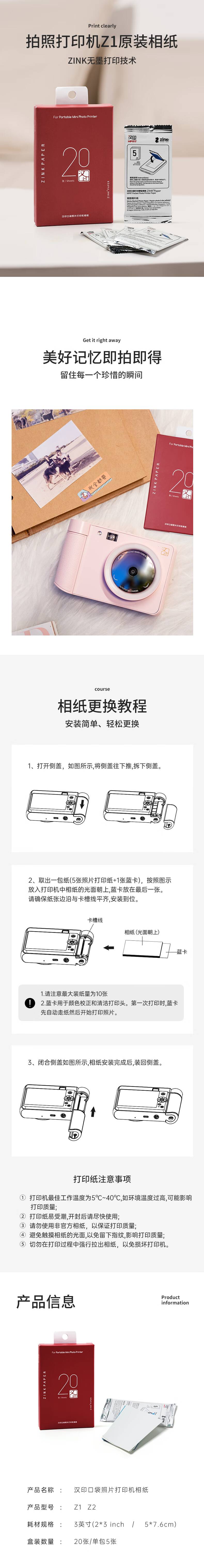 【积分兑换】汉印即拍即印Z1 Z2照片相纸20张*2盒一次打印成像3英寸ZINK相纸mini相机拍照打印机专用