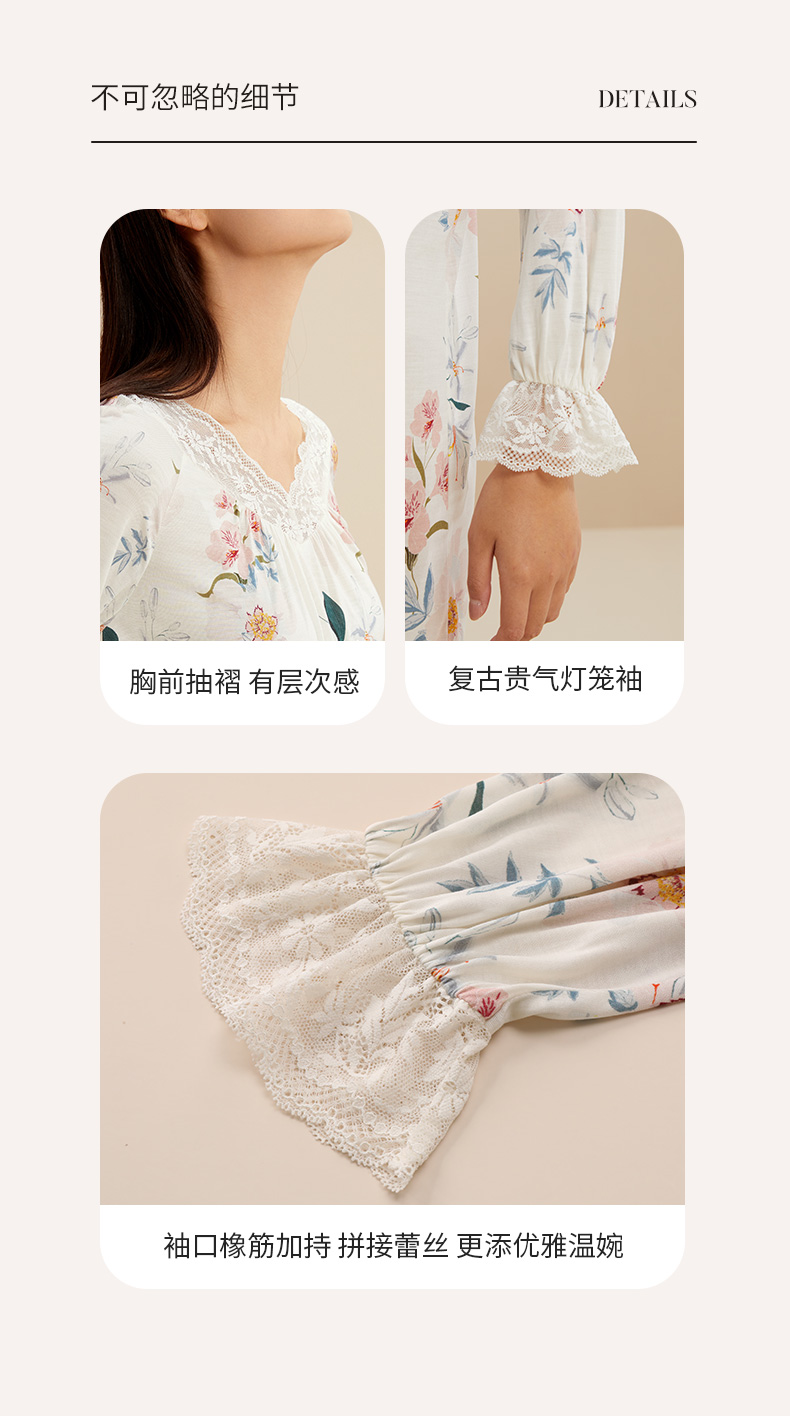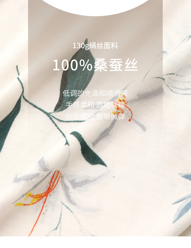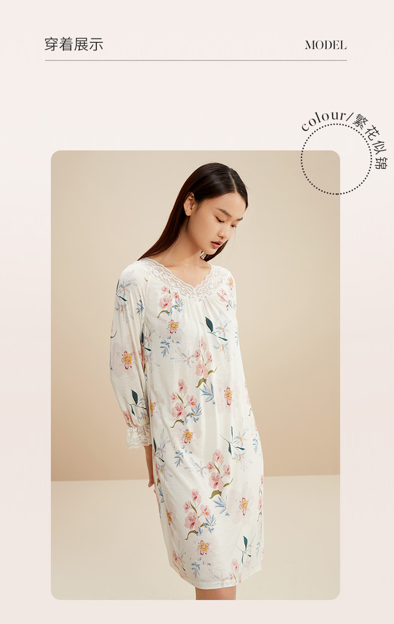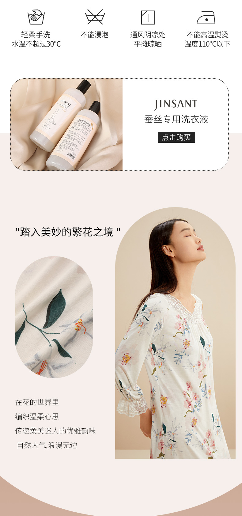 金三塔100%桑蚕丝真丝针织舒适女拼蕾丝繁华之名印花睡裙睡衣 YZFCC303