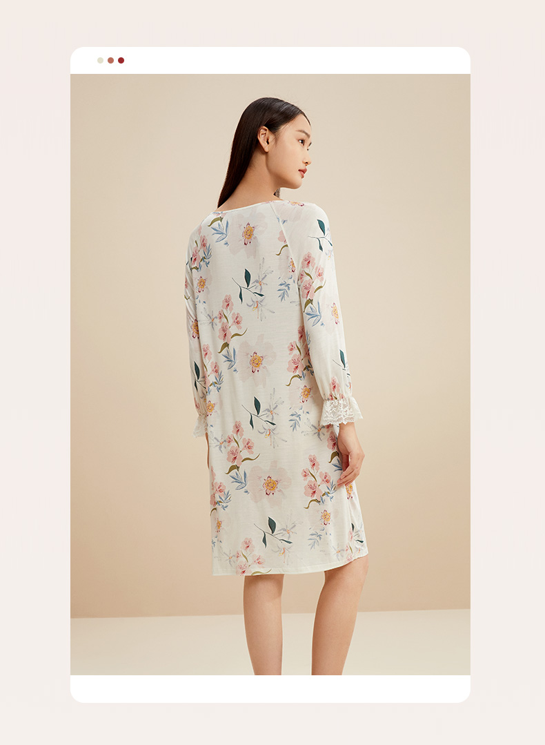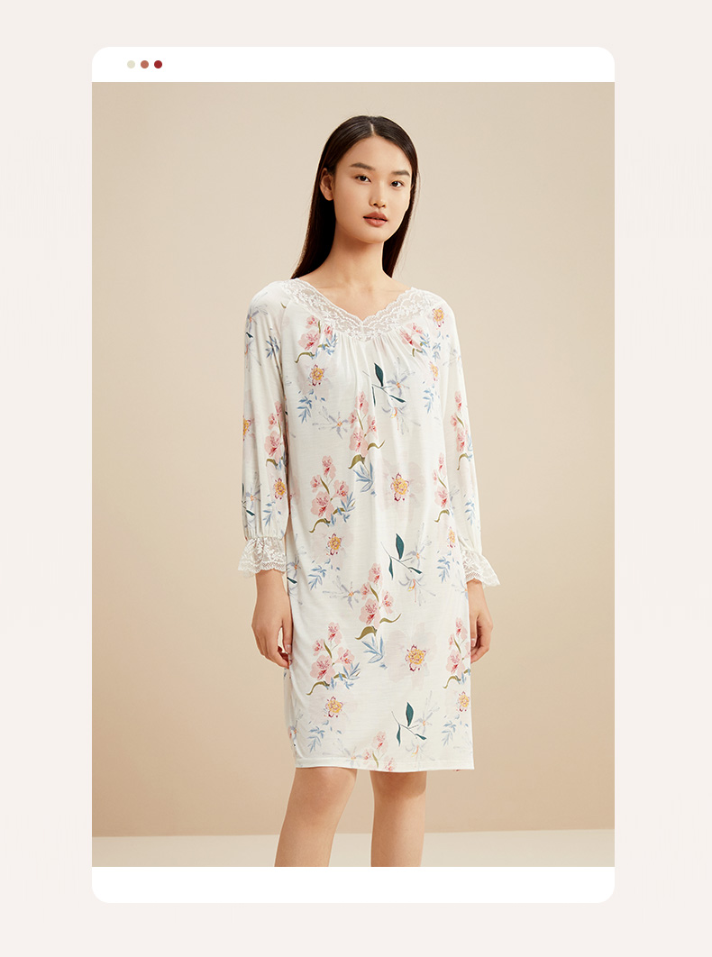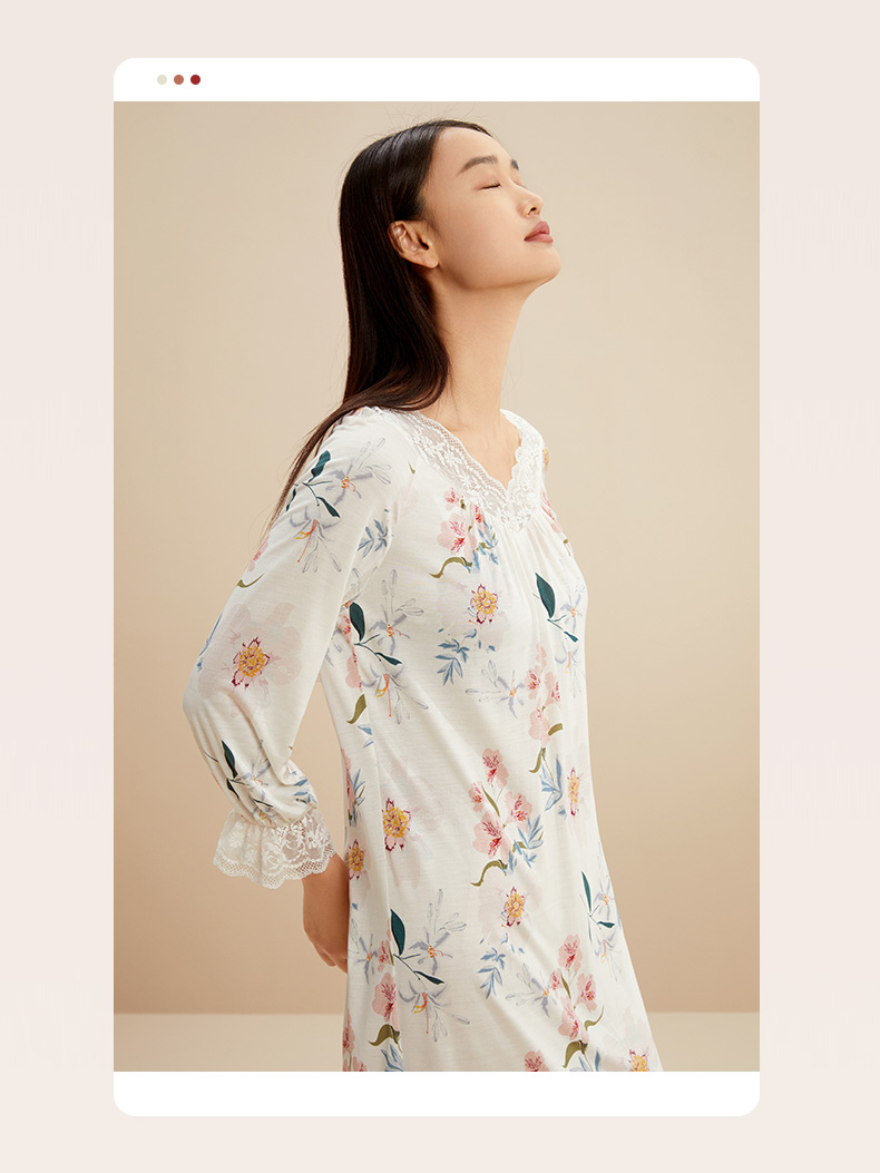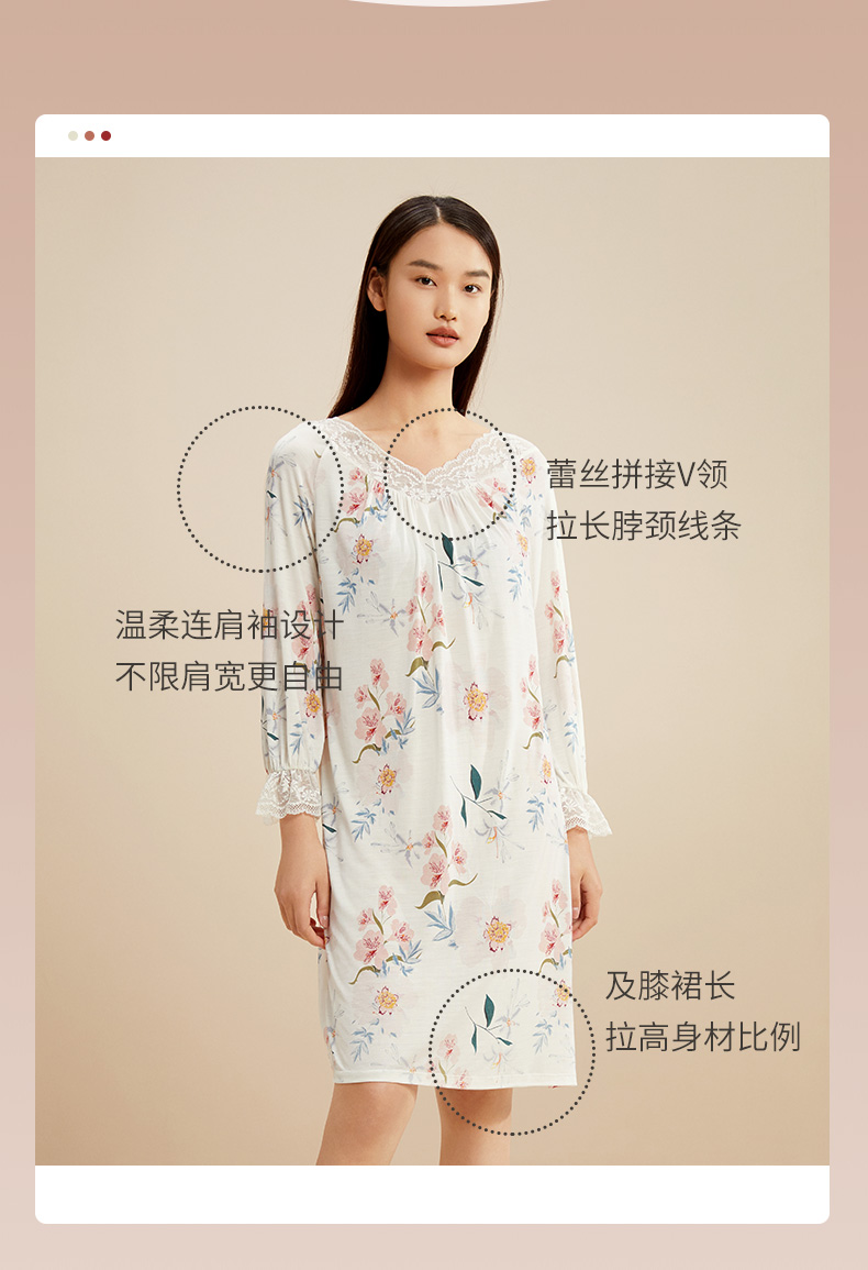 金三塔100%桑蚕丝真丝针织舒适女拼蕾丝繁华之名印花睡裙睡衣 YZFCC303