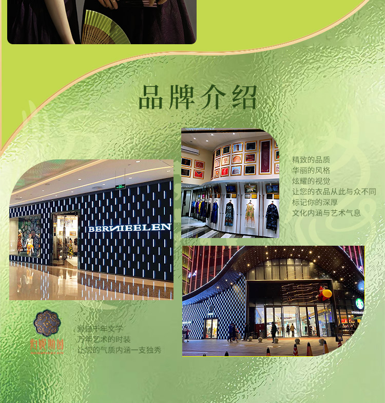 行业首家从事文创研发的女装品牌-伯妮斯茵 品牌风格:源自千年文学和万年艺术的时装,让你的气质内涵一枝独秀,精彩的品质,华丽的风格,炫耀的视觉,让你的衣品从此与众不同,标记你深厚的文化内涵与艺术气息。