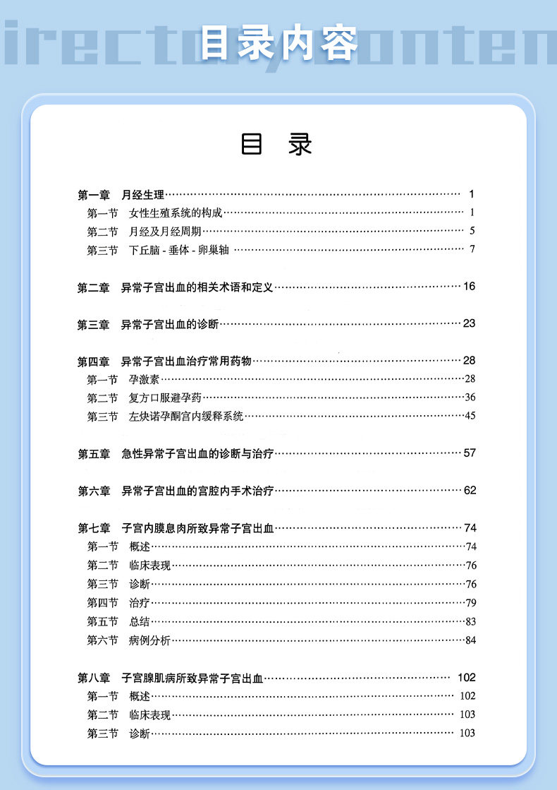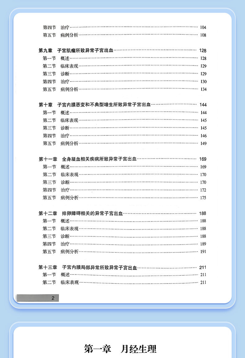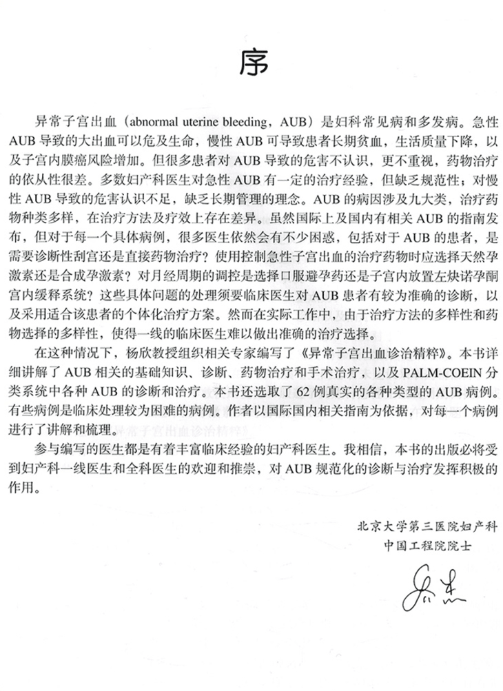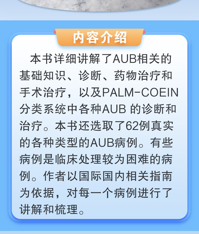 本书共有16章。第一章到第六章讲述了月经生理,以及AUB的相关术语、分类、诊断、药物治疗和手术治疗。在治疗药物上讲解了常见孕激素的种类,口服避孕药的种类特性及在非避孕中的治疗作用,以及左炔诺孕酮宫内缓释系统非避孕的临床应用。第七到第十五章对FIGO制定的PALM-COEIN的九大类AUB进行了详细讲解和诊治流程的梳理。这九类包括子宫内膜息肉所致AUB、子宫腺肌病所致AUB、子宫平滑肌瘤所致AUB、子宫内膜恶变和不典型增生所致AUB、全身凝血异常相关疾病所致AUB、排卵障碍所致AUB、子宫内膜局部因素所致AUB、医源性AUB及未分类的AUB。第十六章介绍了AUB血栓相关性病例。本书以国际及国内AUB的最新相关指南为依据,在讲解每一类AUB时,内容包括分类、临床表现和治疗,还提供了若干临床真实病例。本书选取了62例真实的各种类型的AUB病例。结合病例从病史、诊断、分析和处理进行专家点评,故本书是一本集科学性、学术性和实用性为一体的工具书。