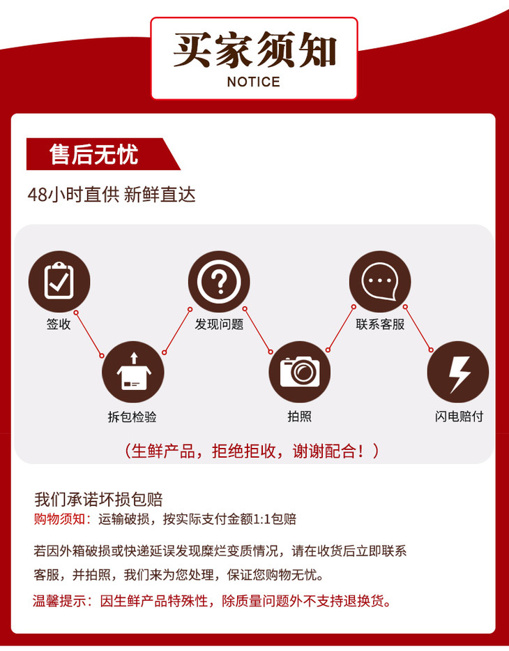 1、 您购买的生鲜产品享受坏包赔政策,签收后请拆箱检查,如有问题可在24小时内拍问题产品以及快递面单照联系在线客服获得赔偿,超时无效。