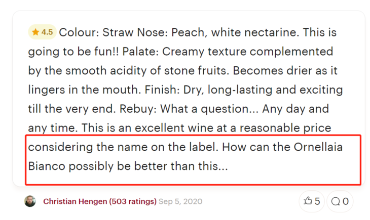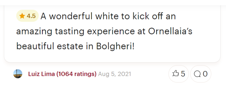 酒友 C:“在保格利这美丽的奥纳亚酒庄内饮用这款高品质的干白,是非常美妙的品鉴体验!”