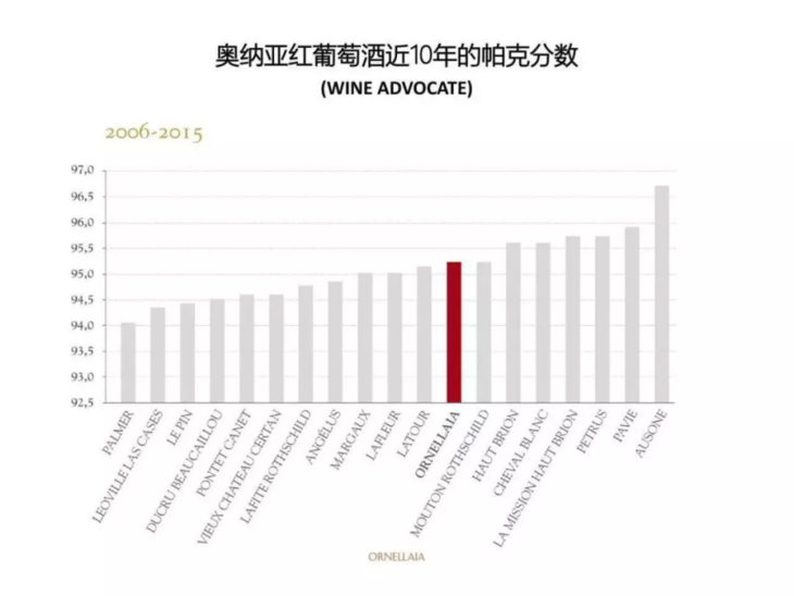 再对比奥纳亚酒庄正牌干红以及波尔多 20 大名庄正牌干红 2006-2015 年份的帕克评分,奥纳亚正牌干红在这 10 年里的帕克平均评分达到了 95.3 分,打败了拉图(Chateau Latour)、拉菲(Chateau Lafite-Rothschild)、玛歌(Chateau Margaux)和金钟(Angelus)等大名庄!
