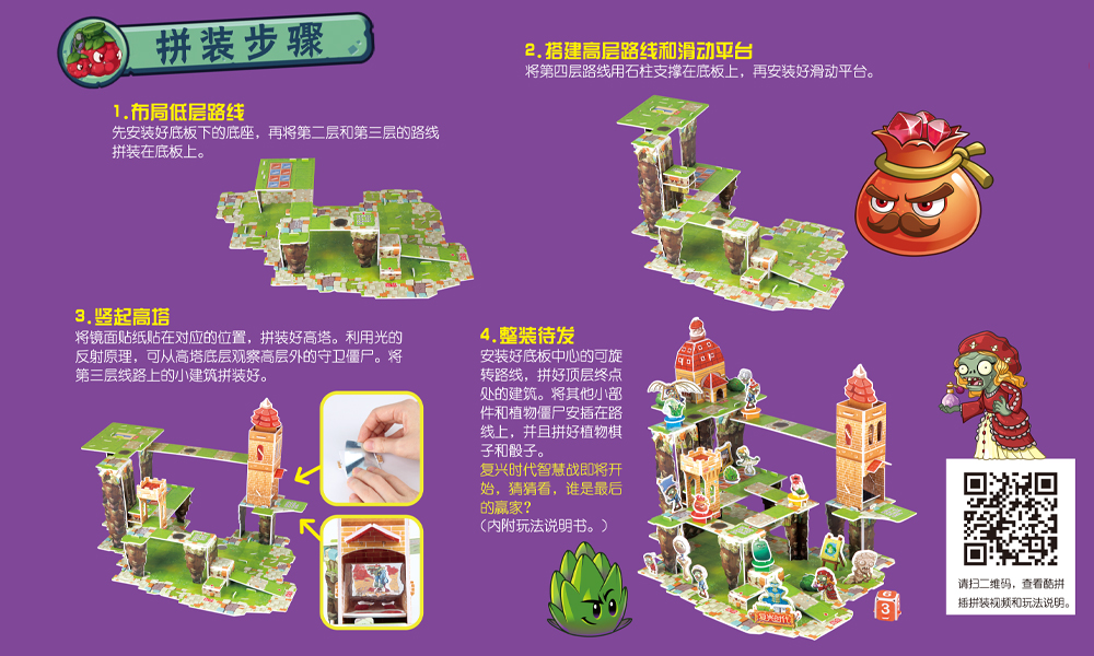 《植物大战僵尸2奇妙时空之旅酷拼插·复兴时代智慧战》是根据风靡全球的电脑游戏“植物大战僵尸2”中的素材设计而成的立体拼插场景。本书利用了素材中复兴时代古城的石砖路和石砖桥搭建起来一个高楼的场景,同时小读者可以在场景中玩斗智斗勇的追逐棋游戏。场景中还有许多小机关,有可以转动的十字路,有可以上升的石台,还有需要通过折射镜观察才能登上的高塔。小朋友们可以在有趣的场景中体验用智慧作战的乐趣。