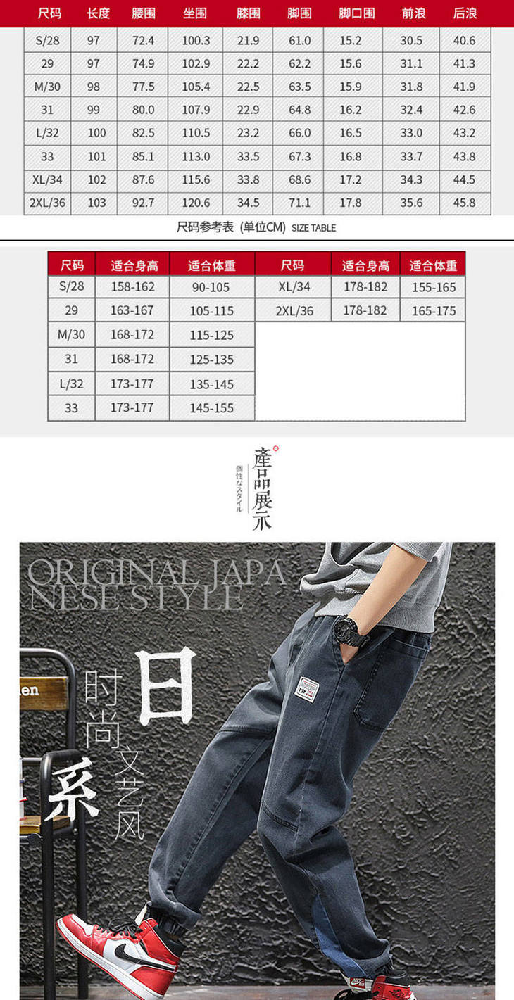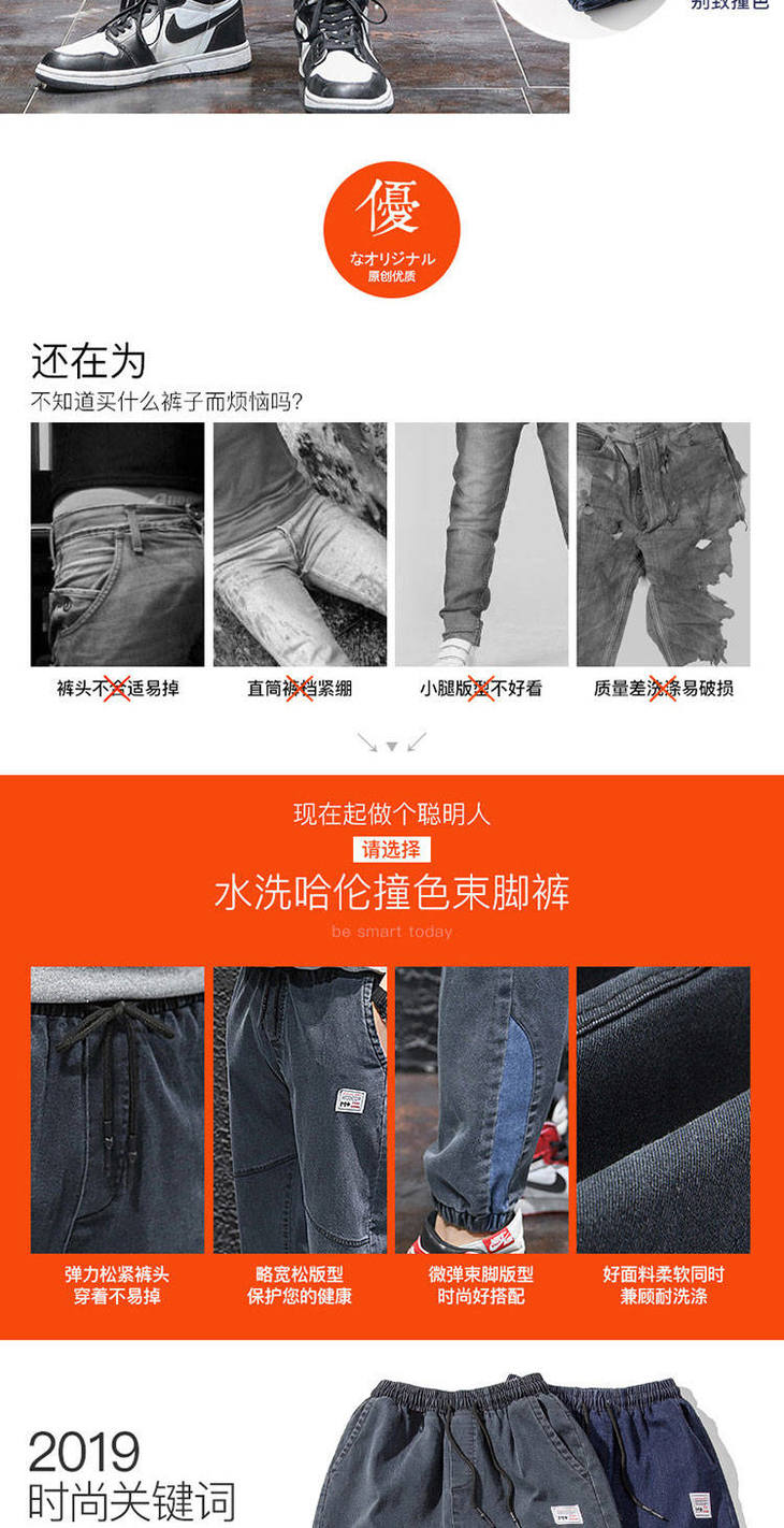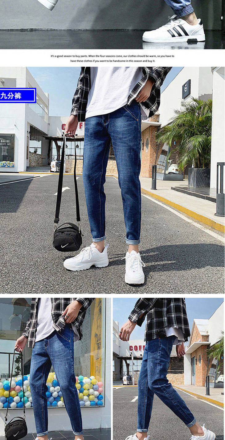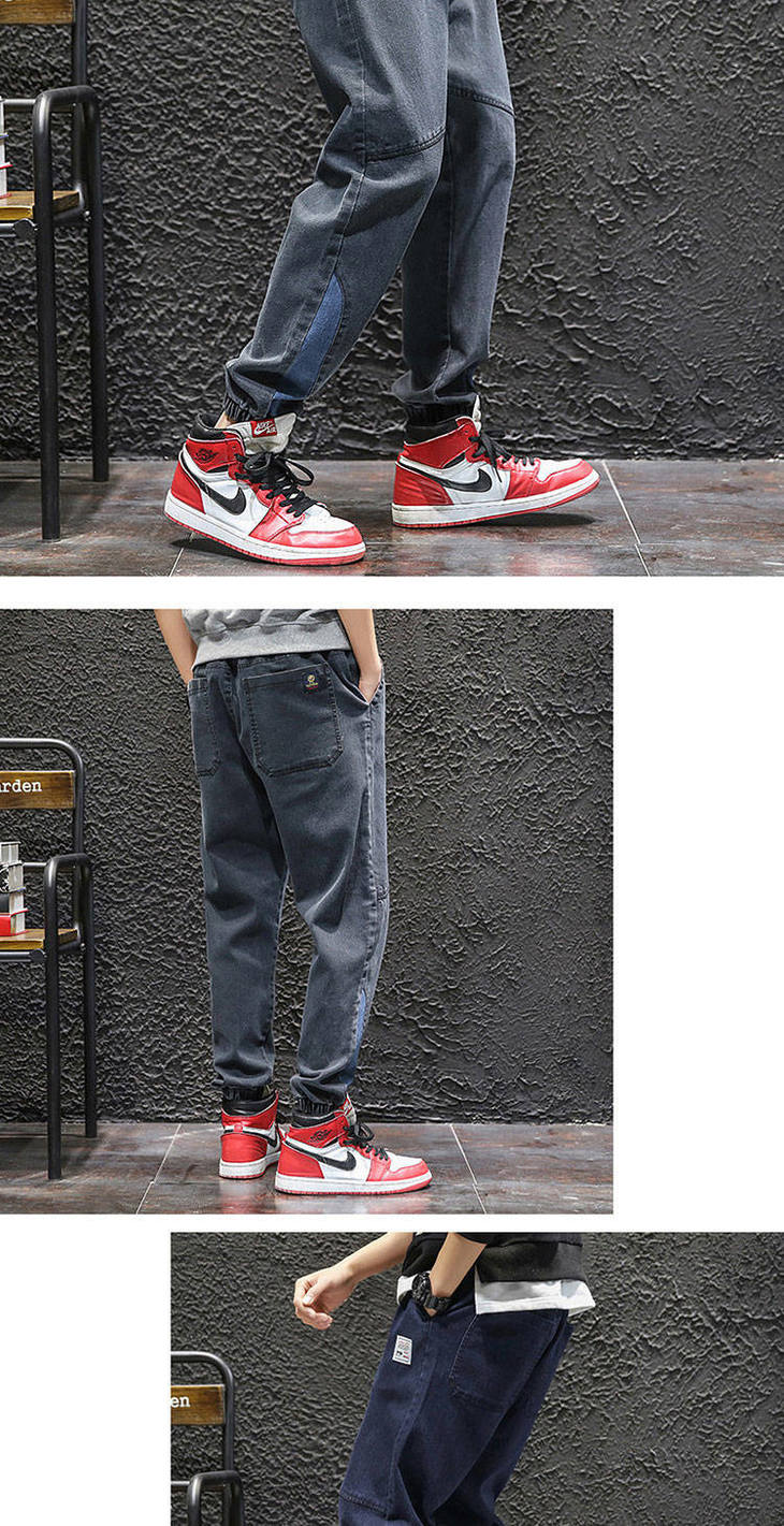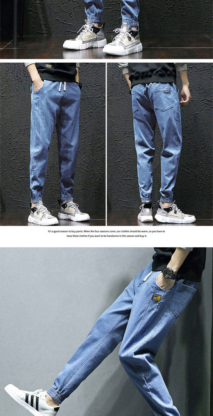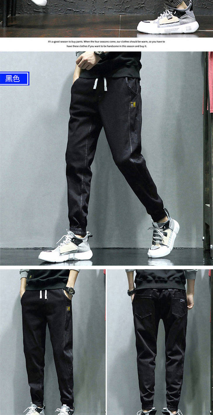秋季弹力宽松牛仔裤男士工装裤哈伦裤大码小脚束脚裤9分裤胖子