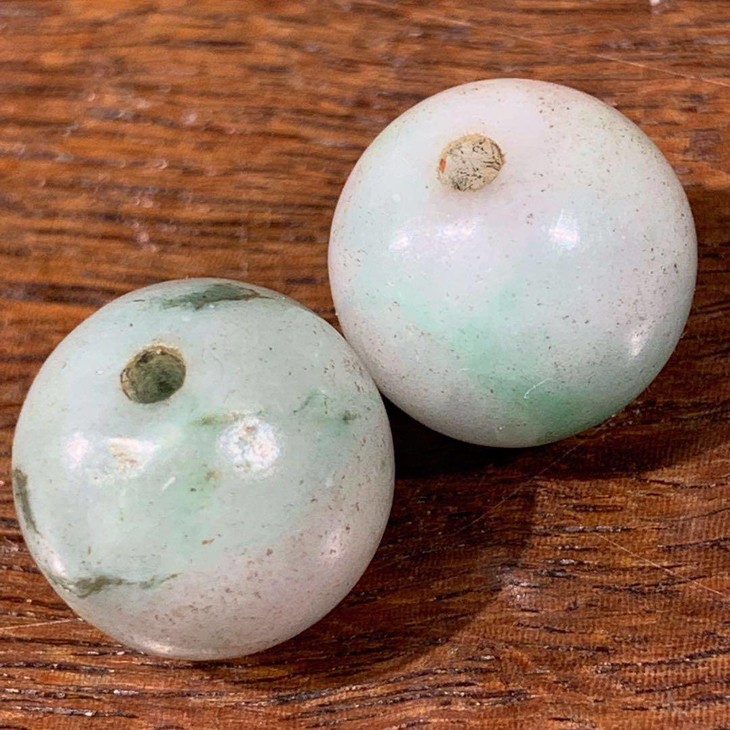这是两粒白底点翠绿的老翡翠圆珠,对孔平切,造型典雅,孔道磨痕清晰可见,是清代遗留下来的老翡翠珠。是一对搭配珠串与首饰,形色皆宜的老珠。