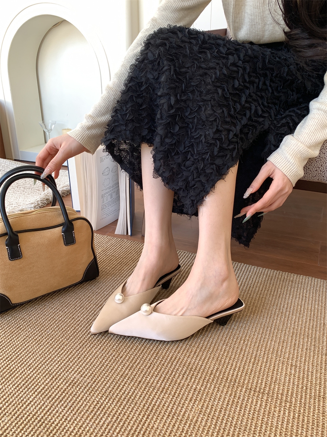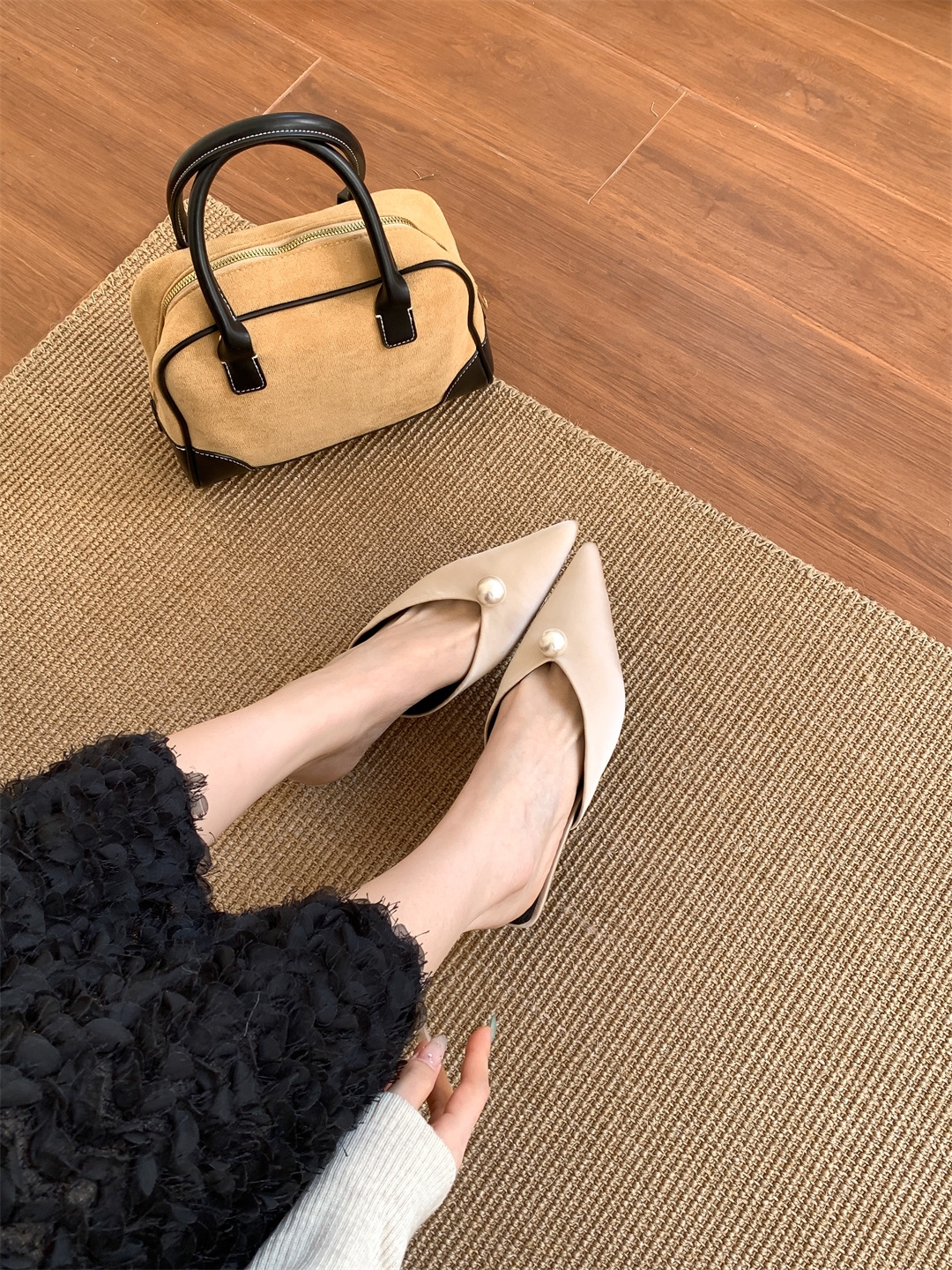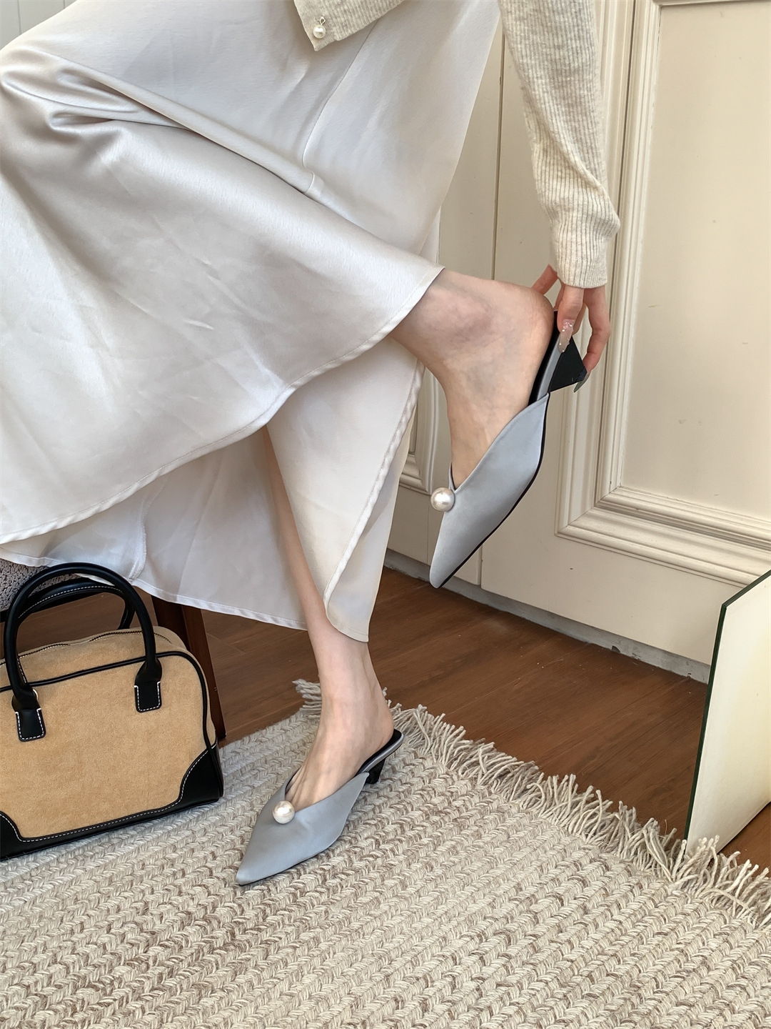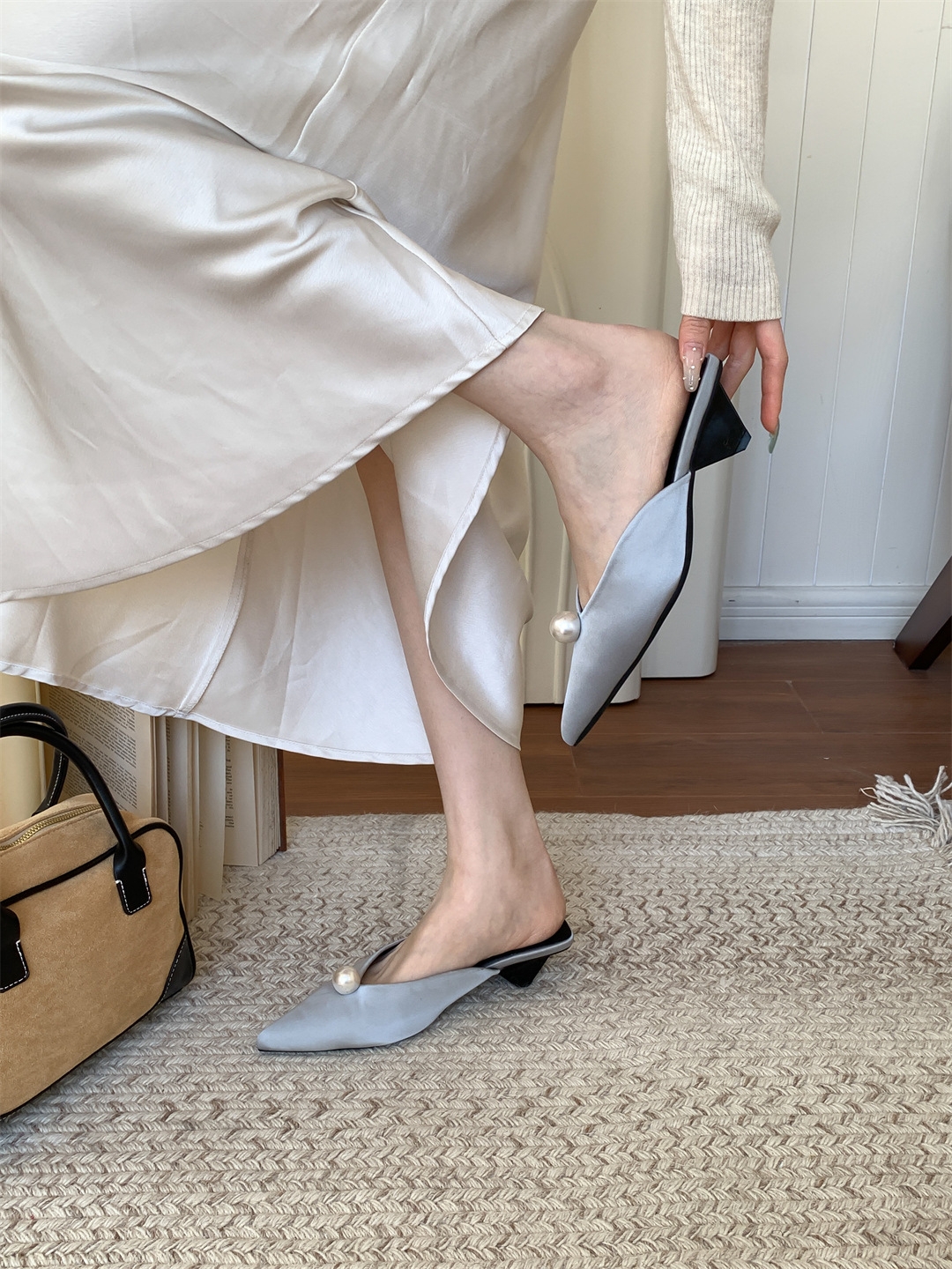 鞋码很正,若脚很胖建议大一码。鞋面是进口醋酸缎面,有密度有厚度很结实,珍珠是施华洛大颗有光泽感,鞋型超新颖,显得脚瘦脚小。搭配牛仔裤,半裙都时髦洋气~尖头+珍珠更有女人味儿~
