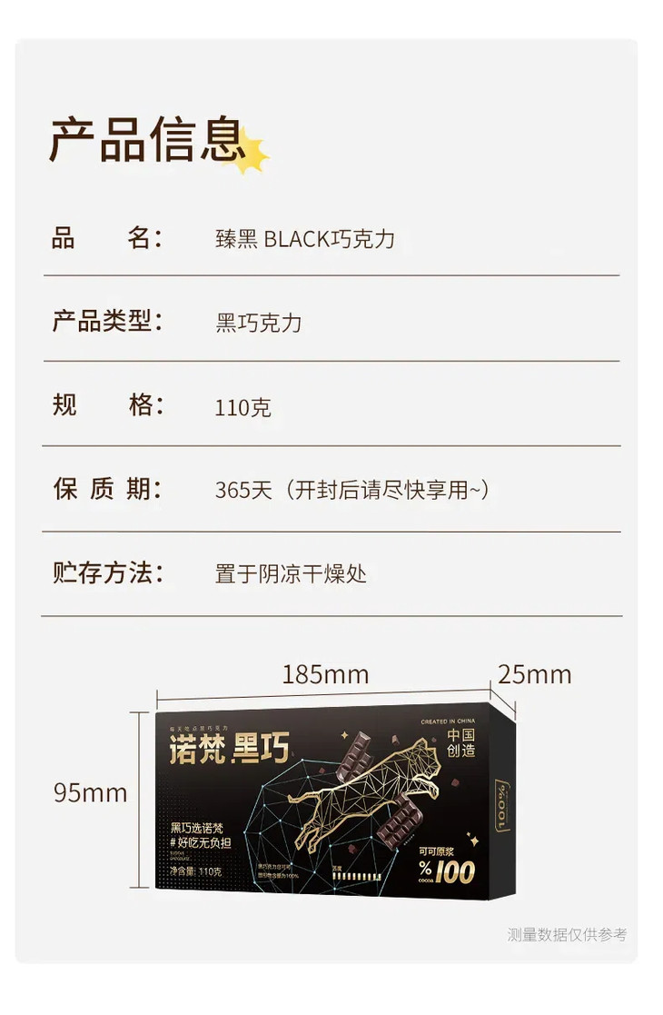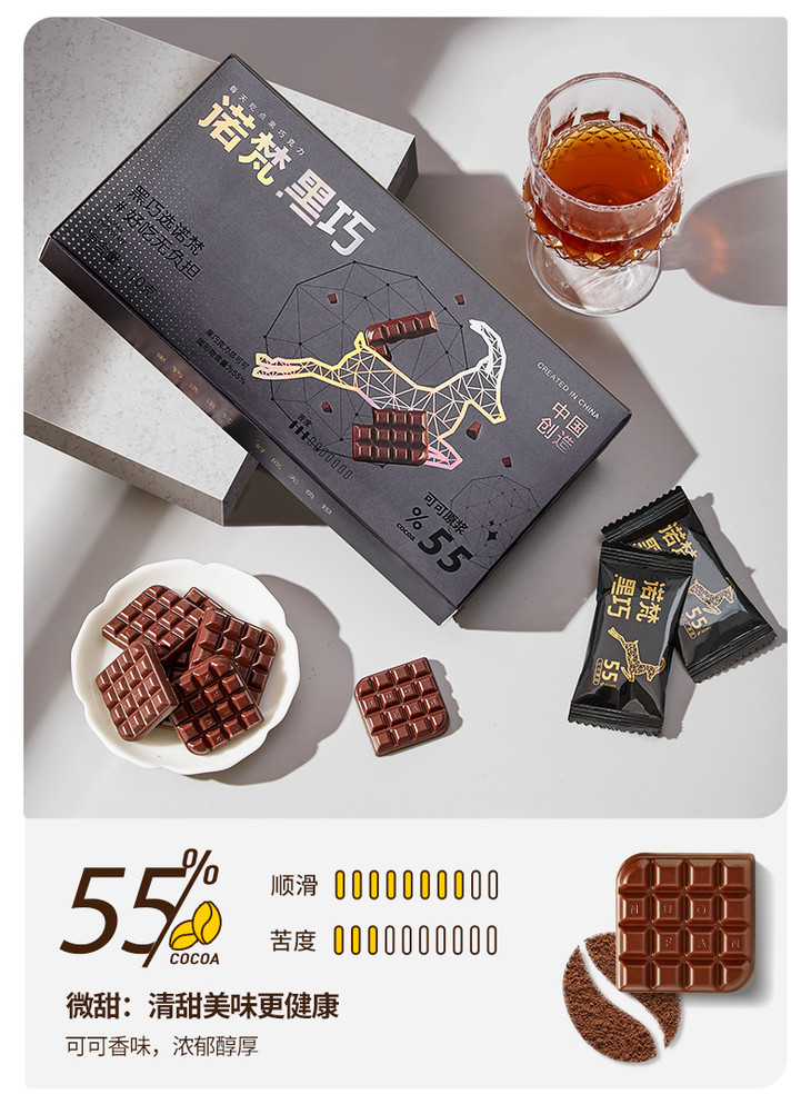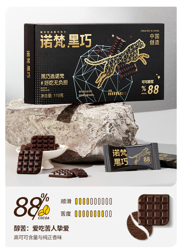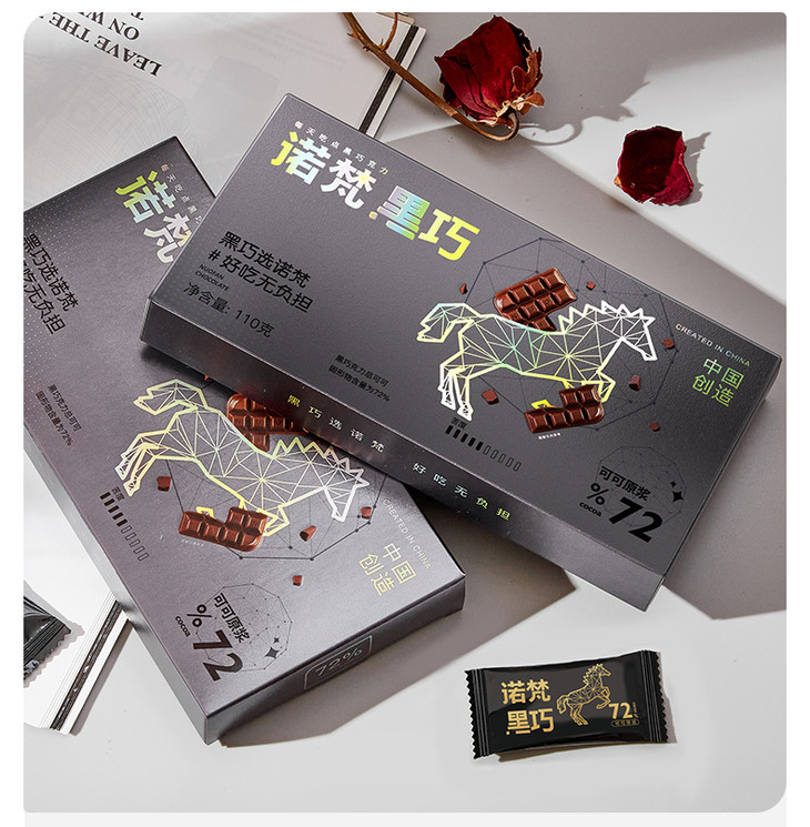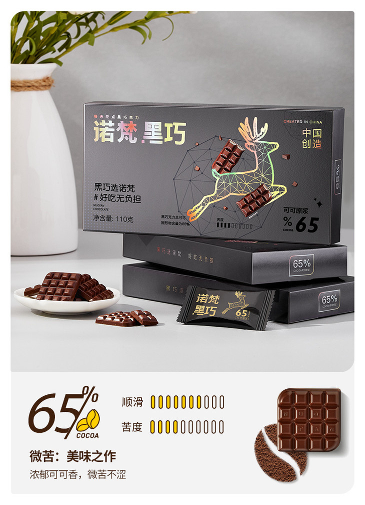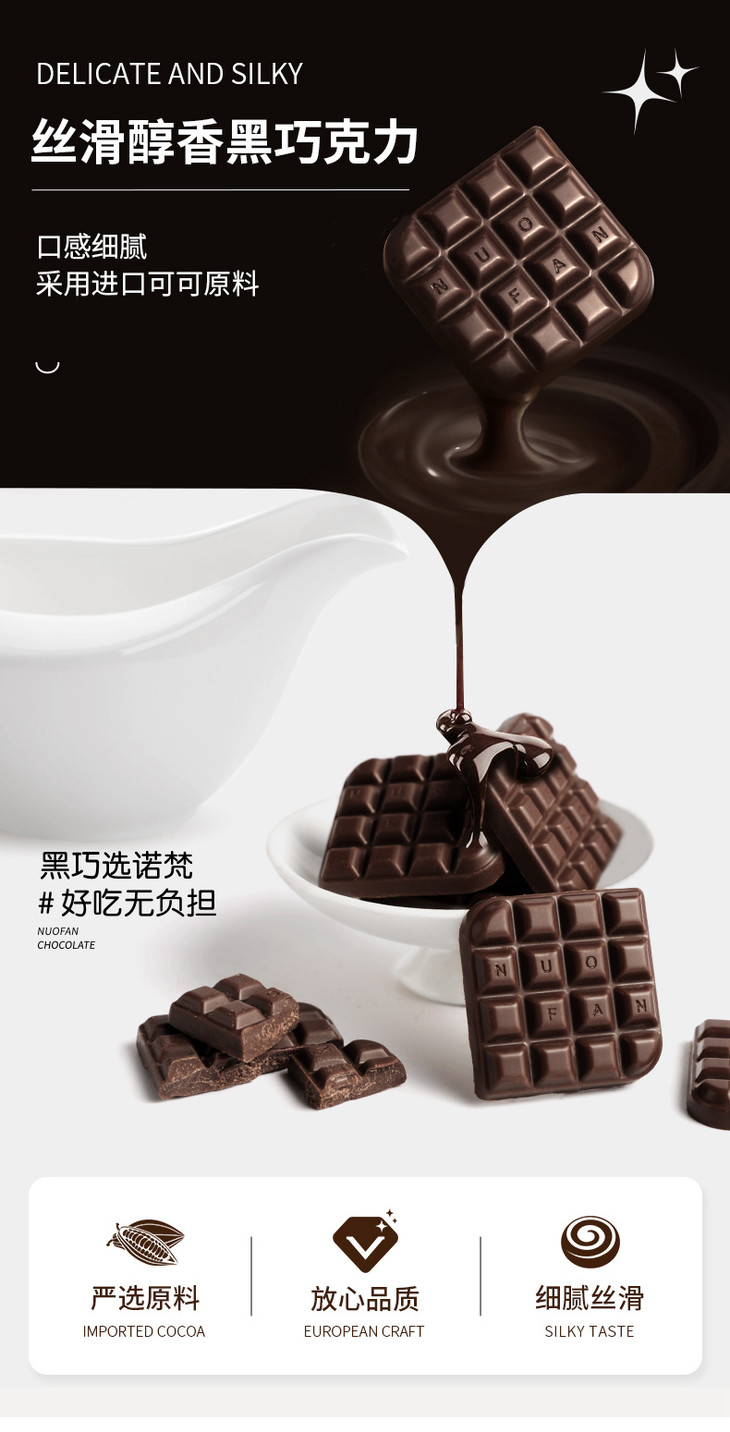 诺梵黑巧的成分很简单,主要就是可可,并根据不同含量增加少量的糖。品牌严选四大产区高质量西非加纳可可豆,经过德国与瑞士进口高端自动化生产线,19道工序精磨,72小时精炼,让每一颗巧克力都散发出可可豆特有的清香!