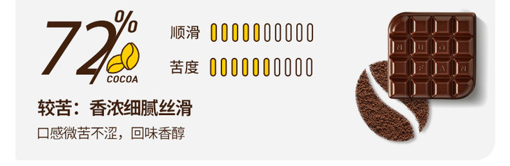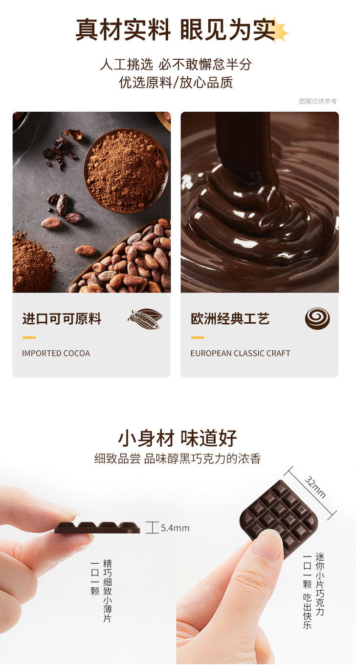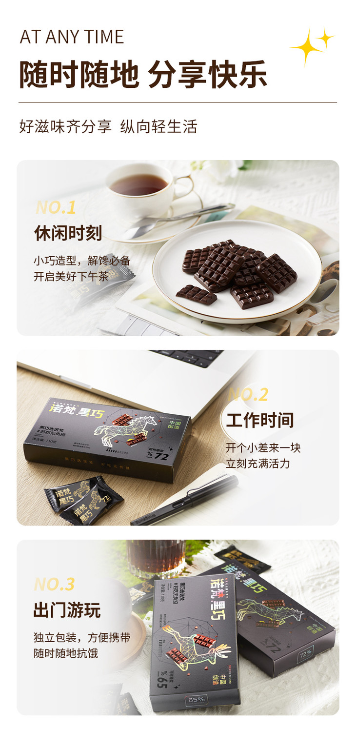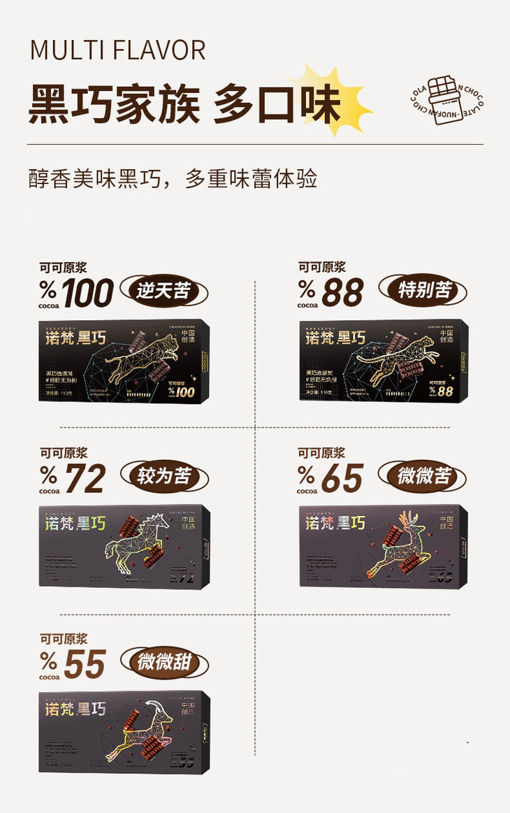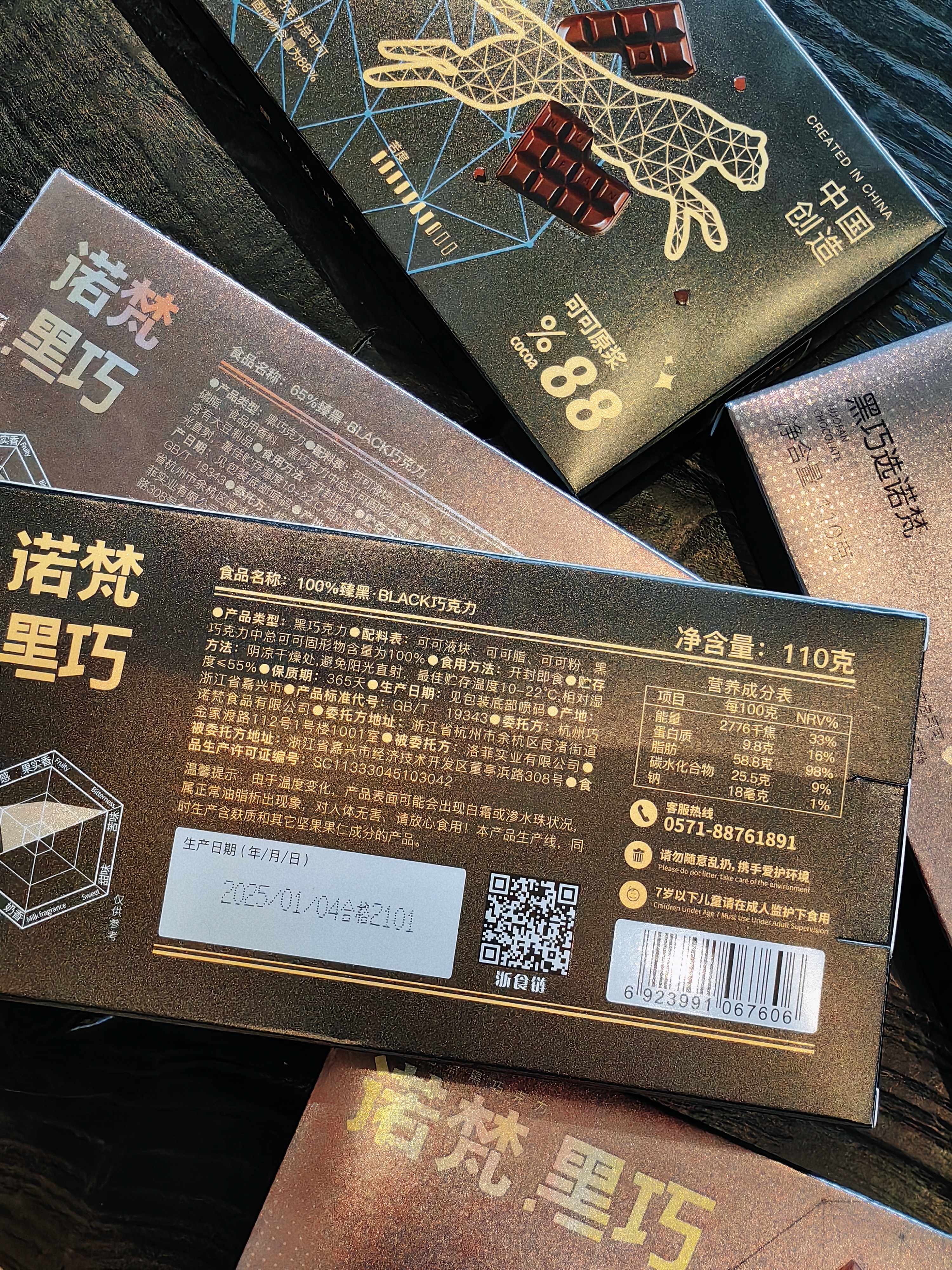 诺梵黑巧的成分很简单,主要就是可可,并根据不同含量增加少量的糖。品牌严选四大产区高质量西非加纳可可豆,经过德国与瑞士进口高端自动化生产线,19道工序精磨,72小时精炼,让每一颗巧克力都散发出可可豆特有的清香!