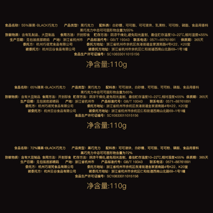 黑巧都是纸盒装,每盒110g,都是独立小包装,方便携带,可可脂含量也分5种,从55%到100%,比例越高,口感越苦,能够满足不同口味需求。我是都留了,想甜的时候能甜,想苦的时候比谁都能吃苦!口感真的出乎意料的好,入口即化,丝滑无比。55%入口微甜,浓醇香甜;65%是纯正黑巧的醇香,甜苦均衡;72%苦味带着回甘;88%是黑巧人的挚爱,高可可脂含量,但巧克力香味又很纯正;100%浓度适合健身人,醇香逆天,苦感十足!大家可以根据自己吃“苦”的能力随心选哦!