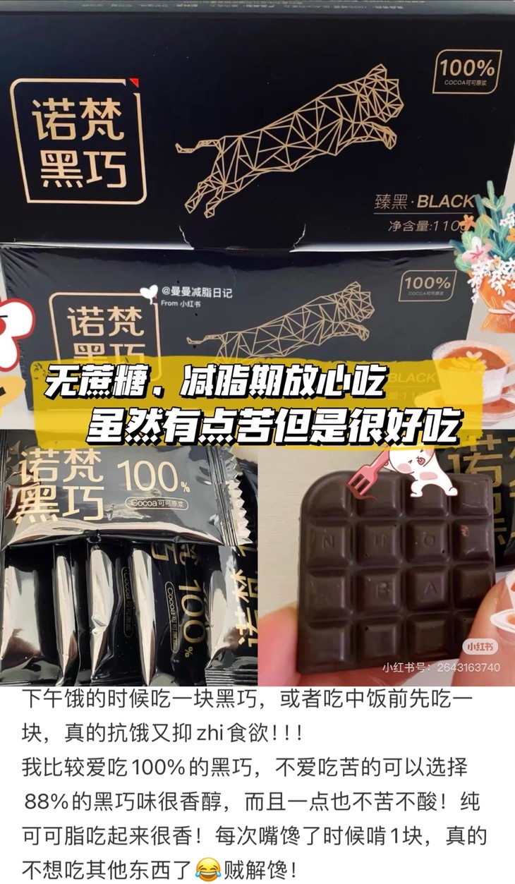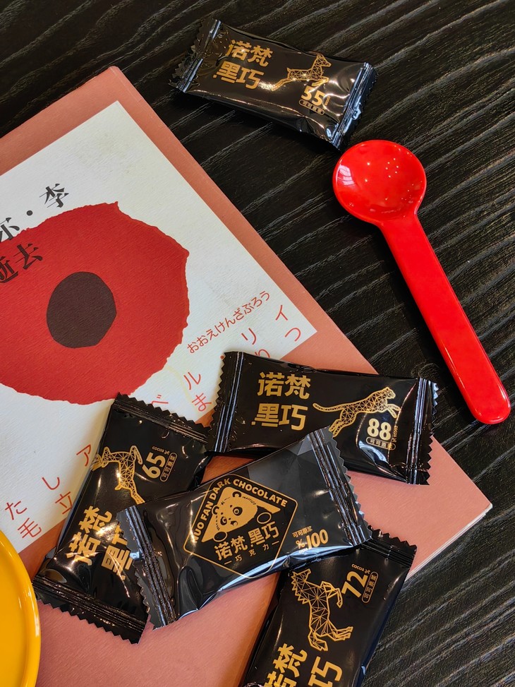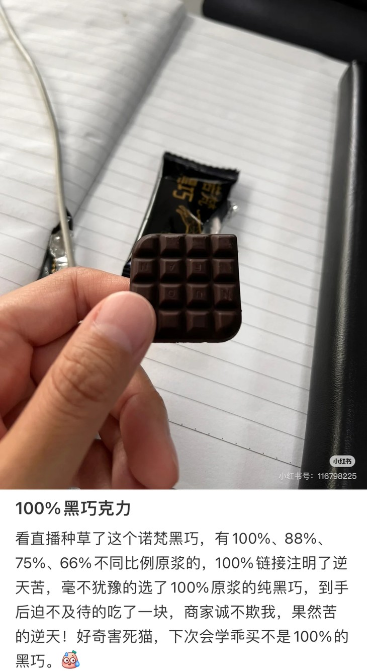 诺梵纯可可脂黑巧克力,我其实收到很久很久了,但之前没听说过,就一直懒得试,后来被朋友安利,才知道是国内做巧克力做比较好的,一吃,真不戳!是有真正可可香的,有小时候巧克力的味道,原浆含量还从55%到100%,可以换着吃,连纯黑也并不会难以下咽哎,我蛮喜欢的!