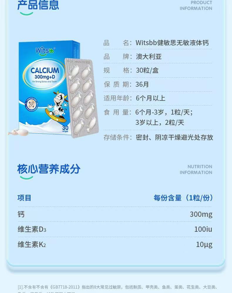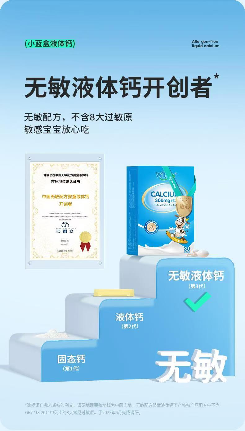 Witsbb健敏思小蓝盒液体钙胶囊30粒/盒含K2无敏宝宝钙营养
