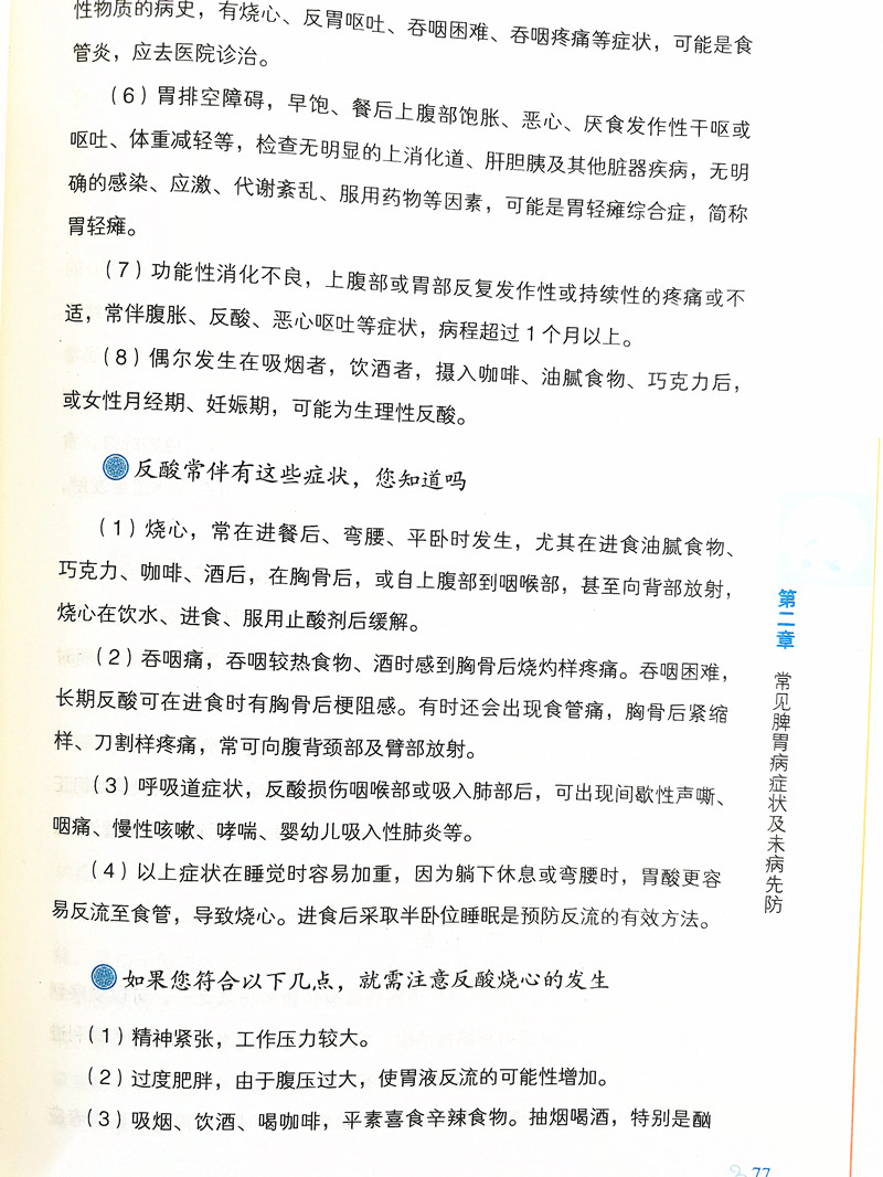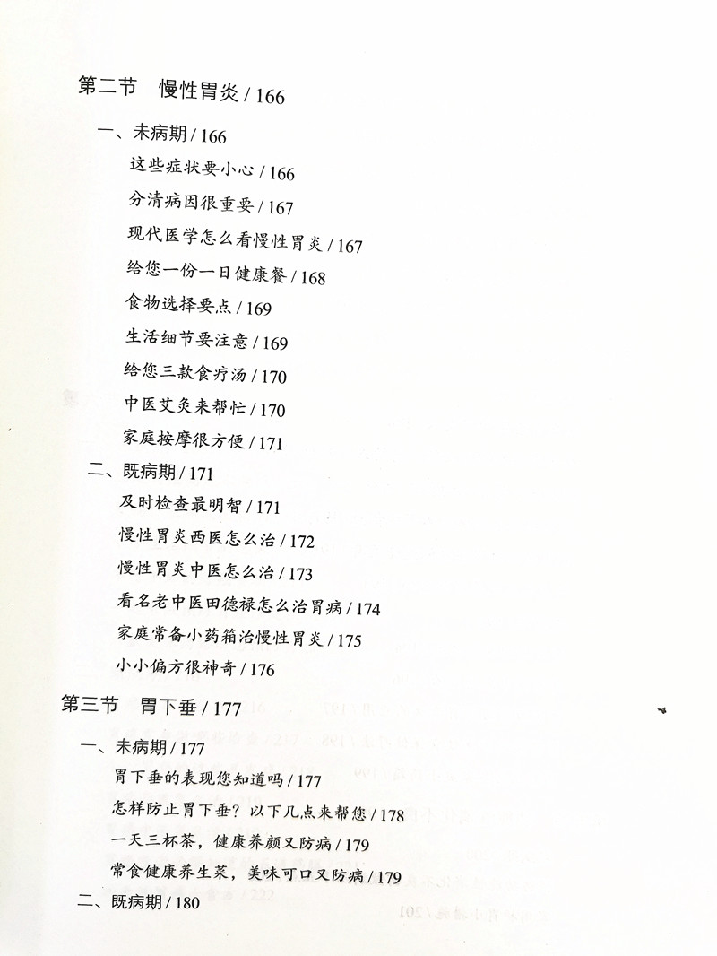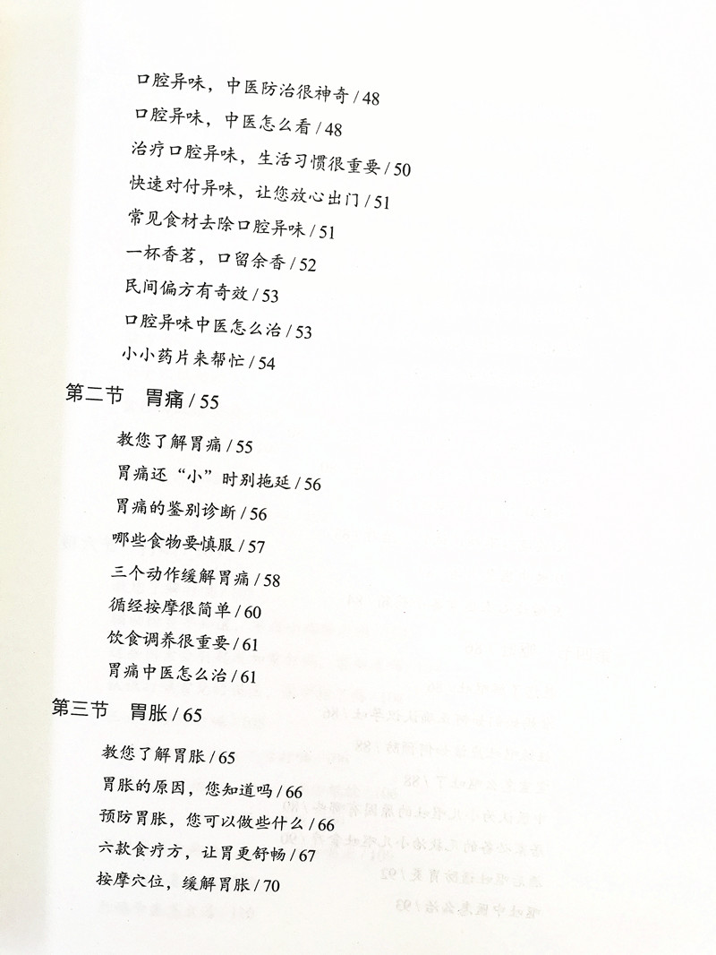 本书分为三章,第一章“脾胃疾病与中医防治”,分别论述脾胃疾病及中医未病先防、既病防变的主要概念,中医的“脾胃”与现代医学的“脾、胃”区别,脾胃与五脏之间的关系及四季调养脾胃方法等。第二章介绍在脾胃疾病还未形成时期,或形成的早期和中期,临床上很多患者都会出现的如口中异味、胃胀、胃痛、恶心反胃、腹痛、腹泻、便秘等看似很普通的不适症状。其实,这些症状无疑是身体对脾胃疾病发出的警笛声,但常被患者和医生忽视,错过了最佳的调治时机。因此,本书将脾胃疾病的常见症状独设一章,分为十节,分别论述了口腔异味、胃痛、胃胀、呕吐、恶心反胃、打嗝、腹痛、腹泻、便秘等常见脾胃症状的中西医发病原因及机制、调理原则、调理方法。在调理方法中,从生活起居、食疗、运动、按摩、针灸、推拿、音乐、药枕、中医辨证方药等多方面进行调摄,使大众尽早发现身体发出的预警信号,及时调理,预防脾胃疾病的发生或在疾病的早期康复。第三章论述了如急性胃炎、慢性胃炎、胃溃疡、功能性消化不良、急性肠炎、慢性结肠炎、习惯性便秘等常见的十二种脾胃疾病在未病期的预警信号、预防原则、预防方法;在既病期的基本症状、诊断依据、常规检查、治疗原则、西医常规治疗、中医辨证治疗、其他非药物治疗方法等。内容广泛涉及饮食、方药、针灸、按摩、气功、运动、穴位敷贴精神调摄等多方面,取法自然而副作用少,价廉、有效,集防病、治病、康复保健于一体,内容通俗易懂,可操作性强。