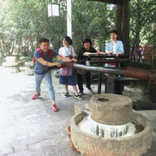 双语体验师讲解各种川菜原料加工工具,认识工具名称与用途,了解古人的聪明智慧,激发小朋友的创造性。使用清代的石碓窝舂制辣椒面,小朋友亲手磨豆浆,体验制作手工石磨豆花,还可以现场品尝~