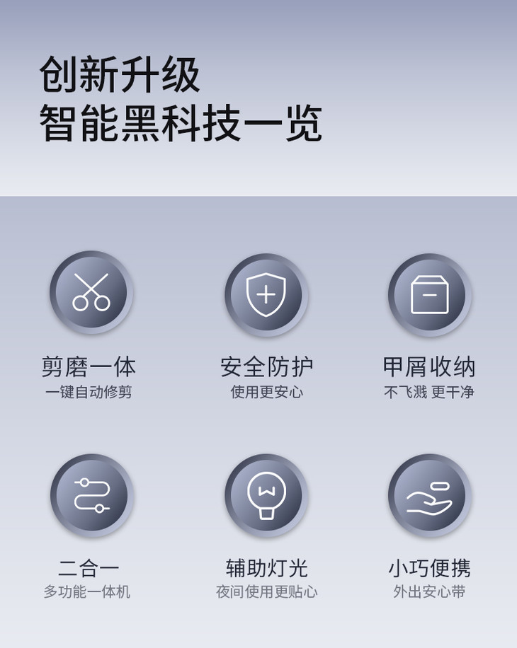 细节设计也十分贴心。内置的指甲屑收集仓,将剪下的指甲碎屑全部收纳,最后一按一倒,就能干净省心。夜间照明功能更是贴心,光线明亮但不刺眼,即使在黑暗环境中,也能清晰看到指甲细节,眼睛不是很好的老人,也能轻松操作!