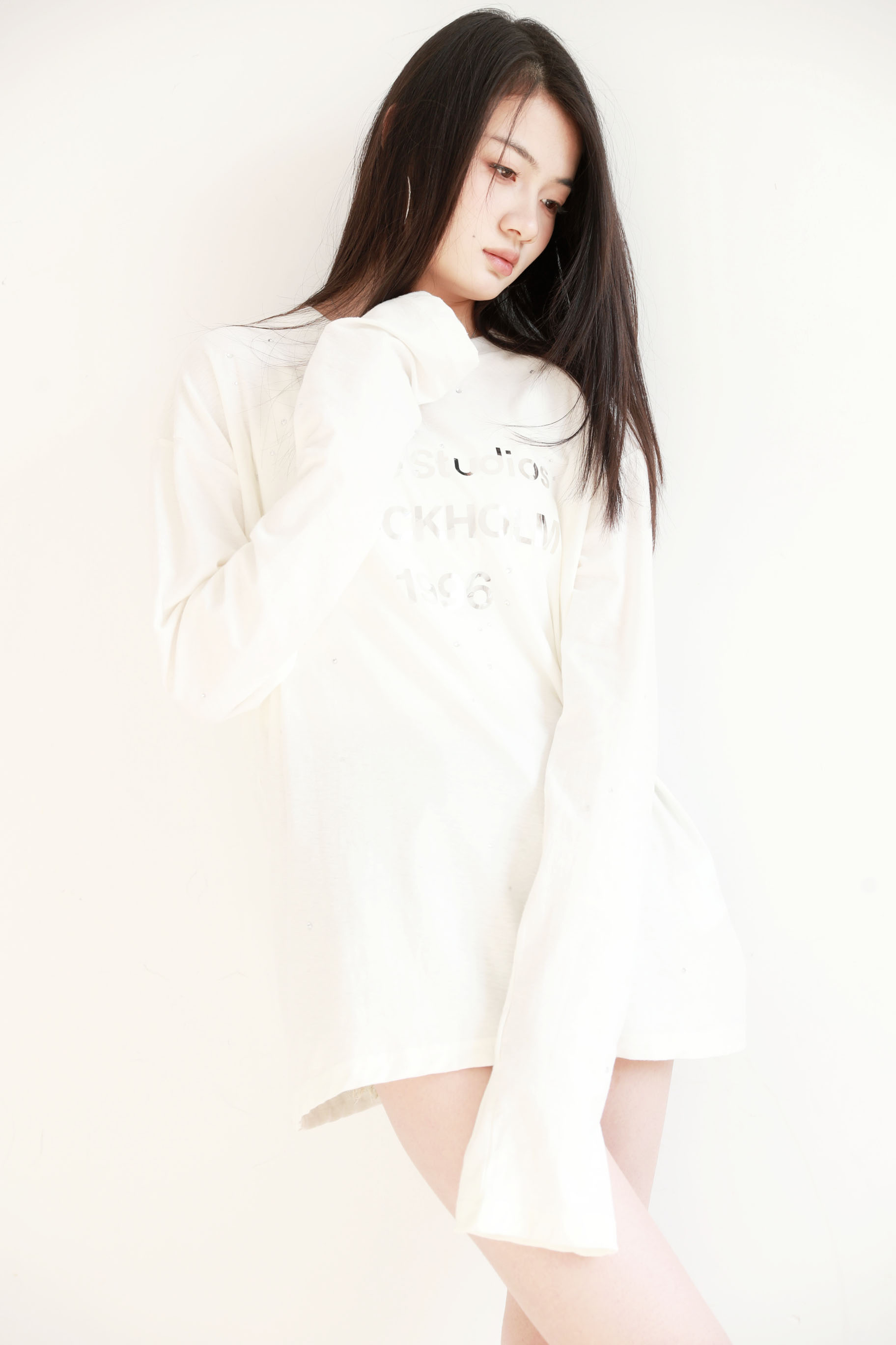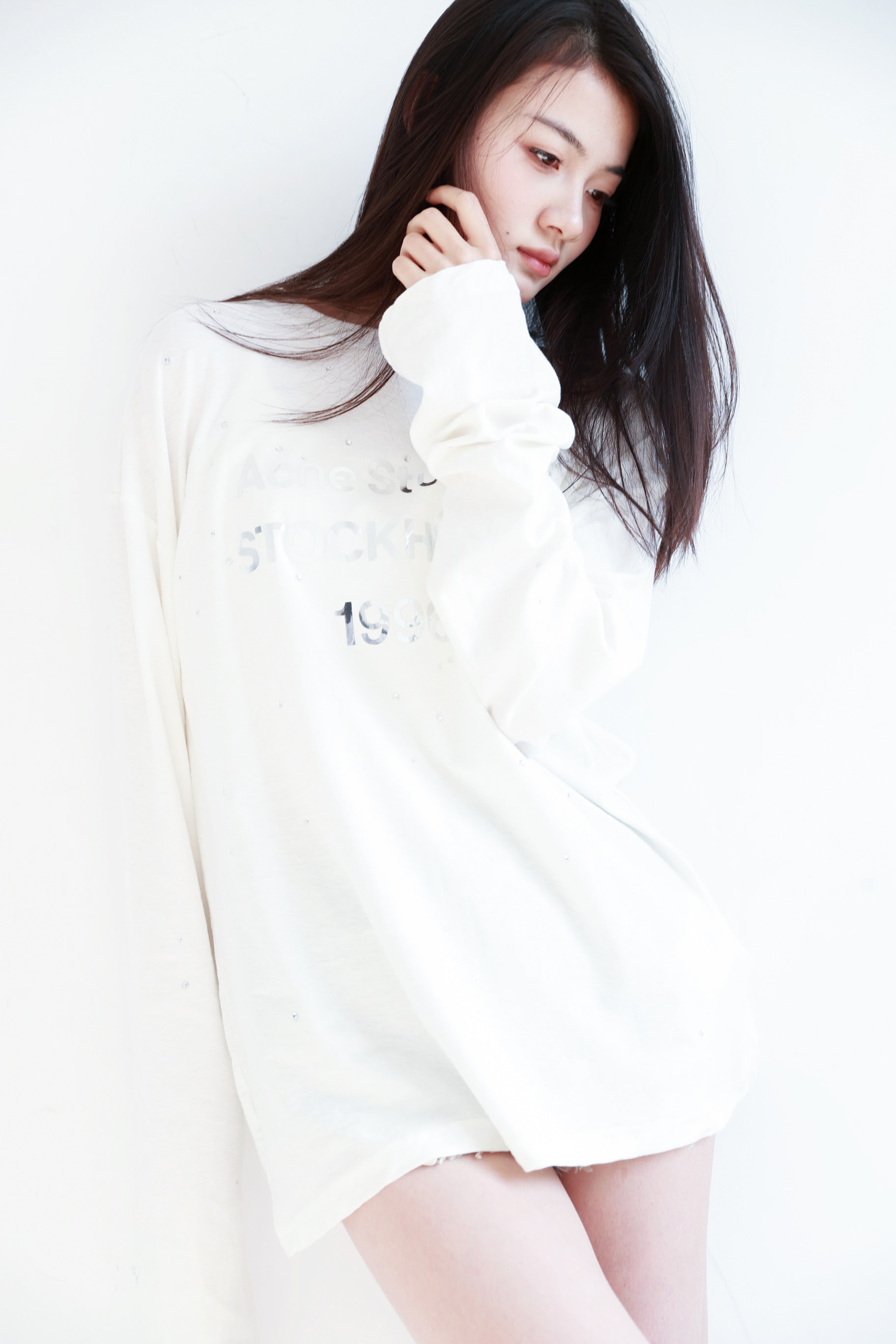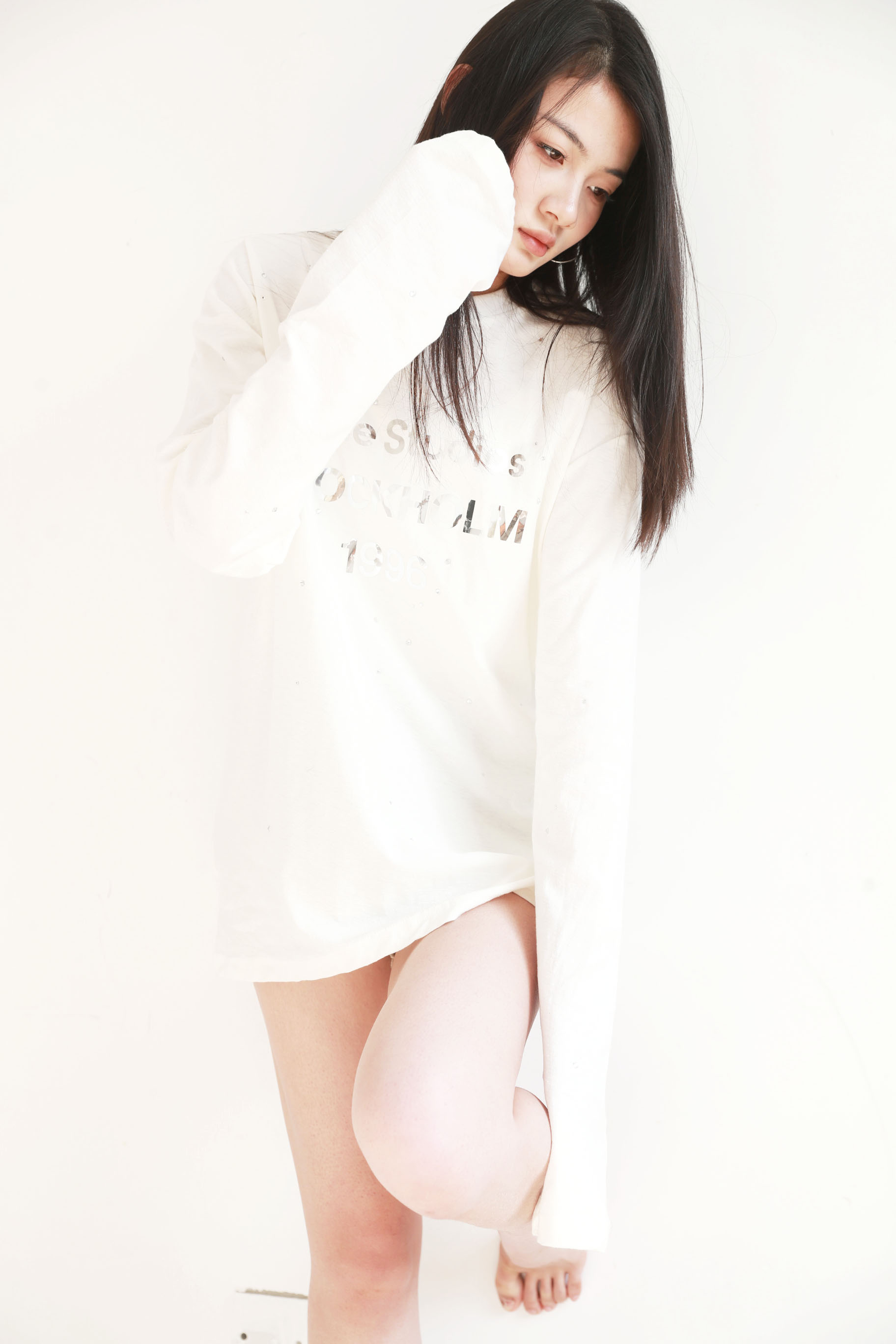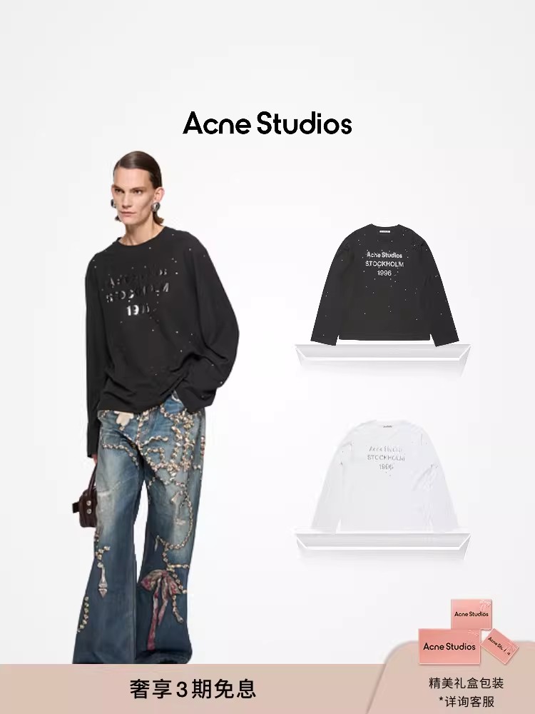 亮面闪钻tee,做旧字母长袖。正肩宽松设计情侣款圆领上衣E010866