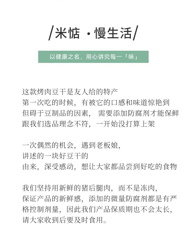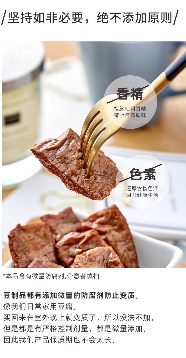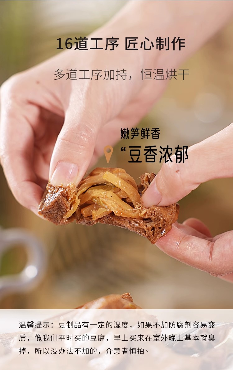 温馨小提示:产品没有添加色素和香精,但因为豆制品有一定的湿度容易变质,所以有添加一丢丢的防腐剂以保证产品新鲜。但因为加的量非常的少,所以保质期仅90天,请大家收到后尽快食用。