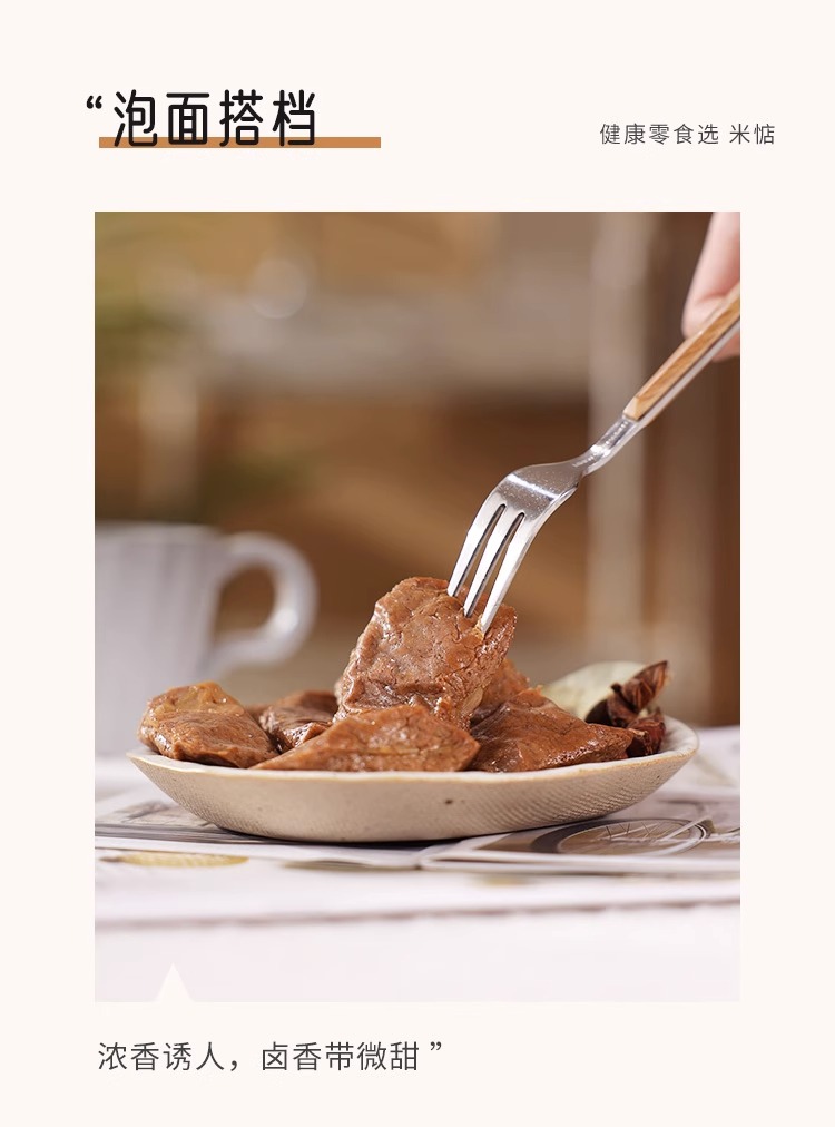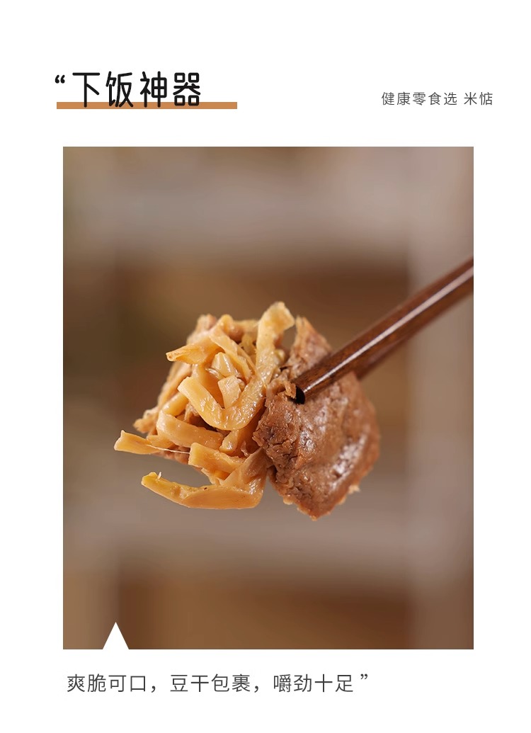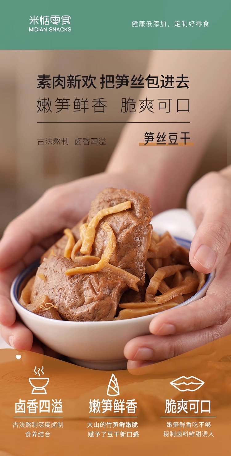 米惦的笋丝豆干精选“大山”竹笋以及优质黄豆,闺蜜肉干则是大豆蛋白、新鲜猪后腿肉和鹌鹑蛋卤制。两款豆干都是经过16道工序加持,古法熬制深度卤制入味,再通过恒温烘干定型,制作时没有加香精和色素,都是纯纯的食材本味,制作完成的豆干使用无菌真空封袋后,高温二次除菌,吃起来更安心!