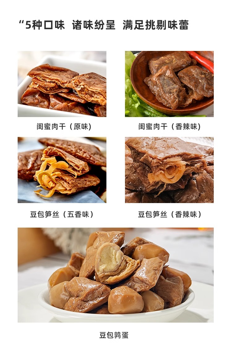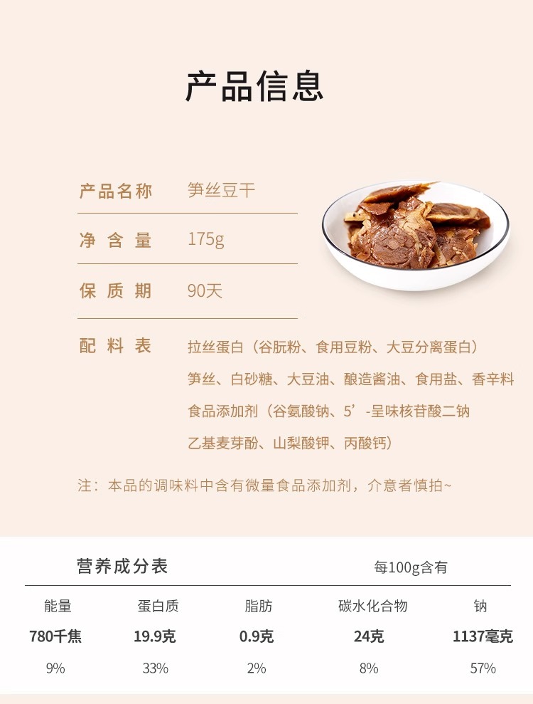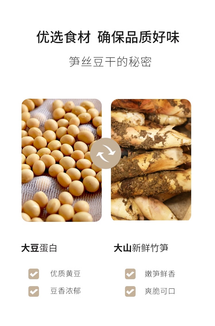 两款豆干都是高蛋白的小零嘴,竹笋中含有较高的纤维、植物蛋白、维生素及微量元素,豆干则含有丰富蛋白质和多种矿物质,每一块都是独立包装,携带方便,一口一个,能解馋,能抗饿,还能当零食和配饭,日常扔些在包里随时享受快乐!
