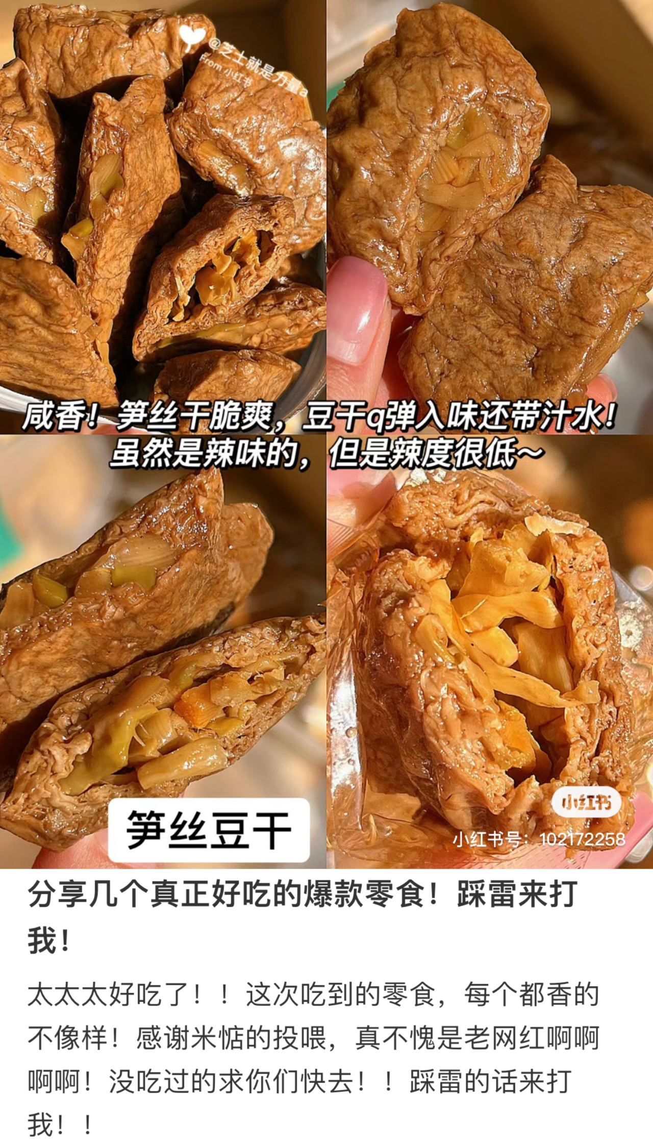 笋丝豆干,是软中带点嚼劲,明明是豆类制品,咬下却是把肉肉撕拉开的质感,更绝的是中间夹了笋丝,吃起来很爽口,饱满实在,豆干和脆笋在齿间迸裂,口感很有层次!不吃辣的老粉可以认准五香味,略略偏甜一丢丢但胜在不重口,香辣口味会更咸鲜且刺激味蕾,对于川渝人来说也并不算很辣。