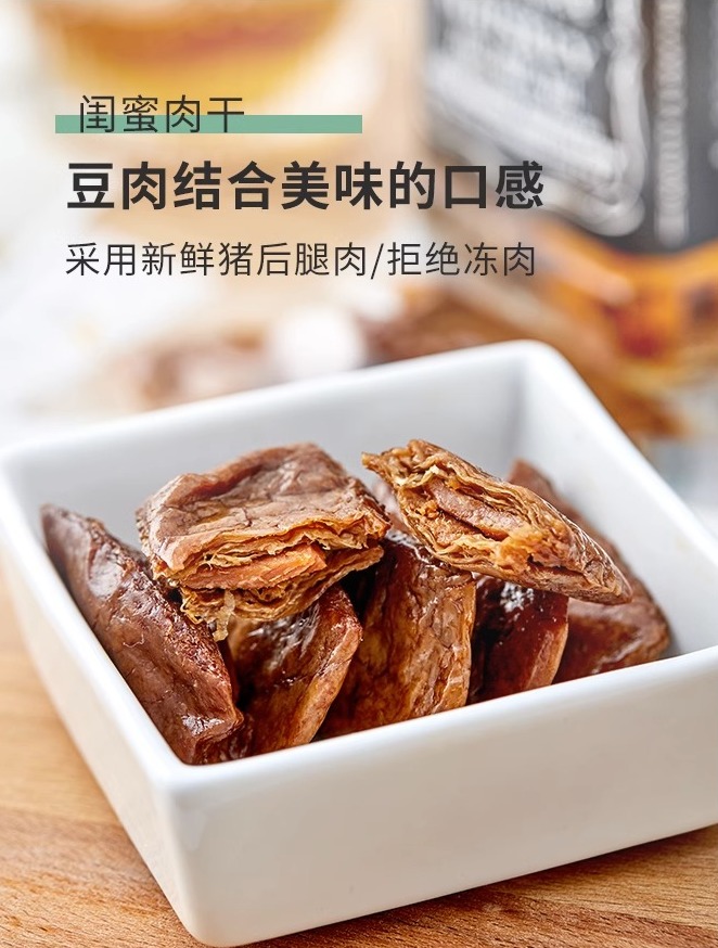 闺蜜肉干,鲜、香、甜、辣互相交织,每一口咀嚼都可以感受到豆干吸收了满满的卤汁香,既有豆干的Q弹,又有嚼劲的柔韧感,产生了一种奇妙而均衡的口感,浸入纤维的卤汁味儿吊出肉的鲜香,越嚼越香的浓郁味道真的让人欲罢不能!