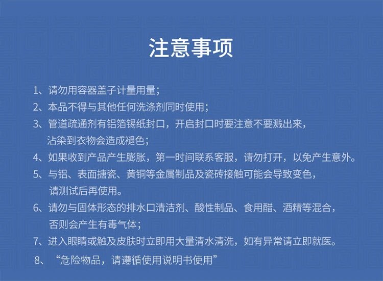 为了让疏通效果更好,建议睡前将它倒入需要疏通的位置,静置到第二天效果最佳。