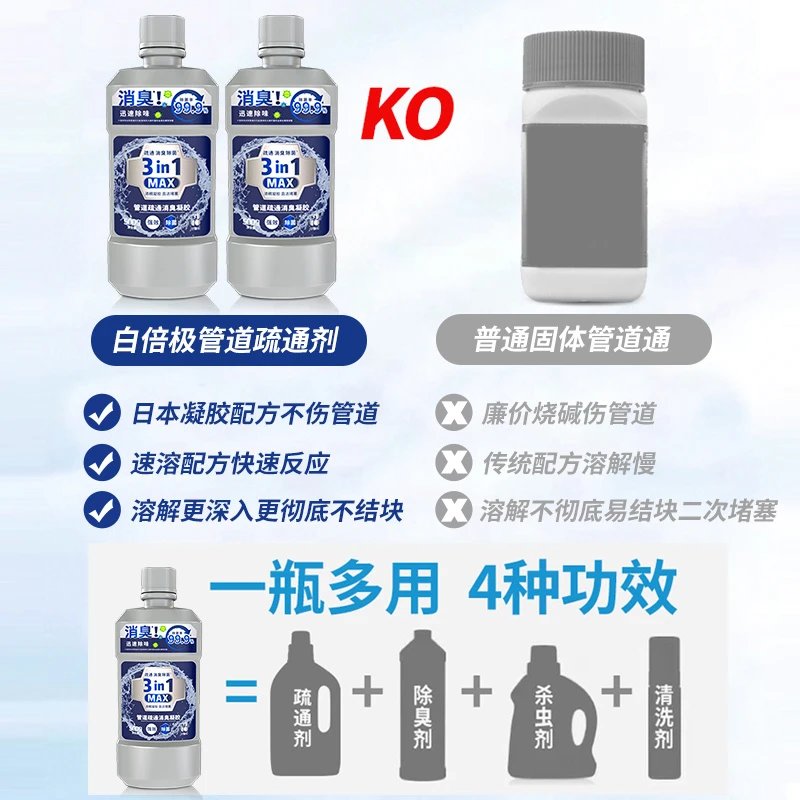 到手3瓶/5瓶❗️【白倍极管道疏通消臭凝胶500g/瓶】一瓶顶疏通、消臭、养护、杀虫✅迅速直达堵塞处,溶解菜叶饭渣和毛发,超强粘着度✅无异味,使用更安全放心!