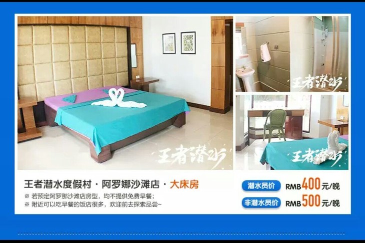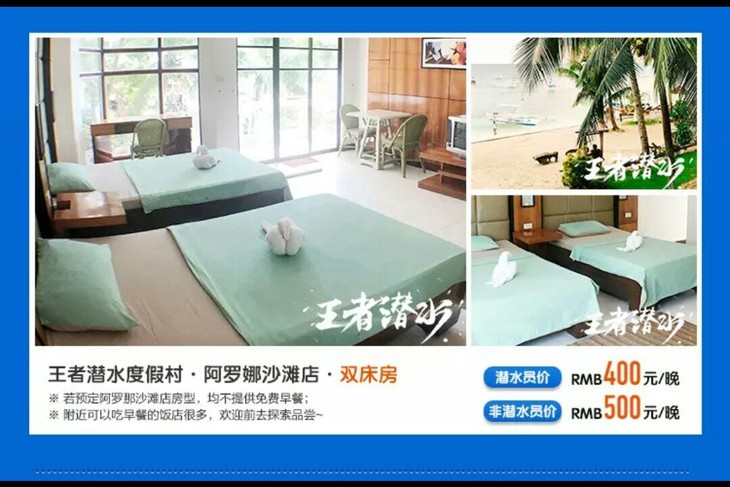 王者潜水潜店是PADI认证的五星级潜水度假村,也是DAN认证的潜水中心,同时也是scuba pro,Halcyon,Sunnto等品牌的代理商。度假村内设有泳池,10间客房,环境优雅,温馨整洁,不定期会安排团体自助餐。